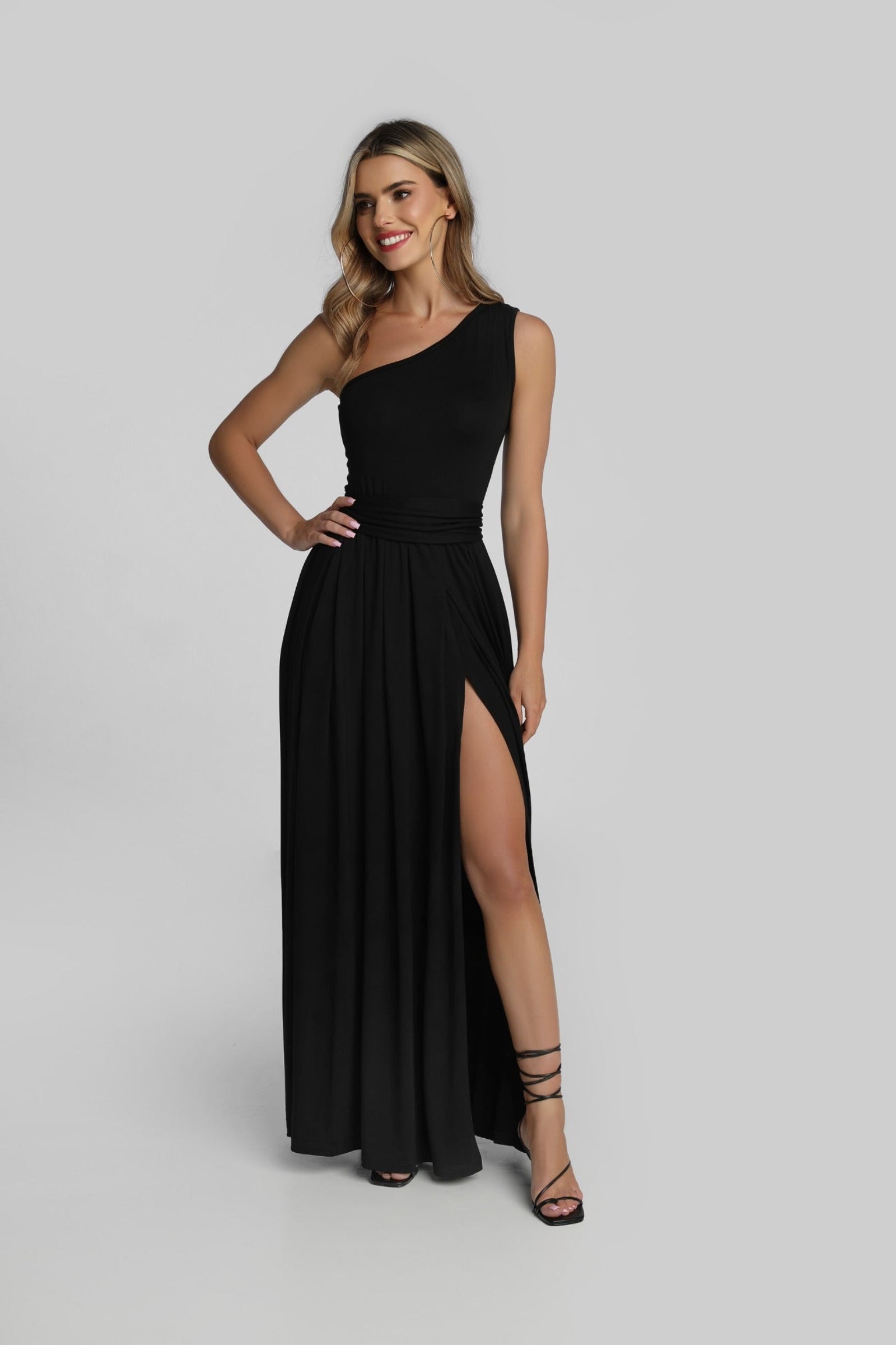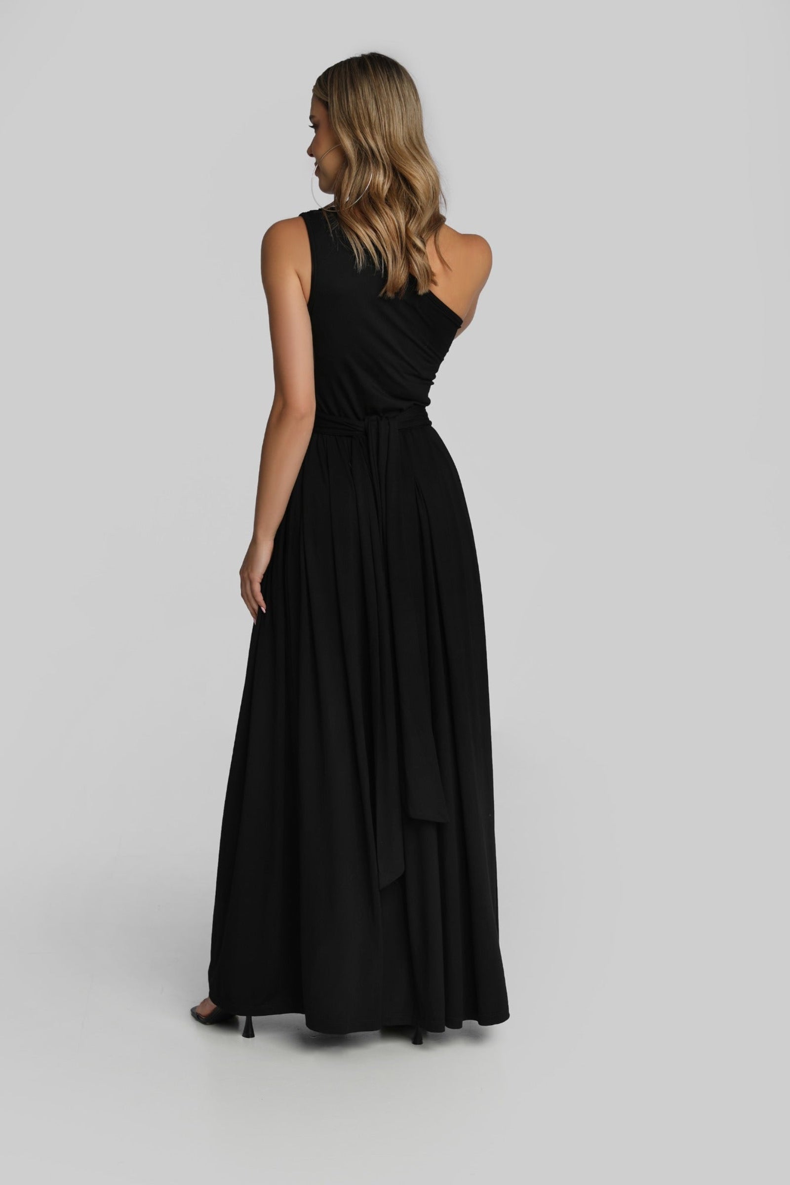 Sukienka maxi na jedno ramię z rozcięciem z przodu, dzięki któremu sukienka nabiera niepowtarzalnej lekkości w ruchu. Sukienka ma kieszenie w szwach bocznych (wiemy, że kochasz kieszenie!)