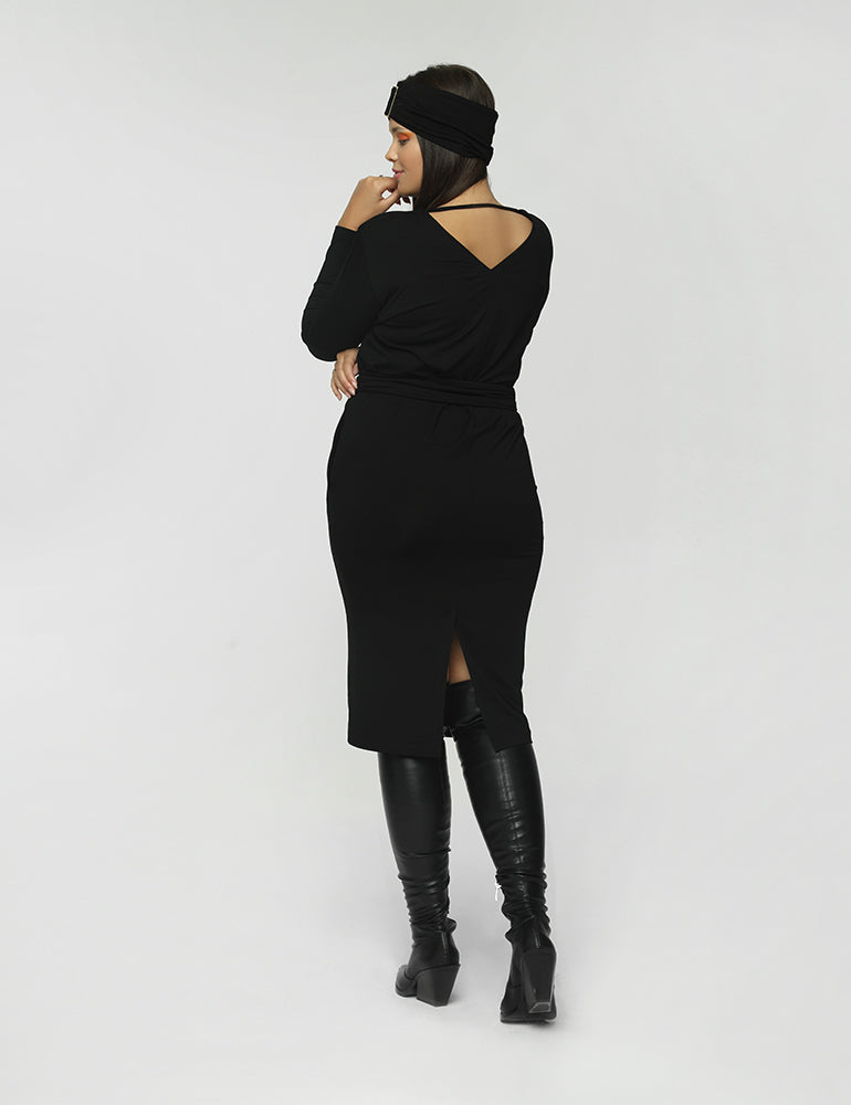 Sukienki o długości midi z rozcięciem z tyłu. Sukienka ma dekolt w kształcie litery V z przodu i z tyłu, ramiona wzmocnione wkładami barkowymi oraz pasek w zestawie.