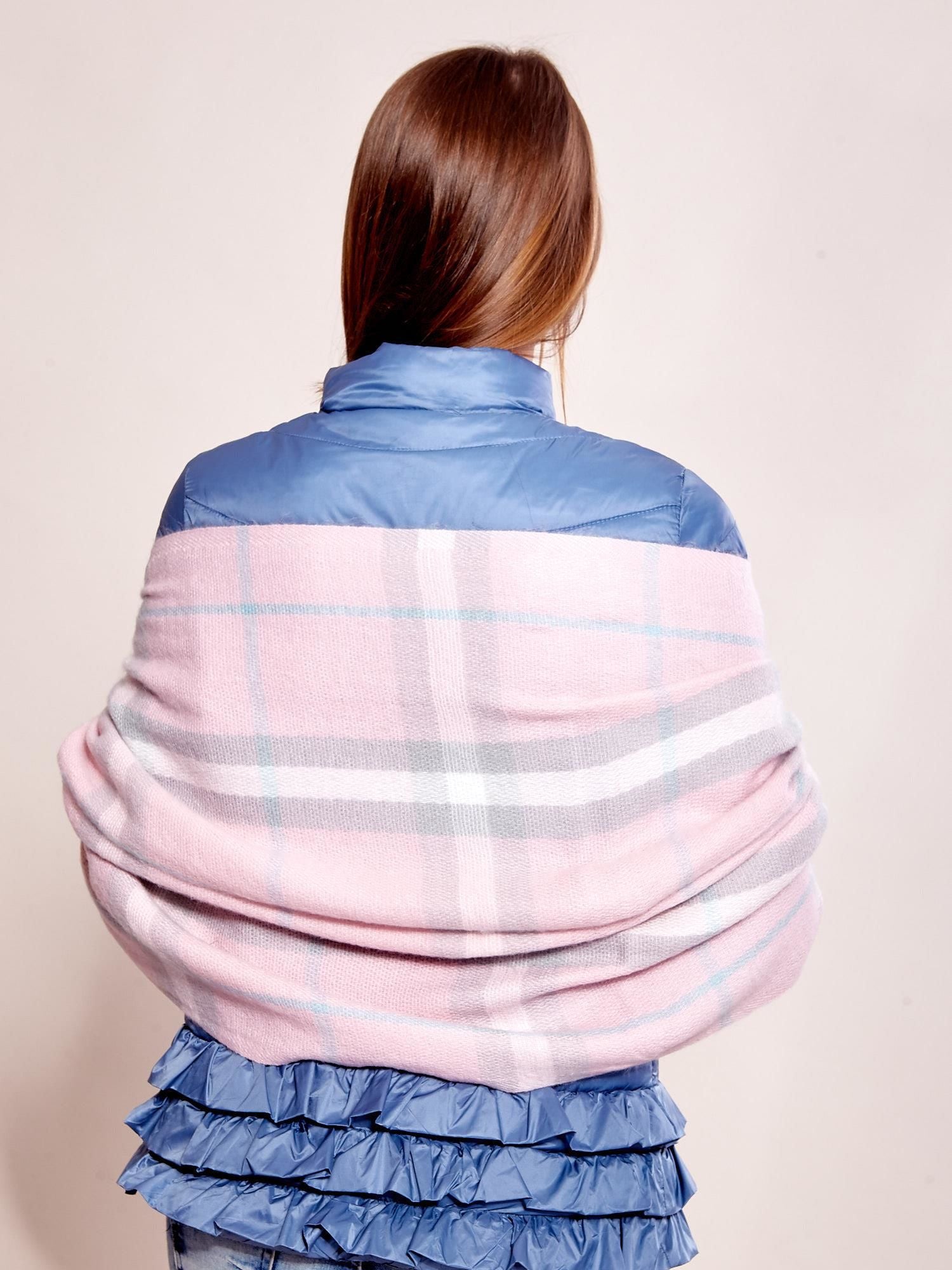 Różowy szal w kratę z frędzlami