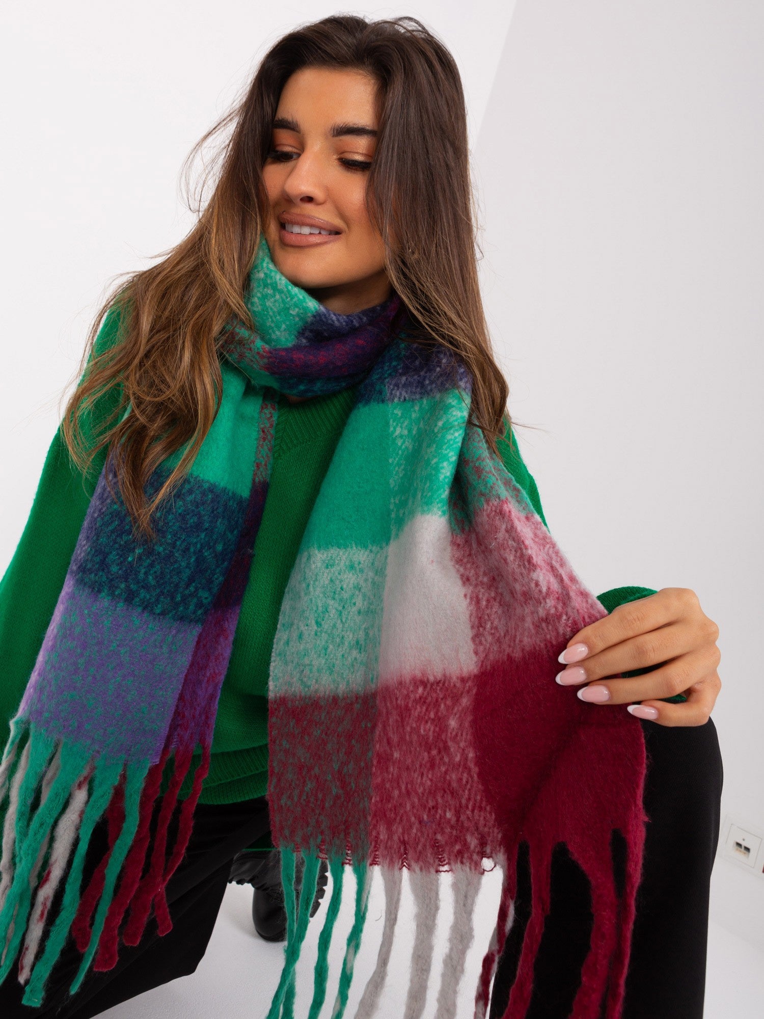 Fioletowo-bordowy szal zimowy z frędzlami .