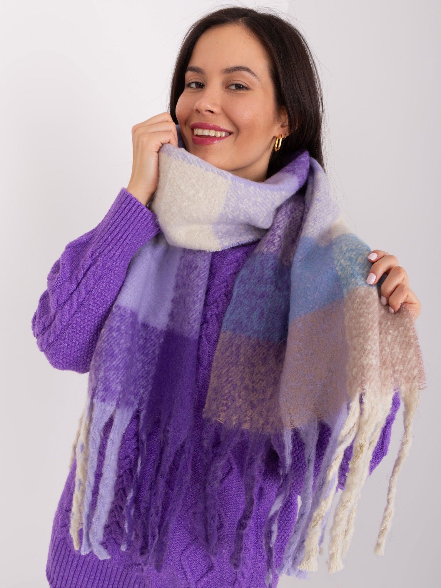 Fioletowo-beżowy długi szal zimowy w kratę .