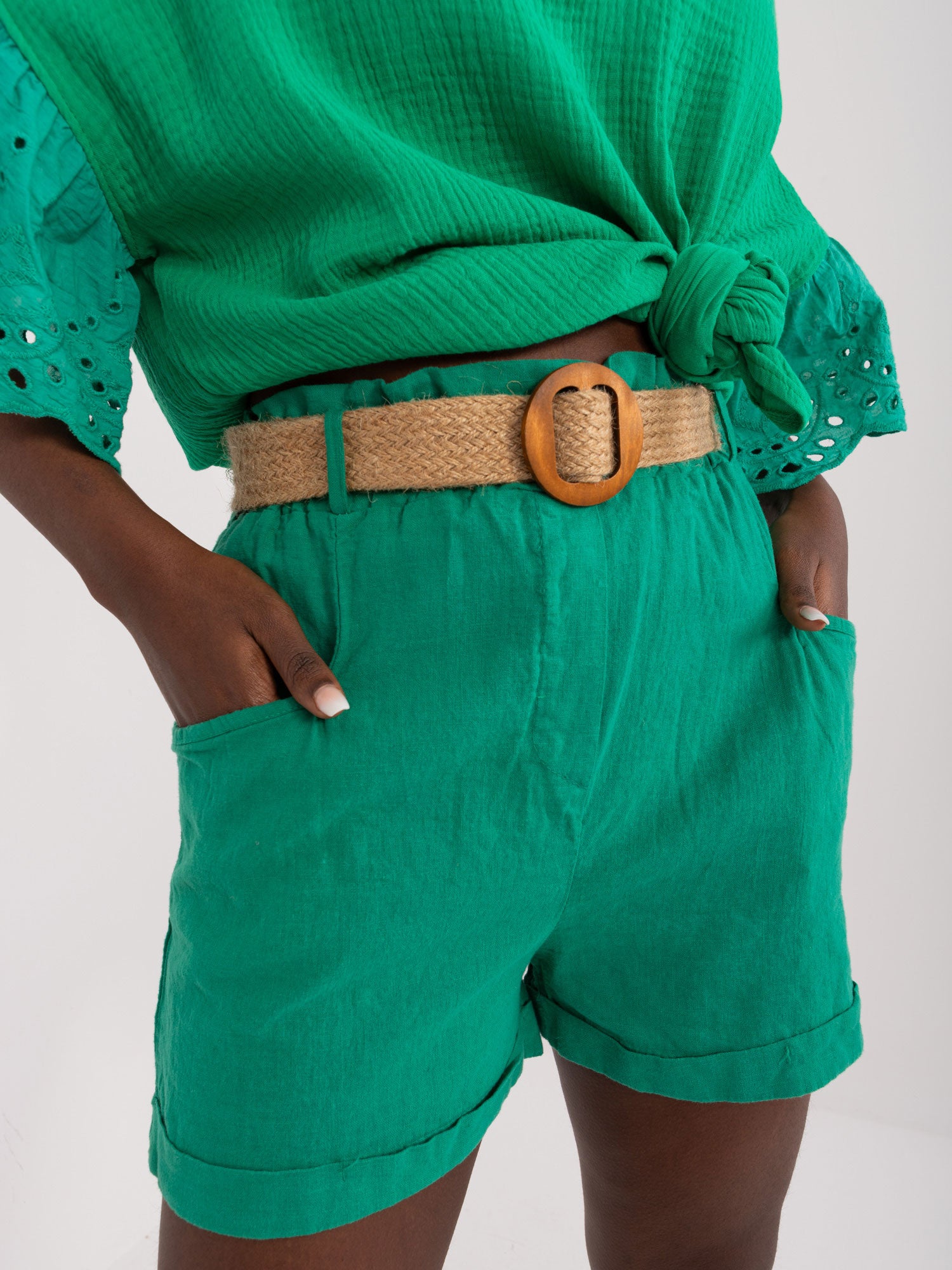 Wymiary szortów w rozmiarze one size mierzone na płasko: szerokość w pasie - 33 cm, wysokość stanu - 33 cm, długość całkowita - 38 cm.