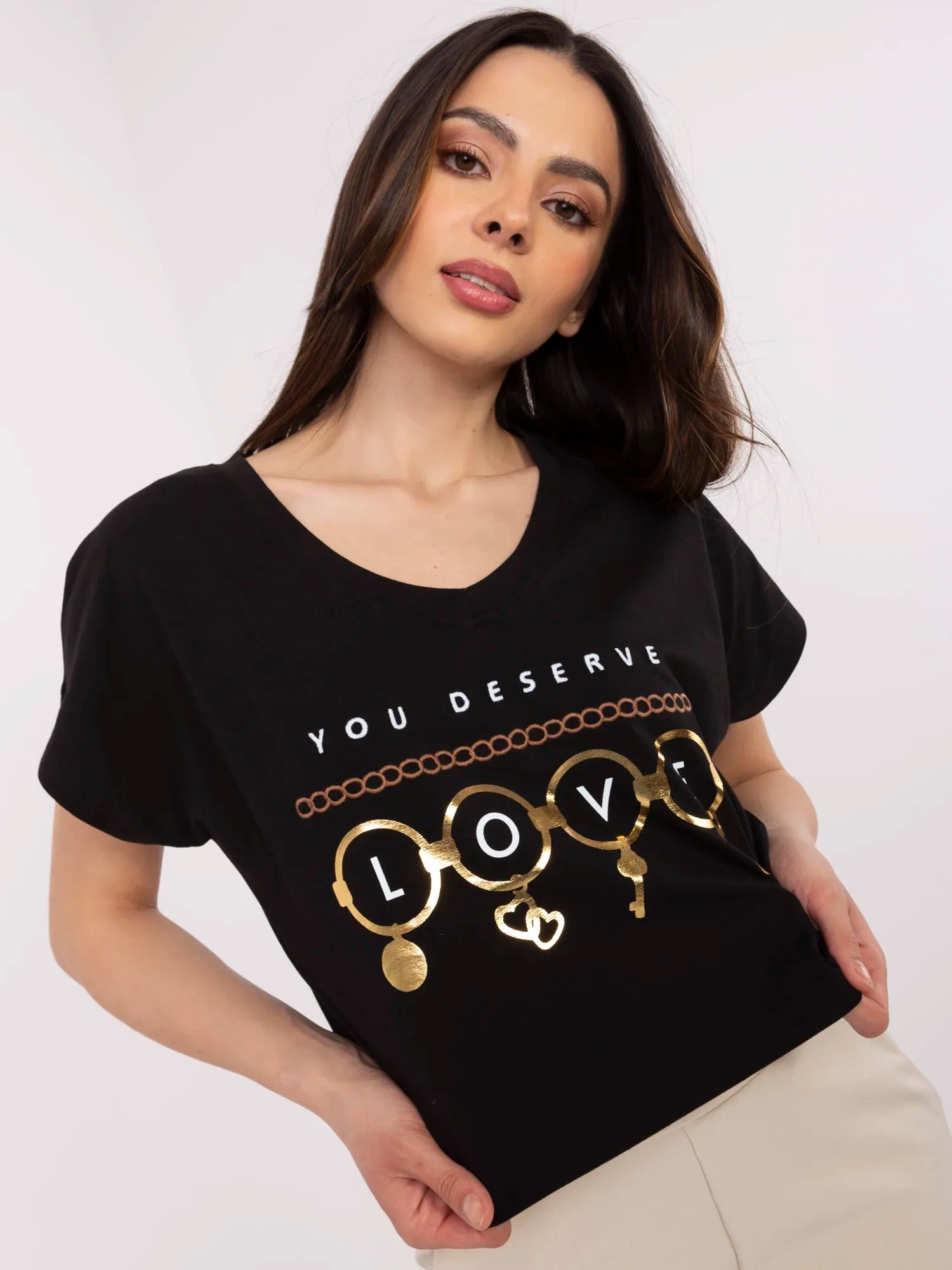 Wymiary t-shirtu w rozmiarze S mierzone na płasko: szerokość pod pachami - 52 cm, długość rękawa - 22 cm (od szwu), długość całkowita - 63 cm, szerokość w biodrach - 50 cm.