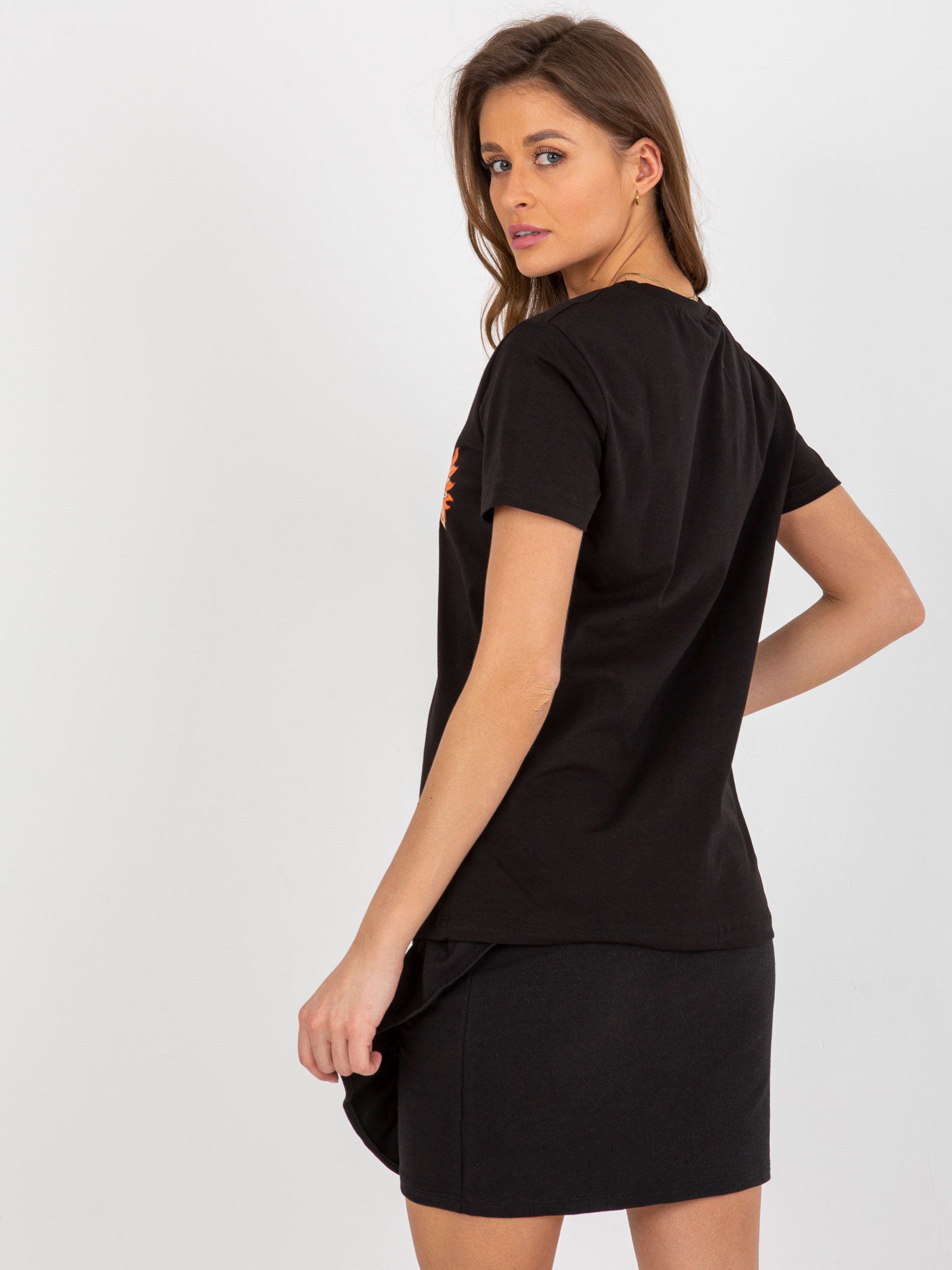 Czarny damski t-shirt z nadrukiem i napisem .