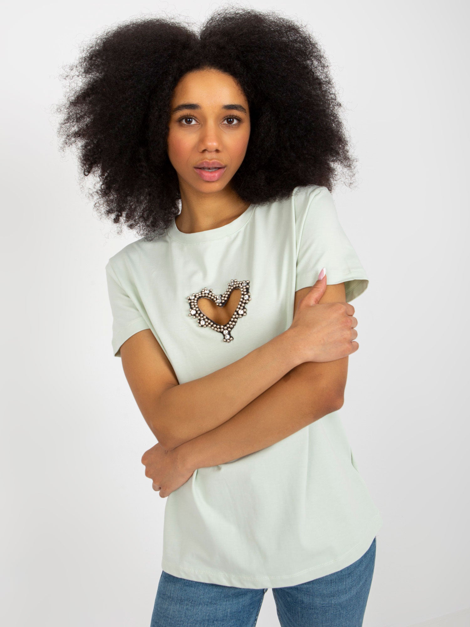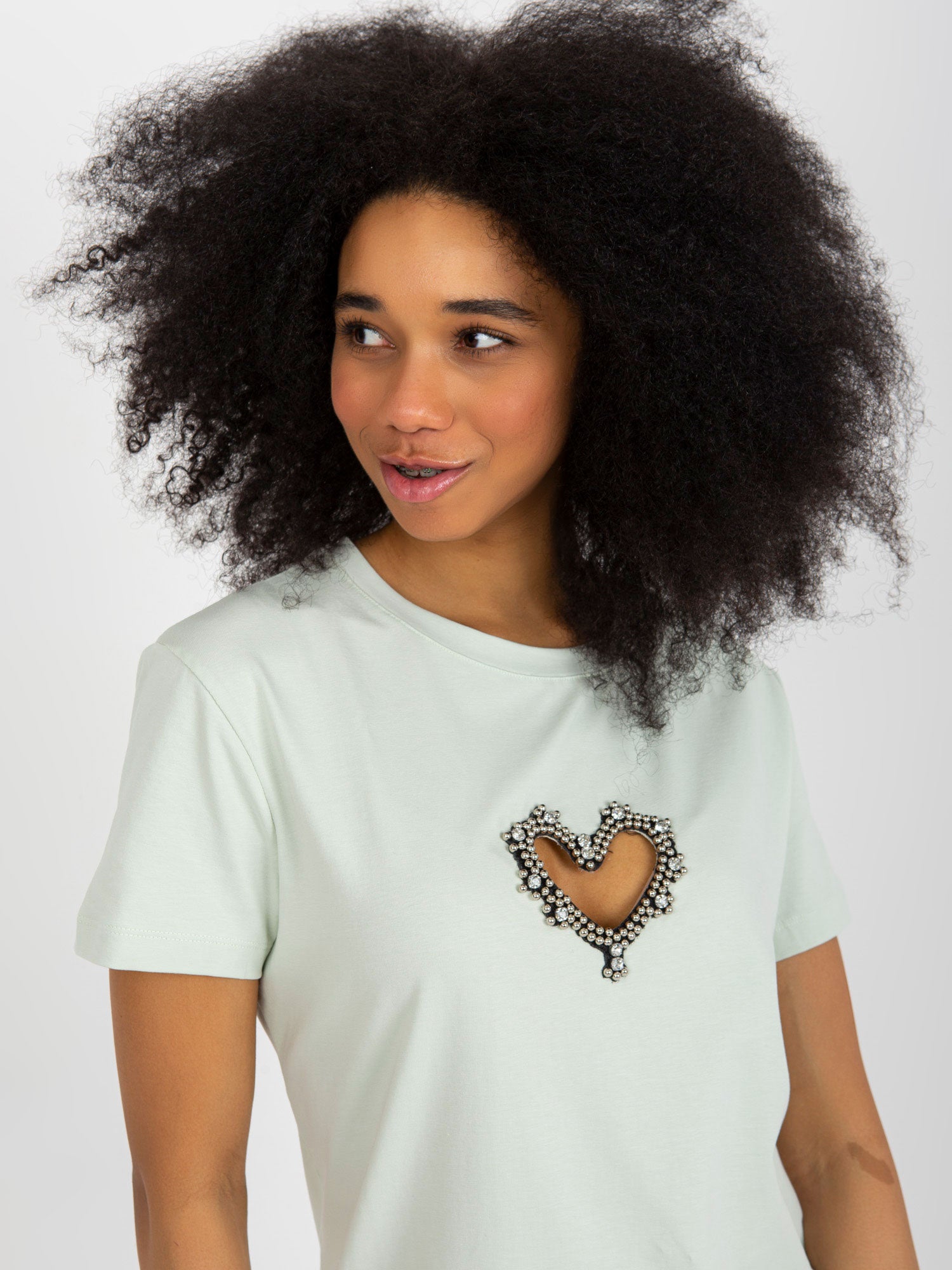 Jasnomiętowy t-shirt z aplikacją i wycięciem .