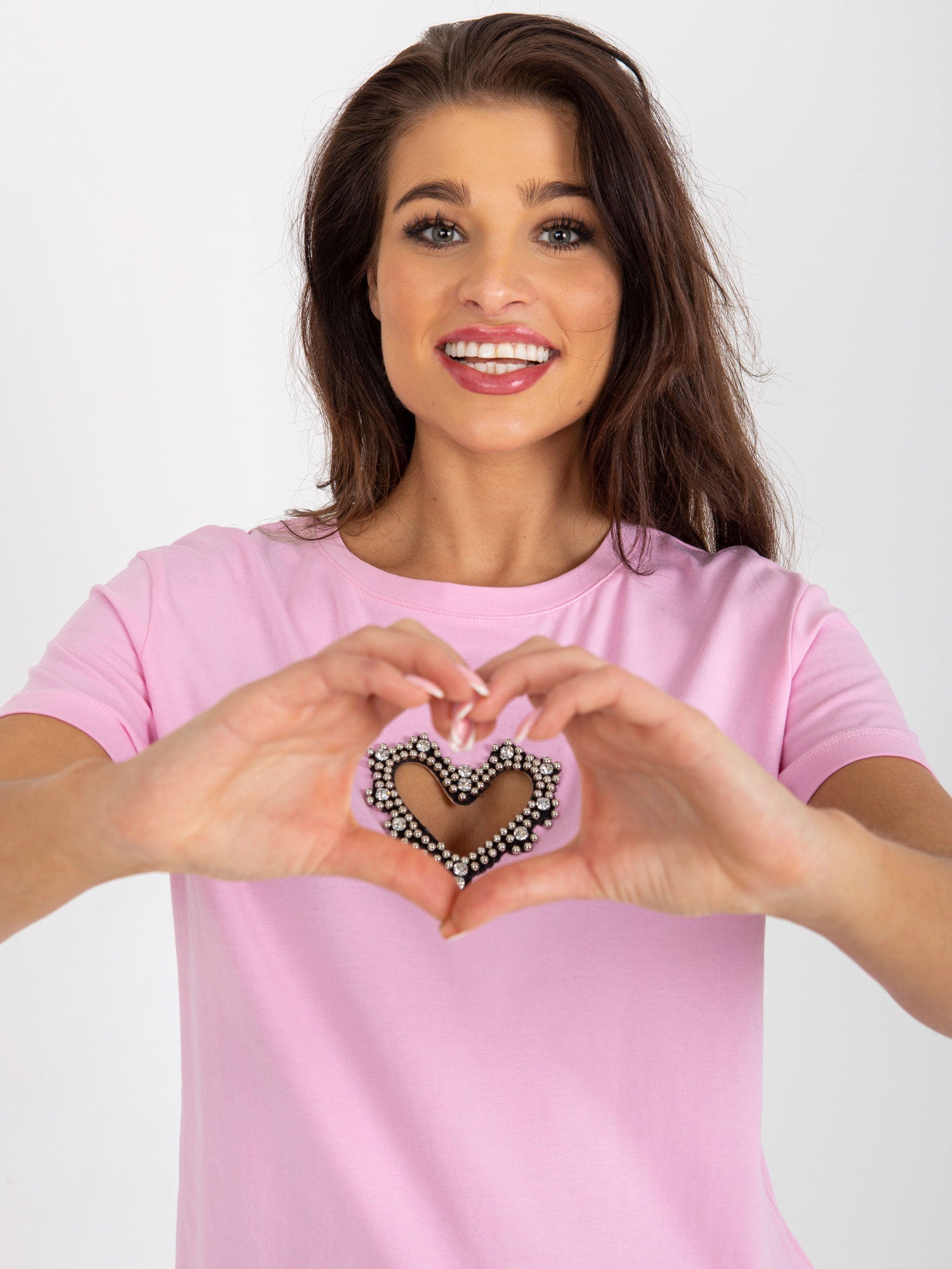 Różowy t-shirt z aplikacją i okrągłym dekoltem .