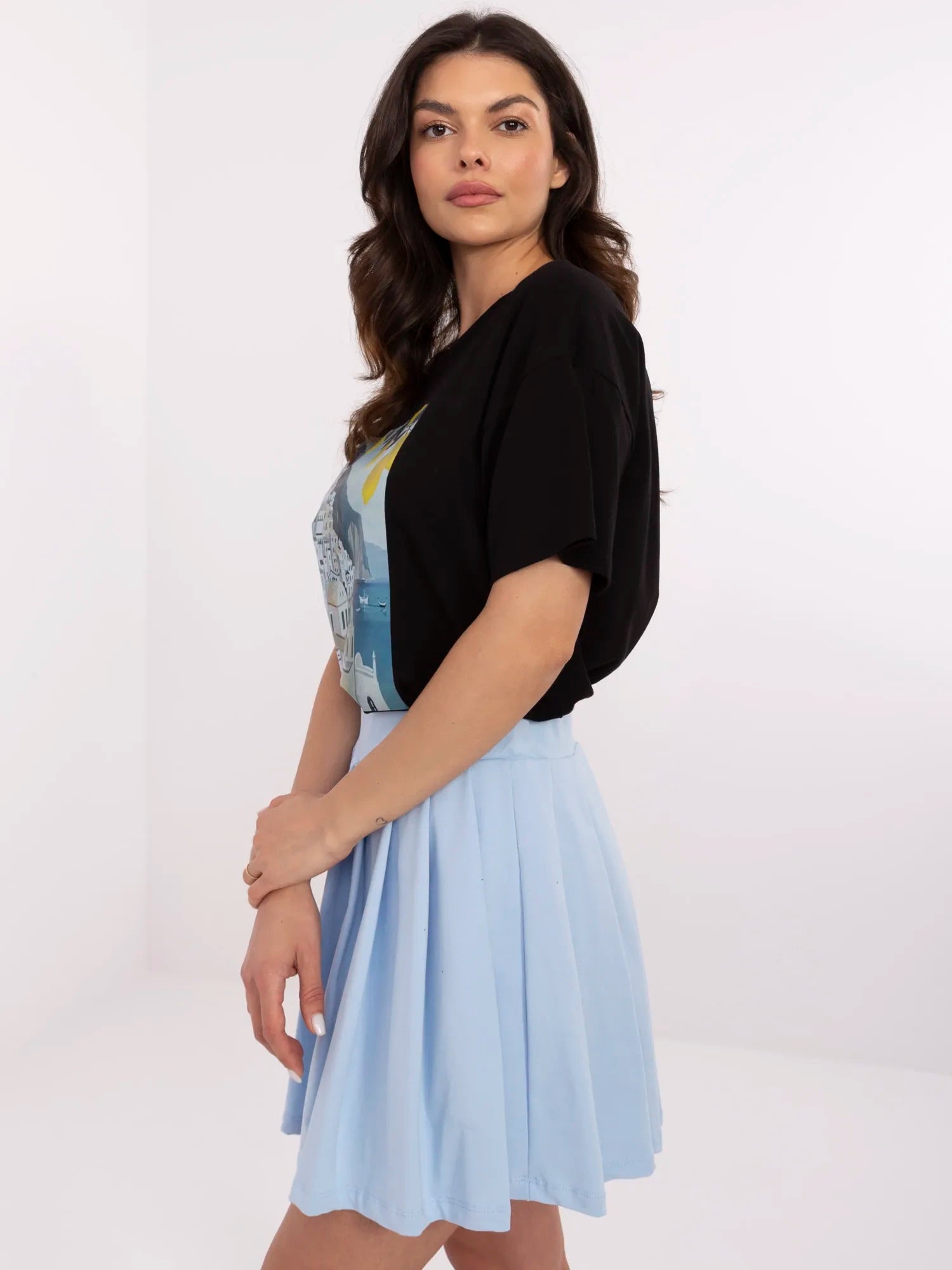 Wymiary t-shirtu w rozmiarze one size mierzone na płasko: szerokość pod pachami - 54 cm, długość rękawa - 19 cm (od szwu), szerokość w biodrach - 55 cm, długość całkowita - 61 cm.
