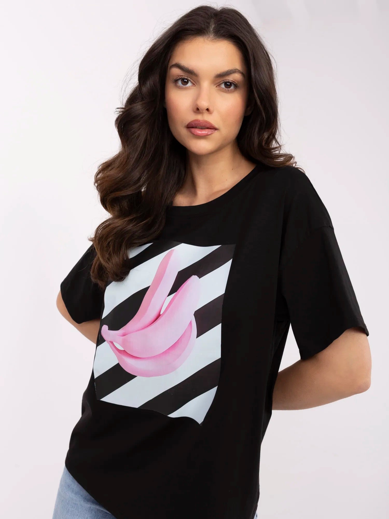 Wymiary t-shirtu w rozmiarze one size mierzone na płasko: szerokość pod pachami - 52 cm, długość rękawa - 17 cm (od szwu), szerokość w biodrach - 54 cm, długość całkowita - 66 cm.