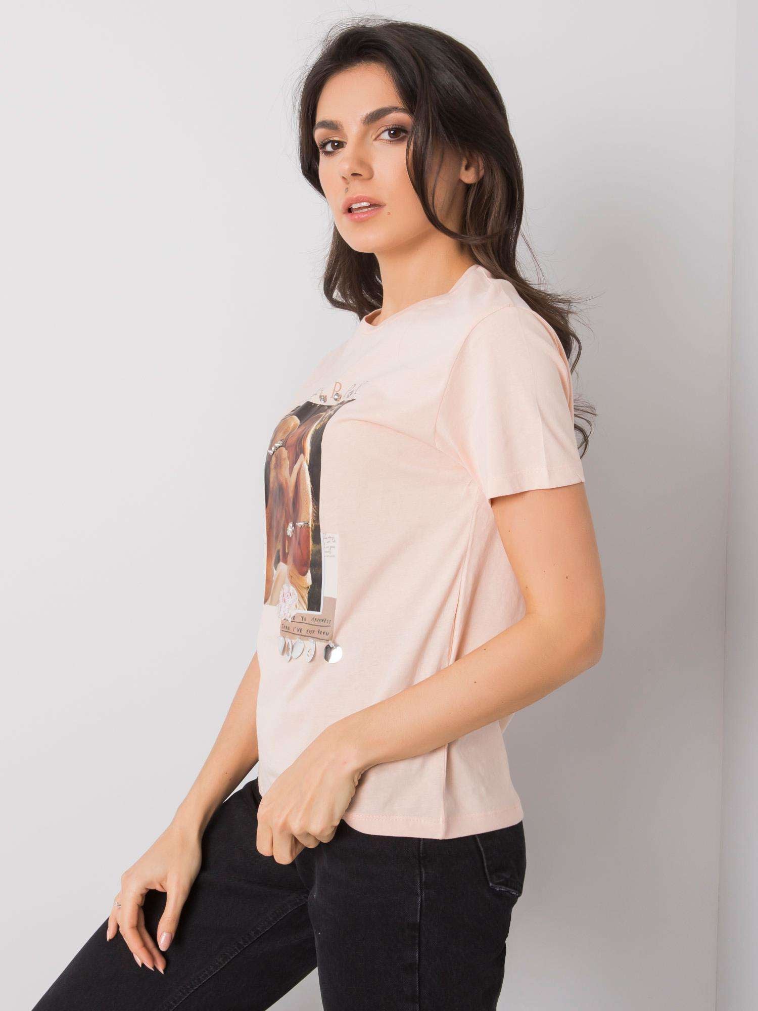 Łososiowy t-shirt z nadrukiem i aplikacją.