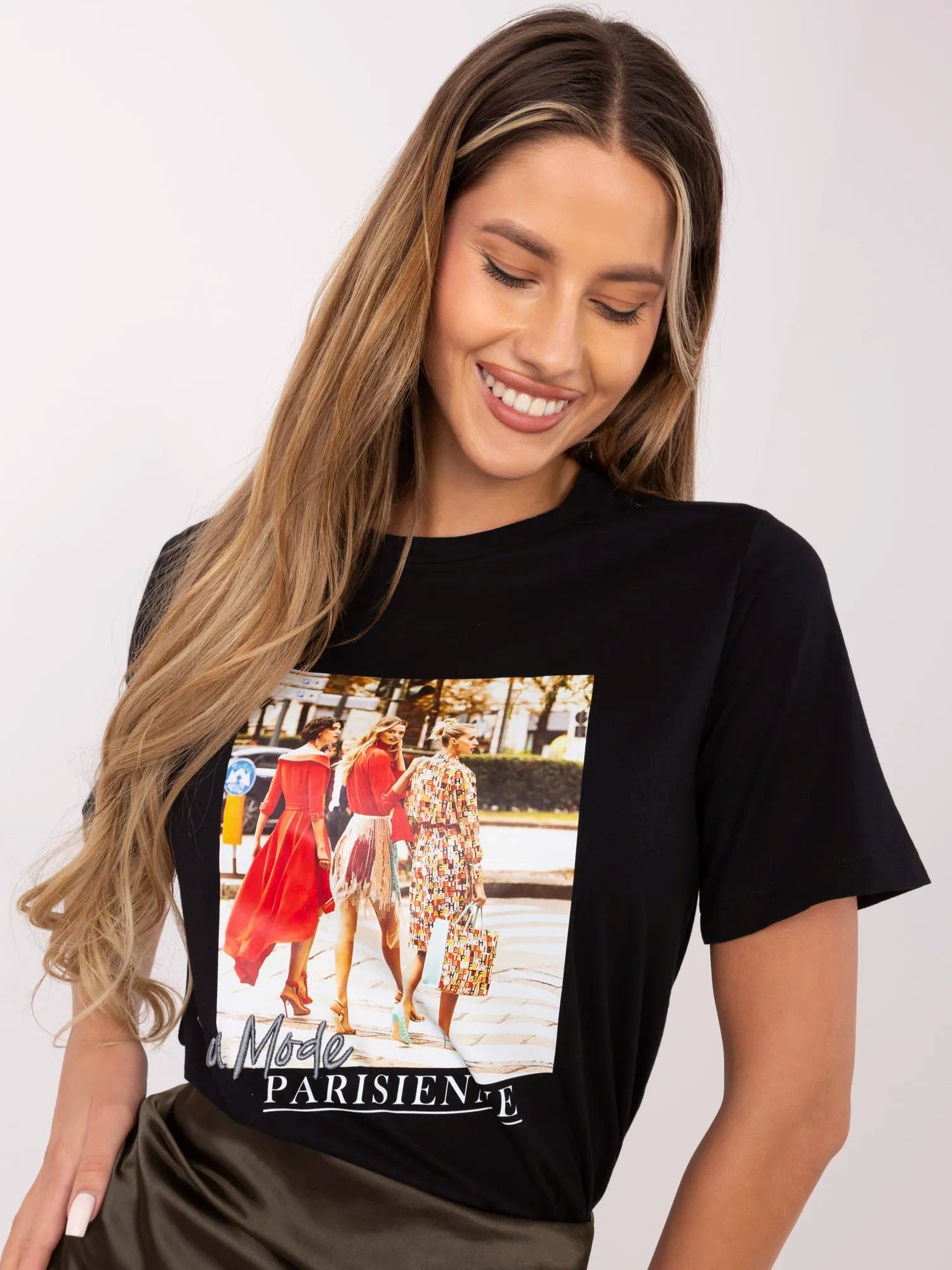 Wymiary t-shirta w rozmiarze S mierzone na płasko: szerokość pod pachami - 48 cm, długość rękawa - 23 cm, szerokość w biodrach - 51 cm, długość całkowita - 67 cm.