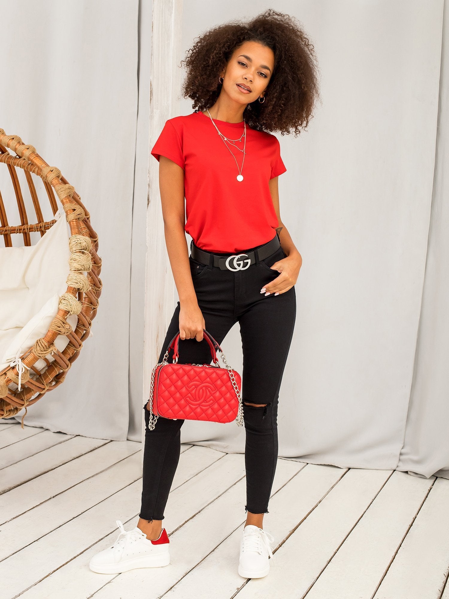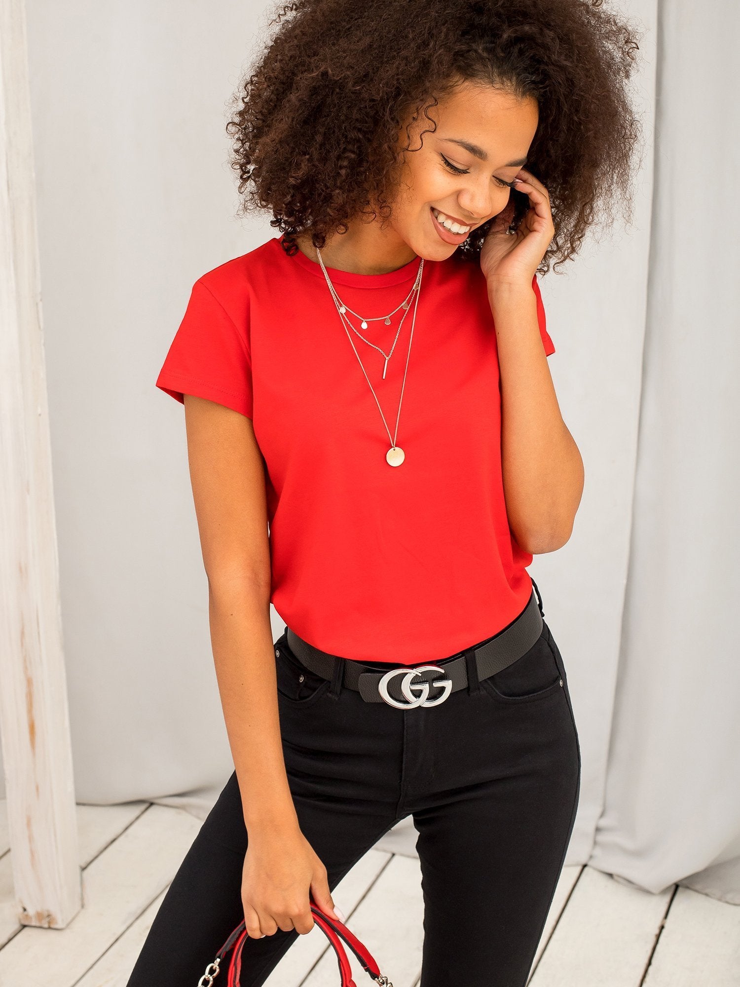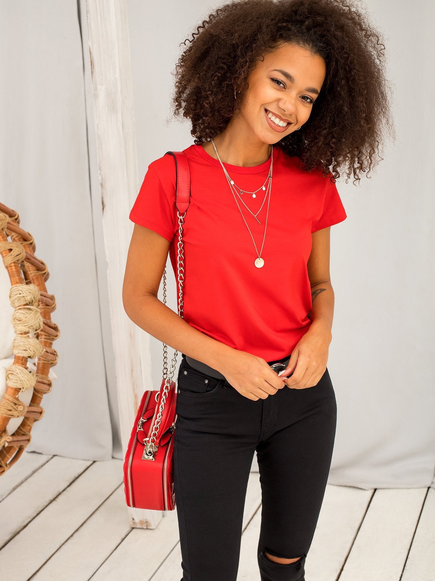 Czerwony t-shirt Peachy. Gładkie koszulki damskie stanowią ważny element każdej kobiecej szafy. Są ponadczasowe, klasyczne i pasują do innych ubrań, a także są odpowiedni praktycznie na każdą okazję. Pójdziesz w nich do szkoły czy pracy, jak również na spotkanie ze znajomymi albo spacer. Idealnie pasują do stylizacji w stylu sportowym, ale też znakomicie sprawdzają się w miejskim casualu oraz w nieco bardziej kobiecych strojach. Połączysz je ze spodniami dresowymi, jeansami oraz ze spódniczkami z naszej najnowszej kolekcji online. Dobierz do nich żakiet lub rozpinaną bluzę z kapturem oraz szpilki lub modne sneakersy i ruszaj w miasto! Ten damski t-shirt basic zrobiony jest z nowoczesnej mieszanki materiałów, gwarantujących jednocześnie przewiewność i wysoki komfort noszenia. Wybierz swój ulubiony kolor w naszym sklepie online!