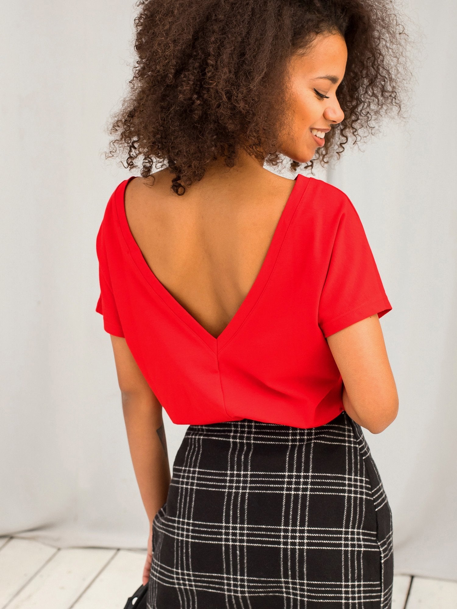 Czerwony t-shirt Fire. Gładki t-shirt damski bez wzorów i nadruków to must have w każdej kobiecej garderobie. Warto go mieć z kilku powodów - po pierwsze taki t-shirt basic jest uniwersalny, czyli założysz go niemal na każdą okazję i będzie pasował do wszystkich Twoich ubrań. Po drugie jest zrobiony z wysokiej jakości materiałów z dużą zawartością bawełny, co zapewnia optymalną przewiewność. I wreszcie po trzecie jest on po prostu super wygodny, dlatego idealnie sprawdzi się w codziennych stylizacjach! Poza tym nigdy nie wyjdzie z mody z racji swojego minimalizmu, który sobą reprezentuje. Kobiecy fason i ciekawy design podkręcony trójkątnym dekoltem na plecach świetnie pasować będzie do sportowych i do bardziej eleganckich stylizacji. Wybierz ten t-shirt basic w swoim ulubionym kolorze zanim wyprzeda się Twój rozmiar!