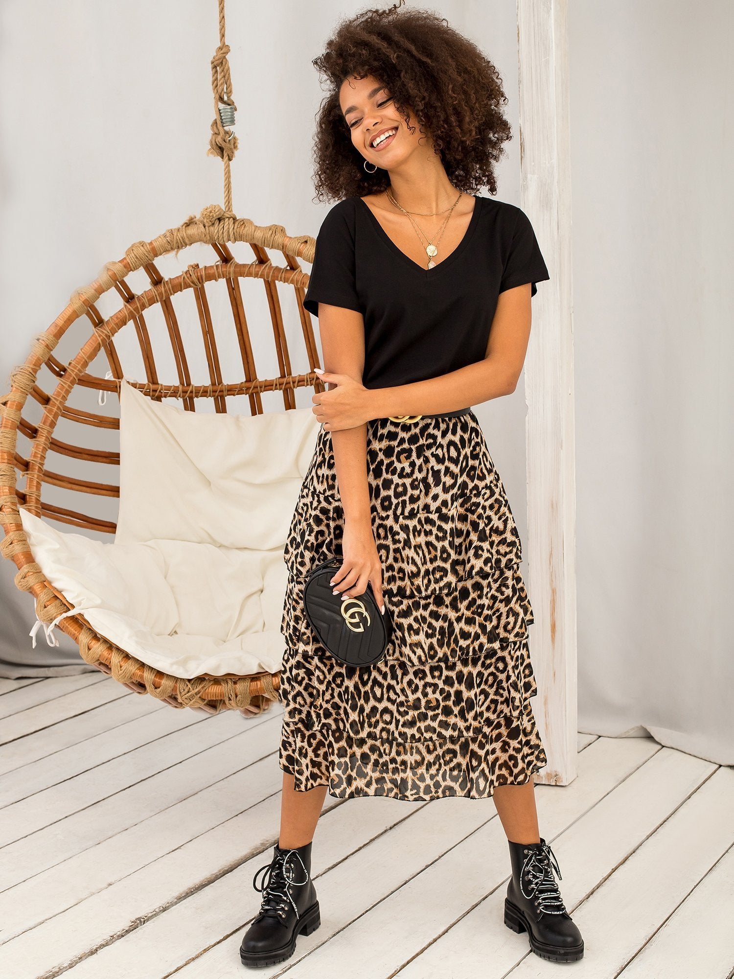 Modelka ma na sobie rozmiar XS. Wymiary modelki: wzrost 180 cm, biust 89 cm, talia 63 cm, biodra 93 cm.
