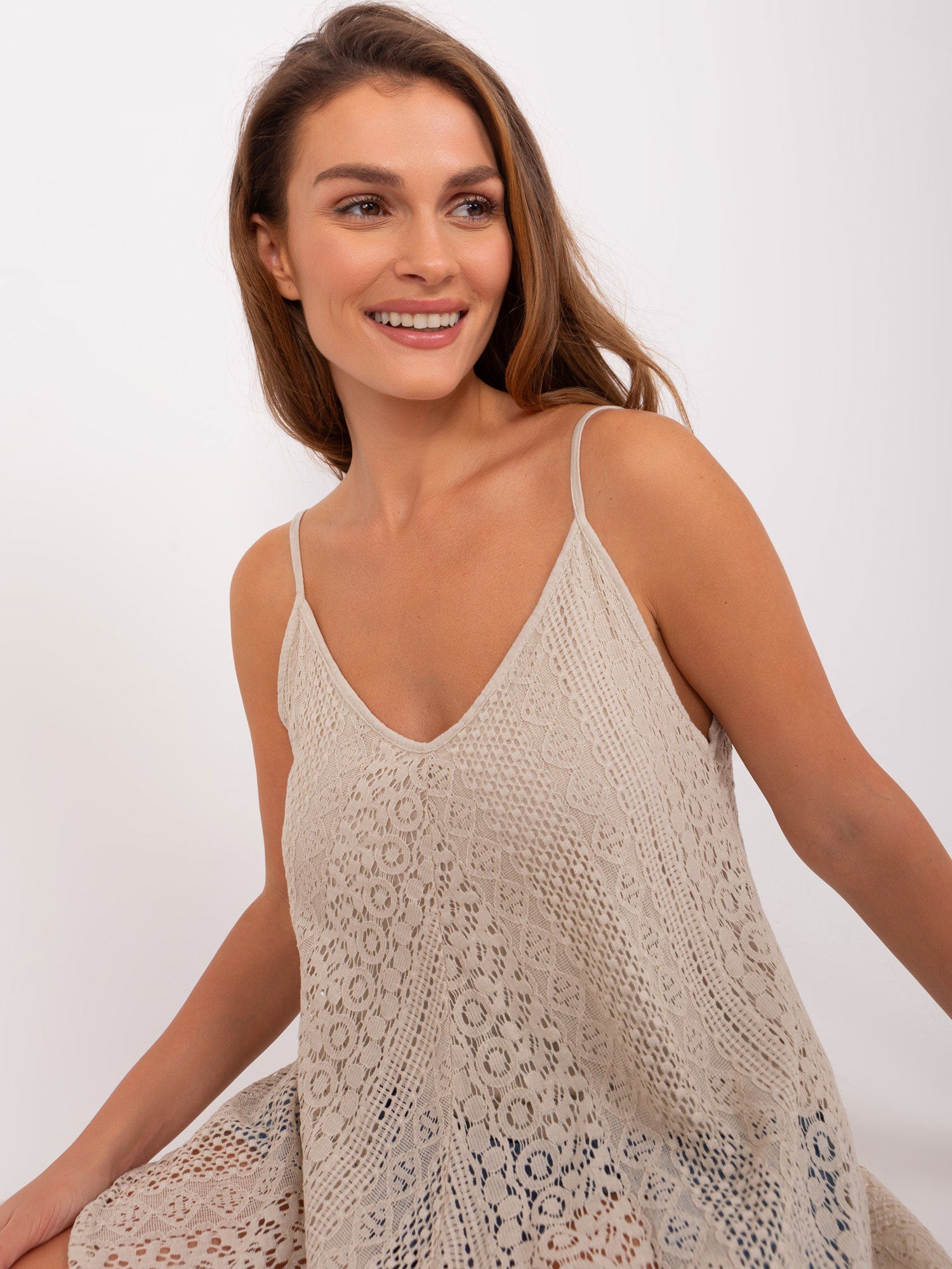 Beżowy rozkloszowany top z koronką OCH BELLA .