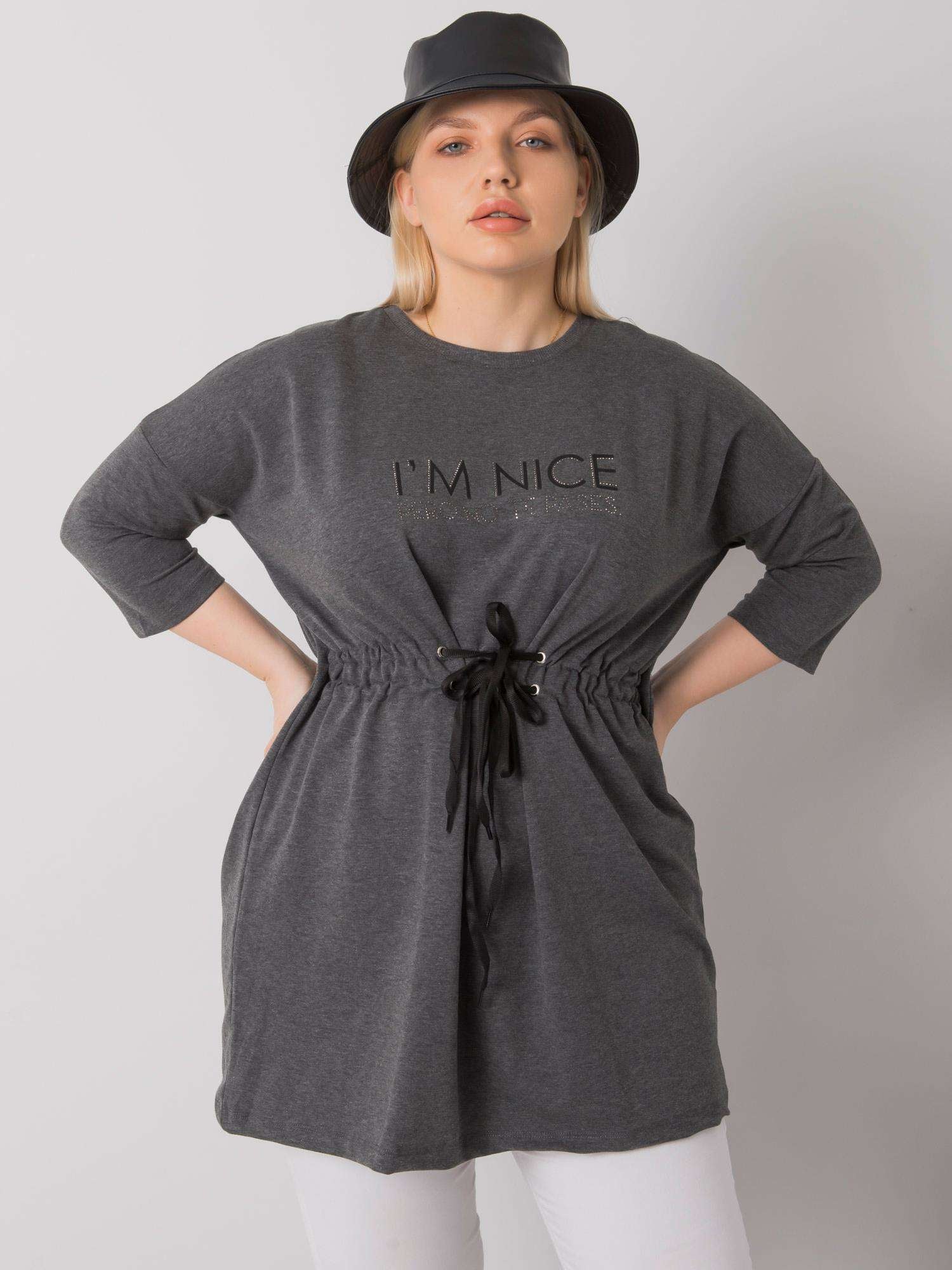 Ciemnoszara melanżowa tunika plus size z napisem.
