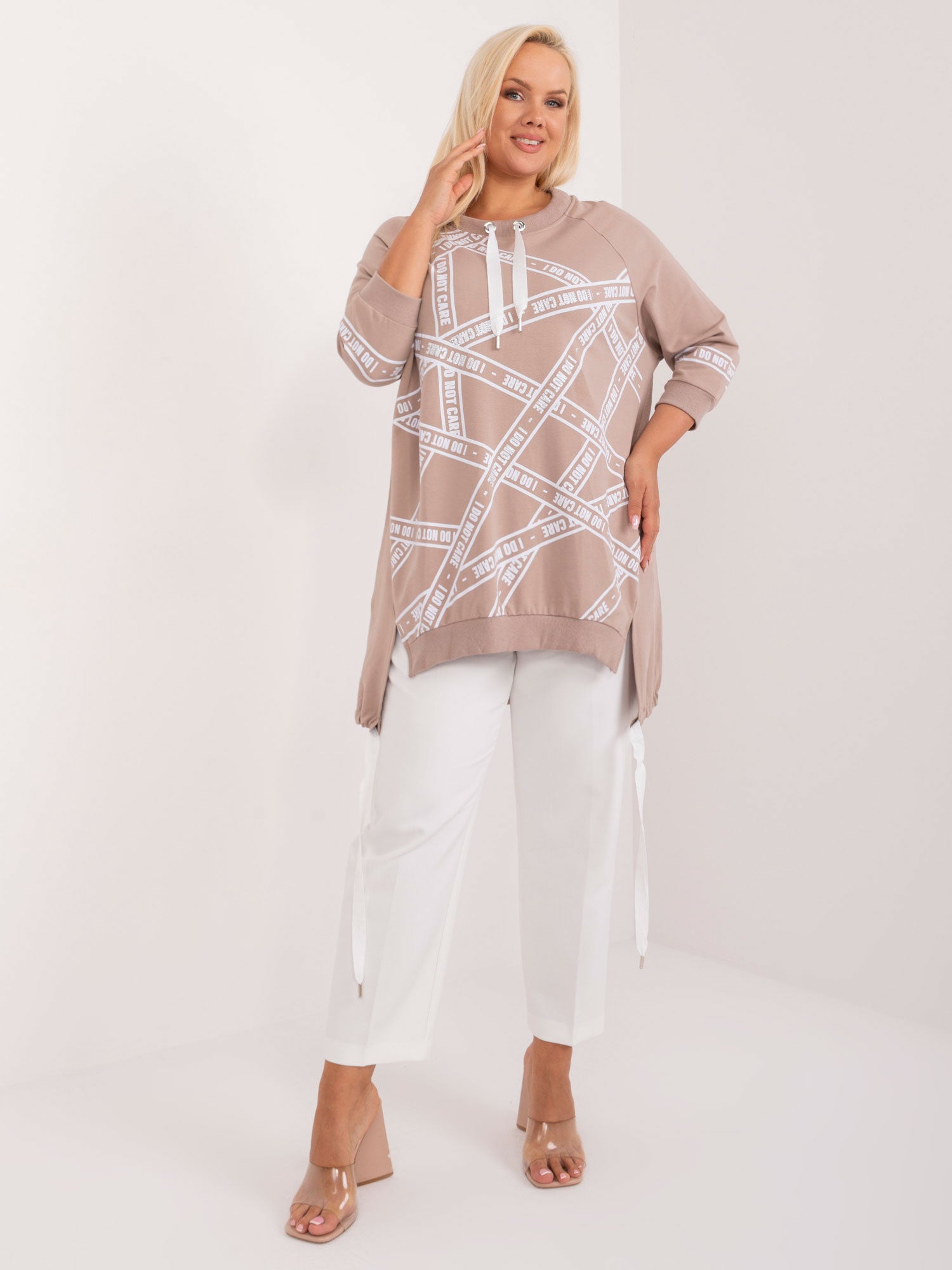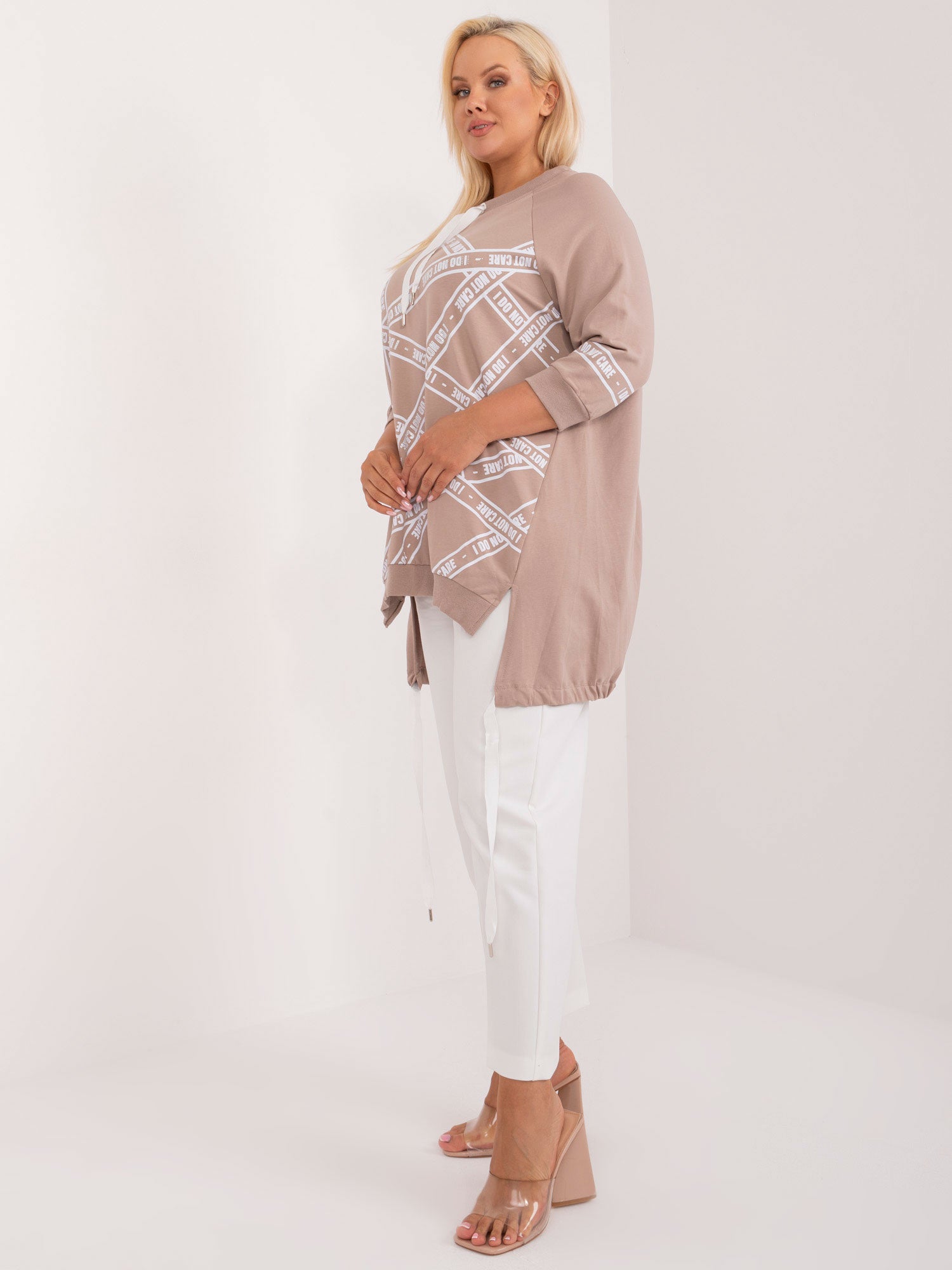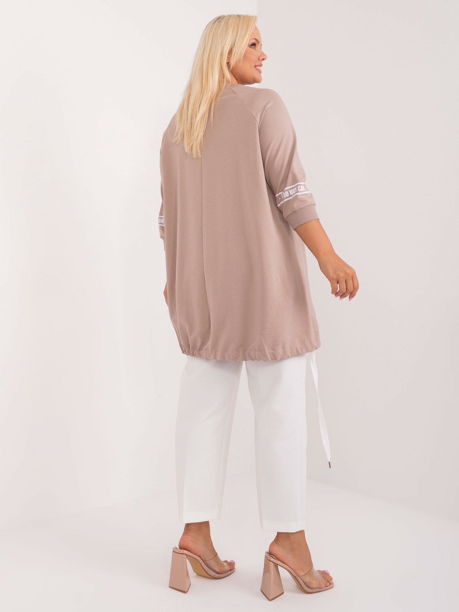 Wymiary bluzki w rozmiarze one size mierzone na płasko: szerokość pod pachami - 63 cm, długość rękawa - 43 cm, długość całkowita (przód) - 70 cm, długość całkowita (tył) - 85 cm.
