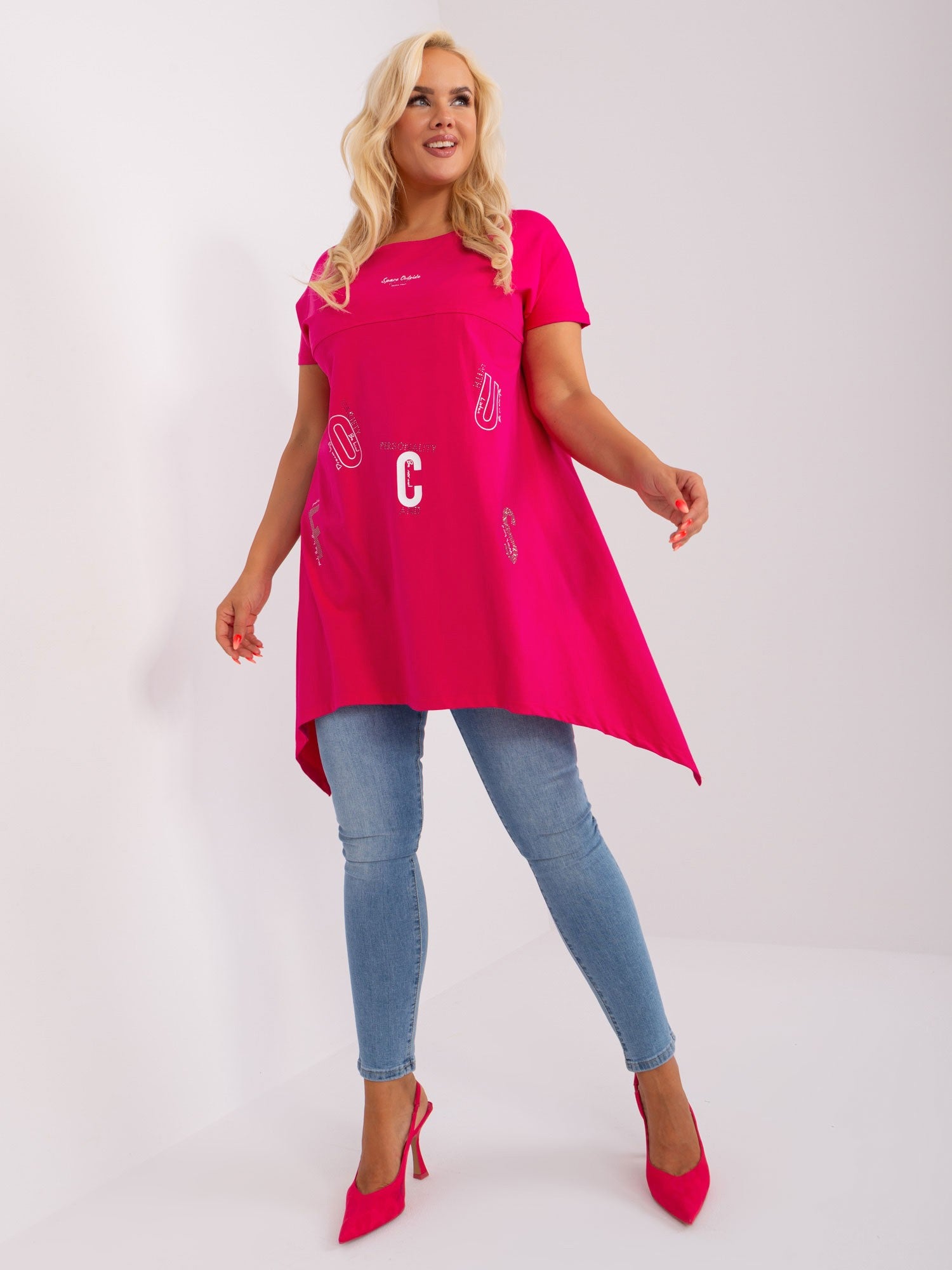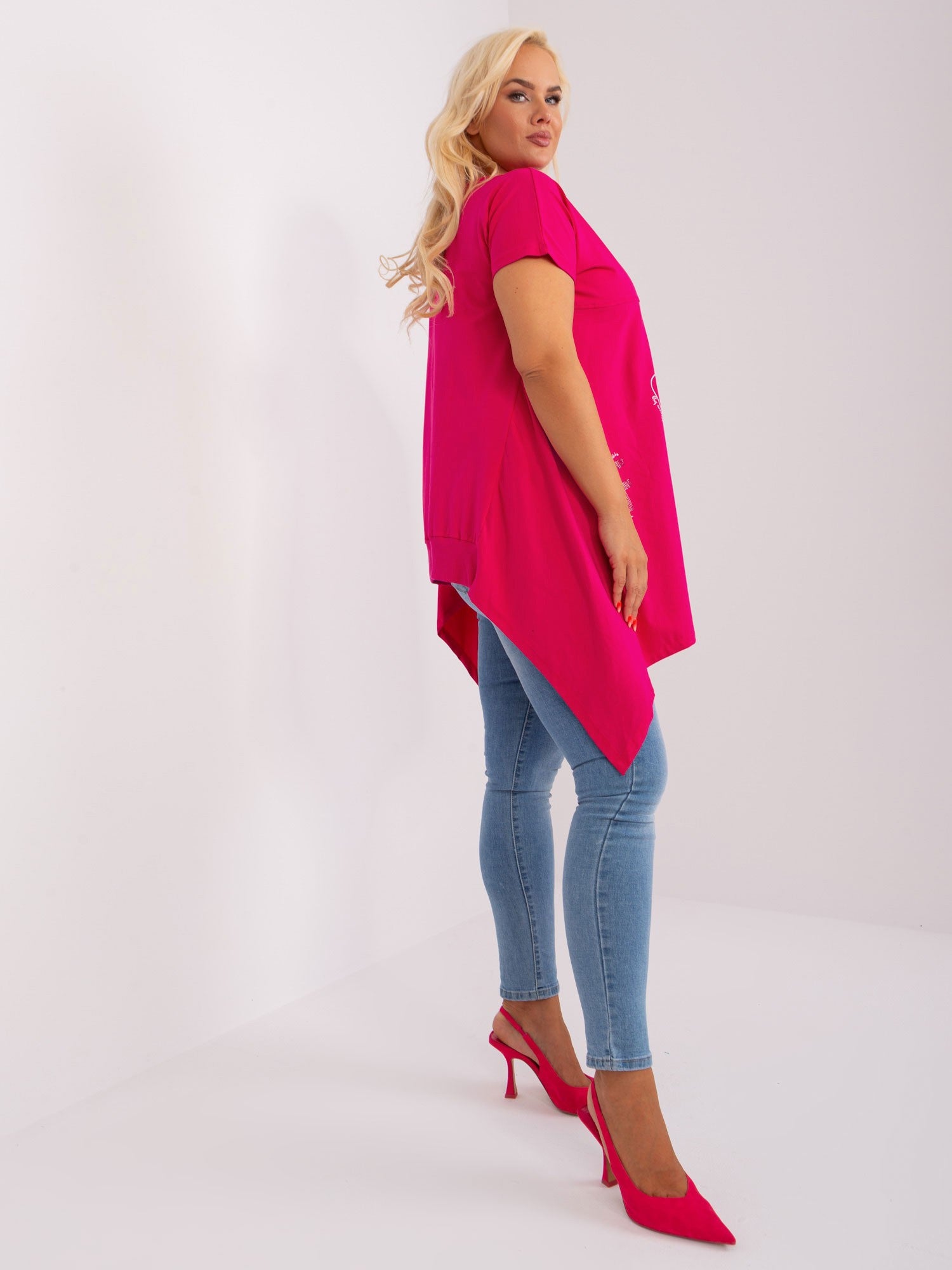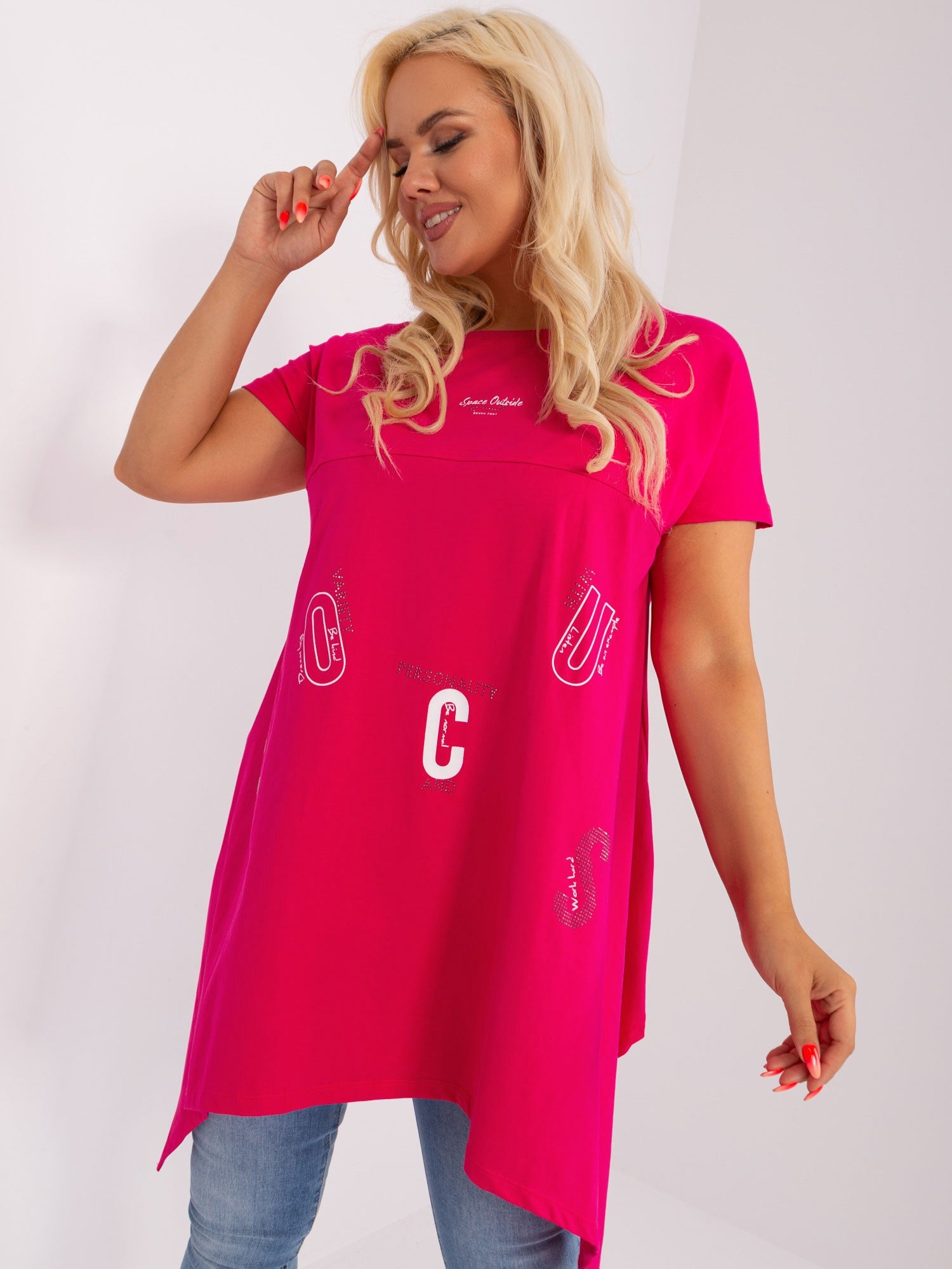 Fuksjowa długa bluzka plus size z nadrukiem .