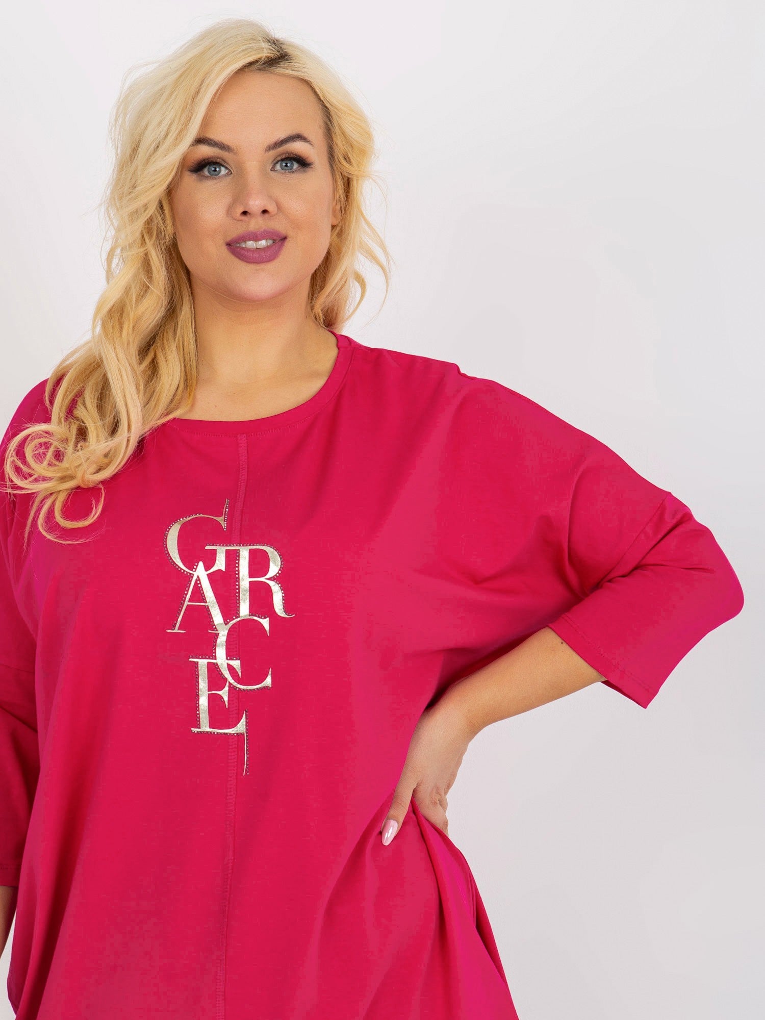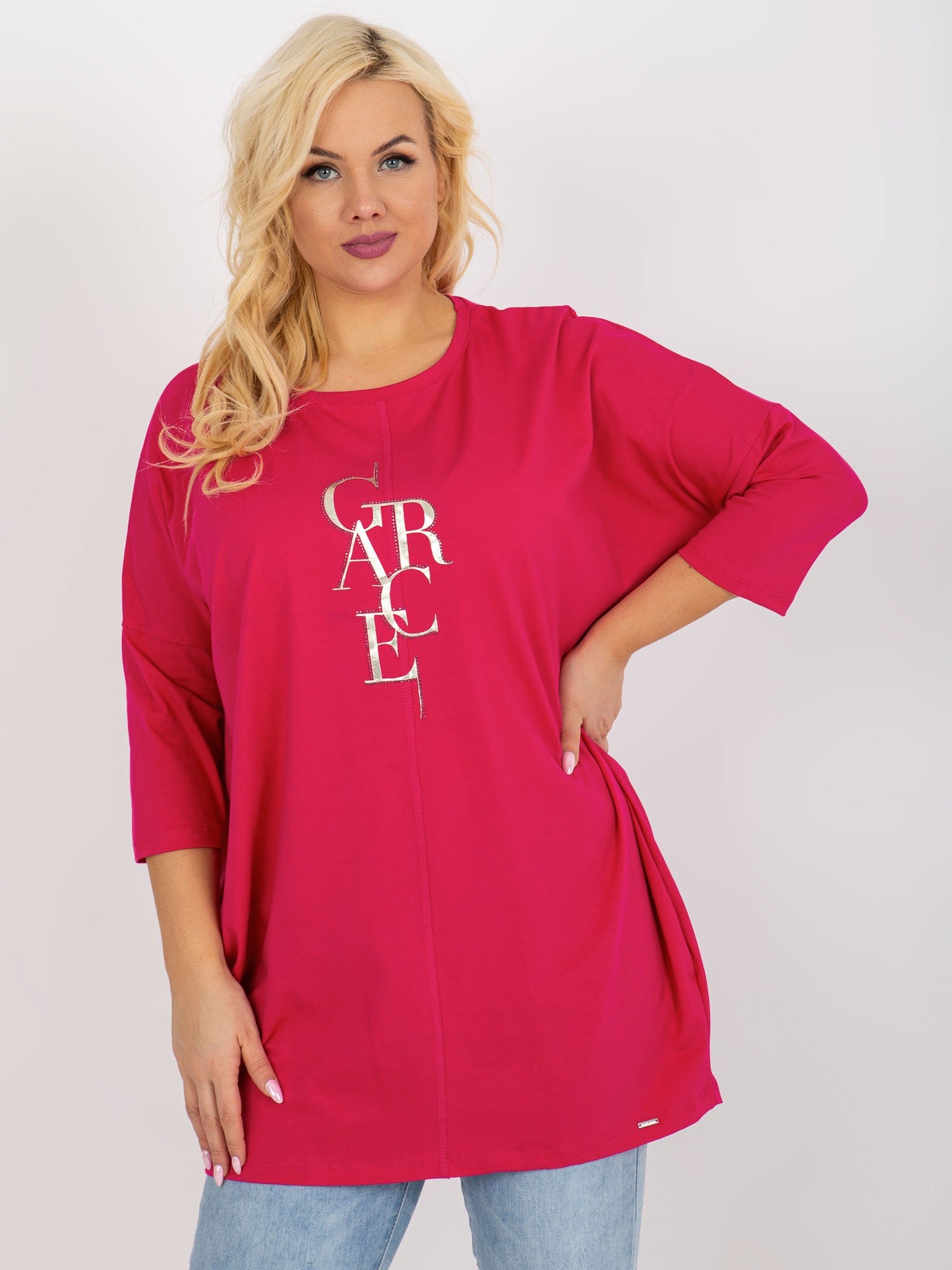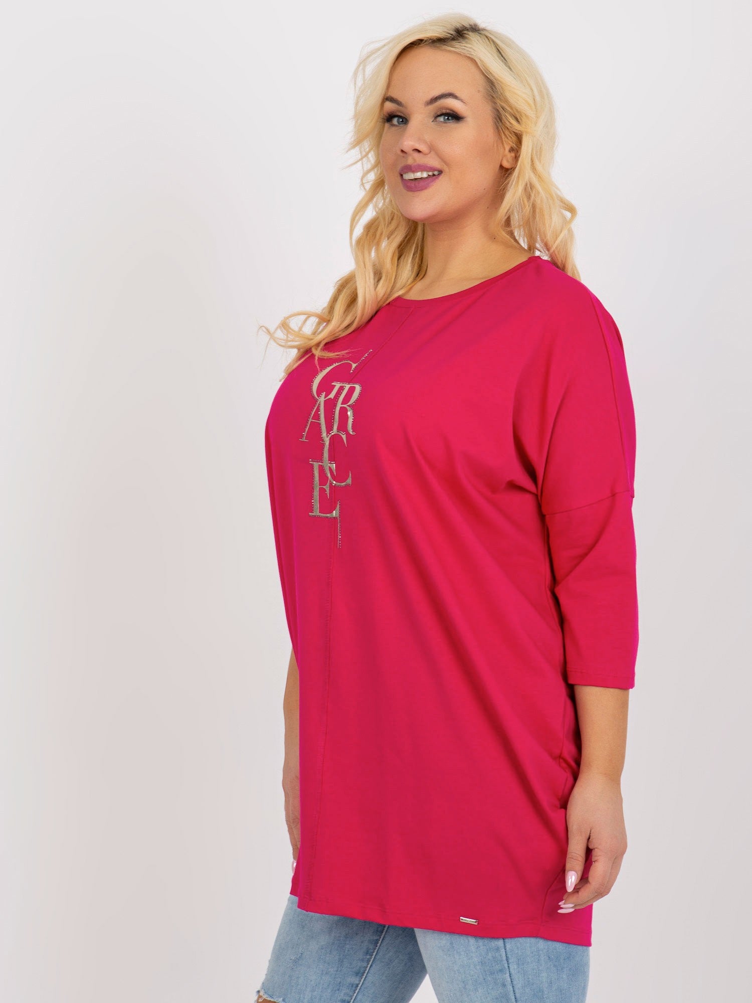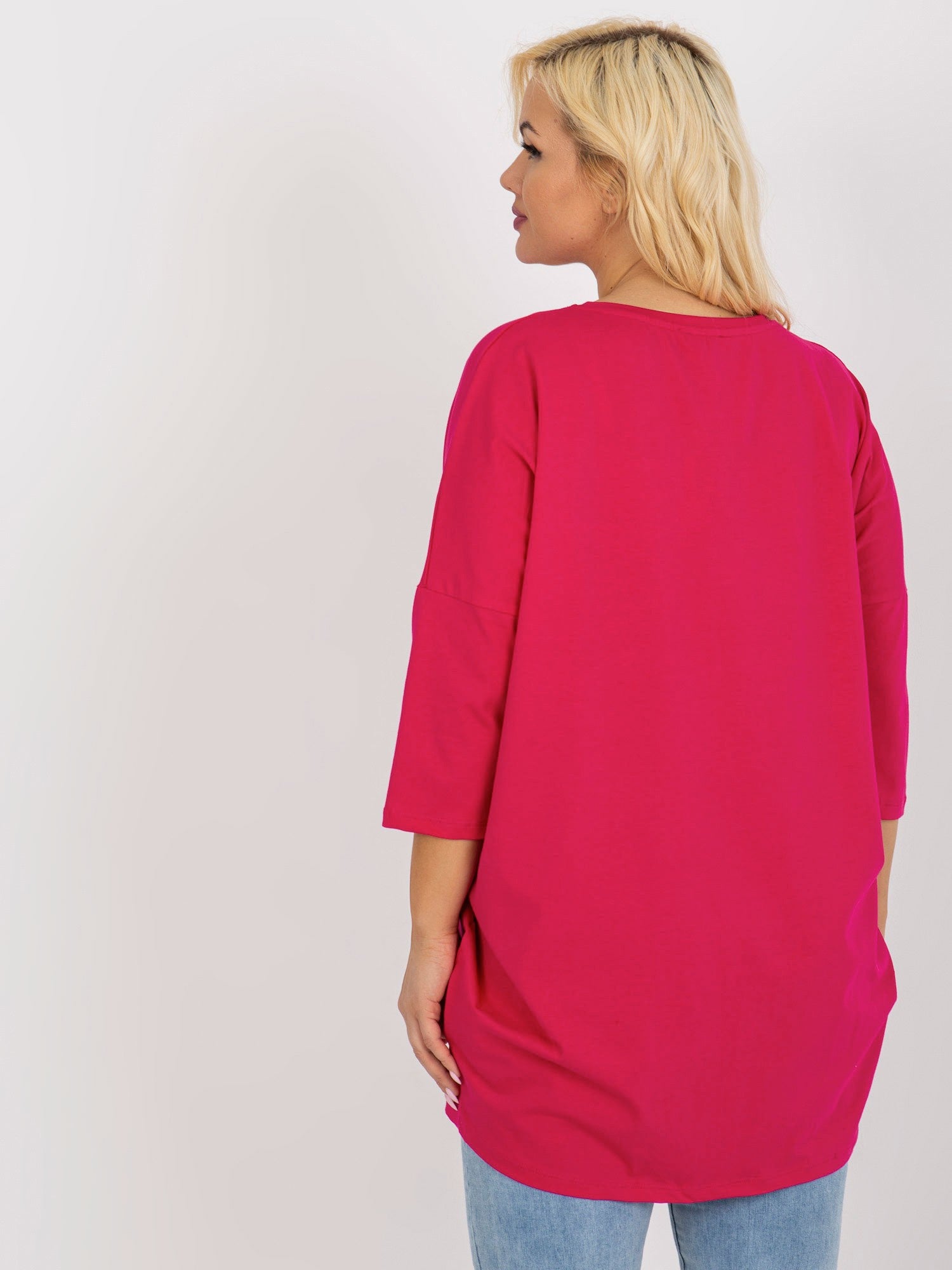 Fuksjowa dłuższa bluzka plus size z rękawem 3/4 .