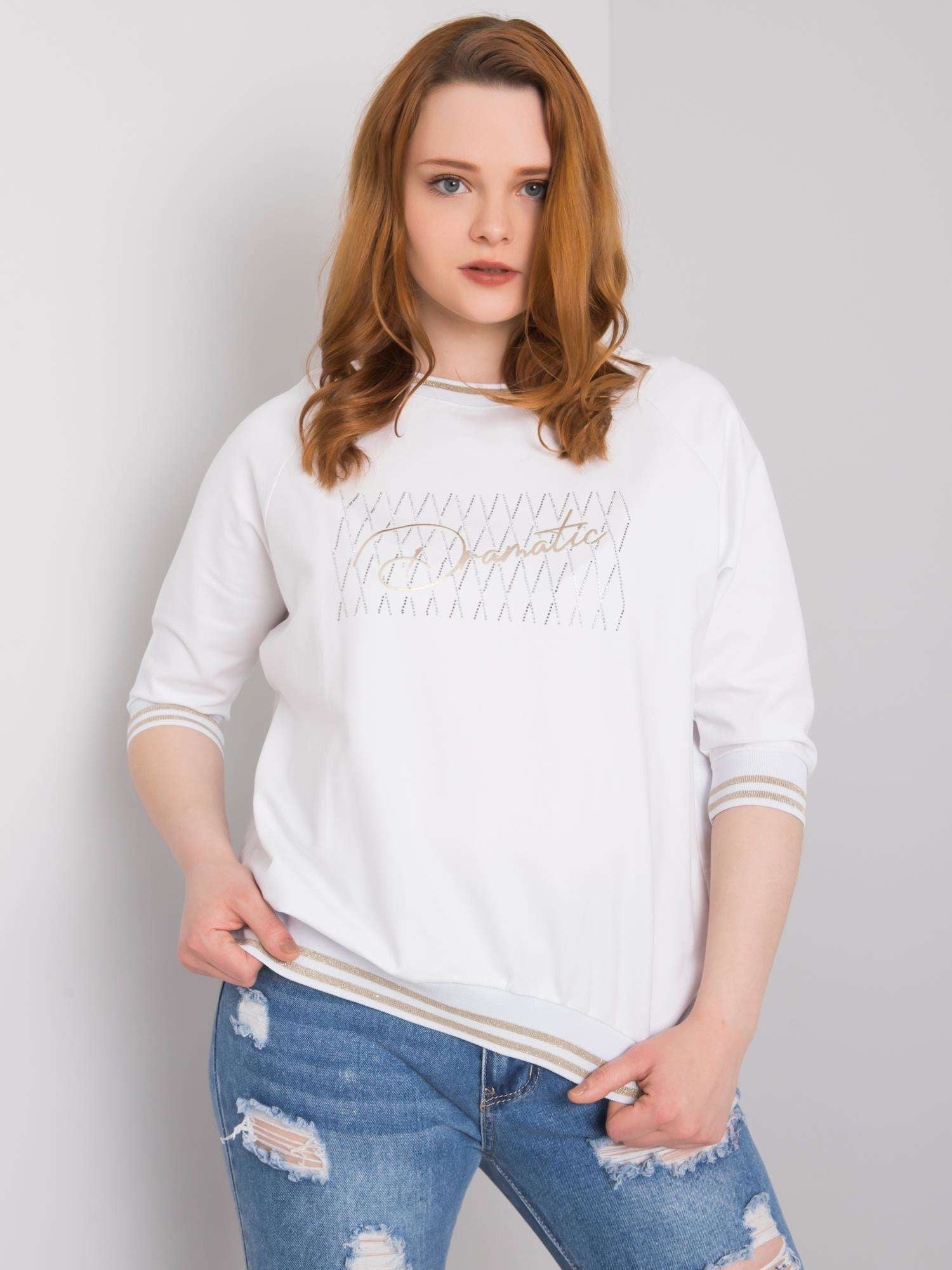Biała bluzka z aplikacją i napisem.