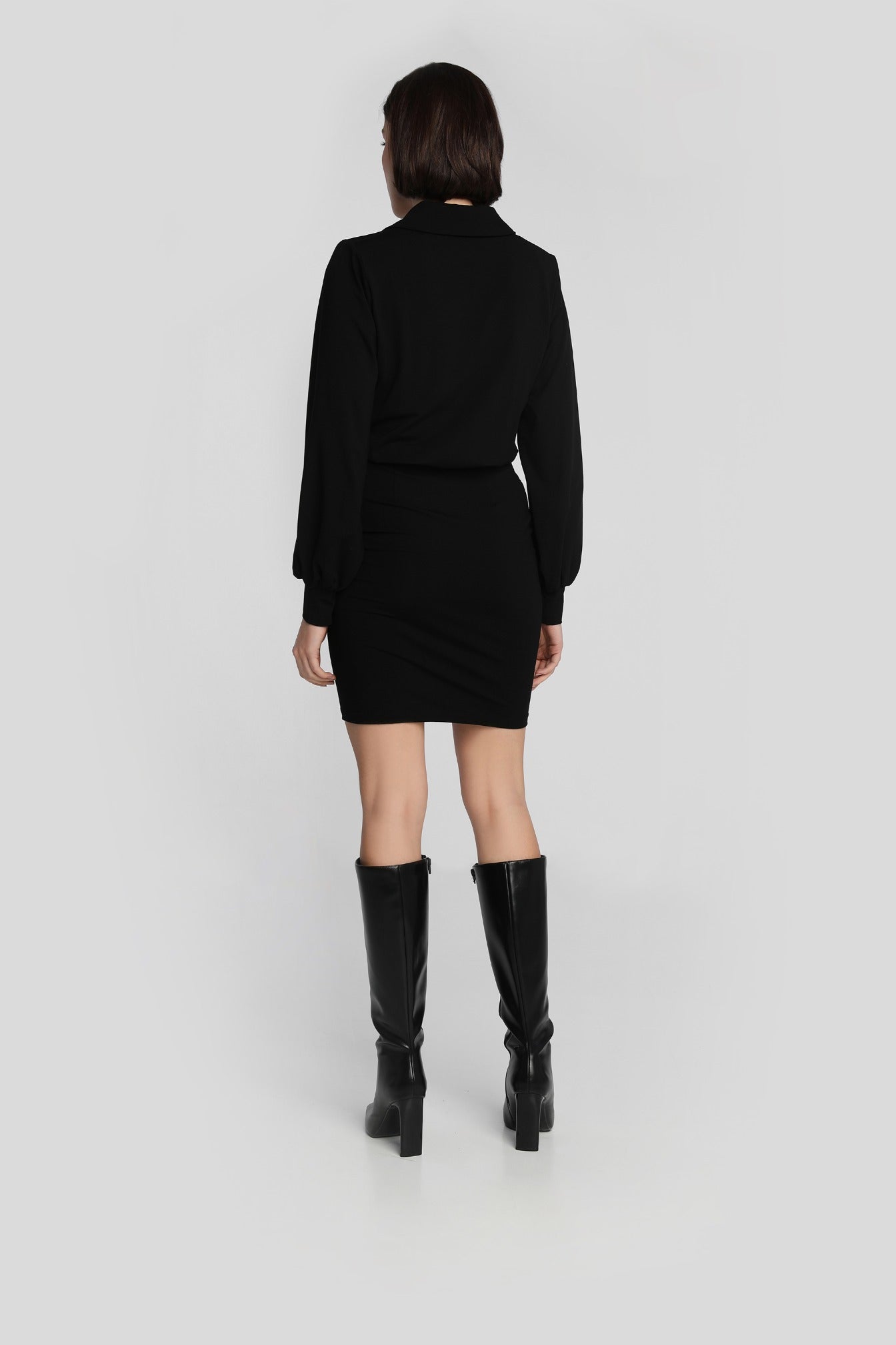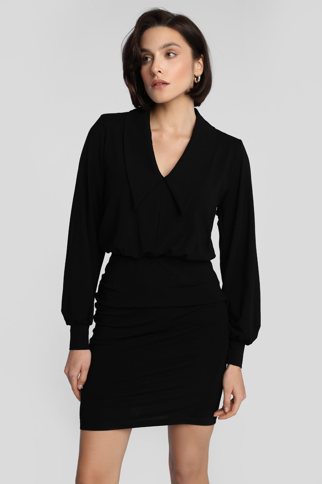 Sukienka mini z dopasowanym dołem, zaszewkami i gumką w talii. Góra sukienki jest luźna, z szerokim kołnierzem, bufiastymi rękawami z ramionami podkreślonymi wkładami barkowymi i wykończonymi szerokimi ściągaczami.