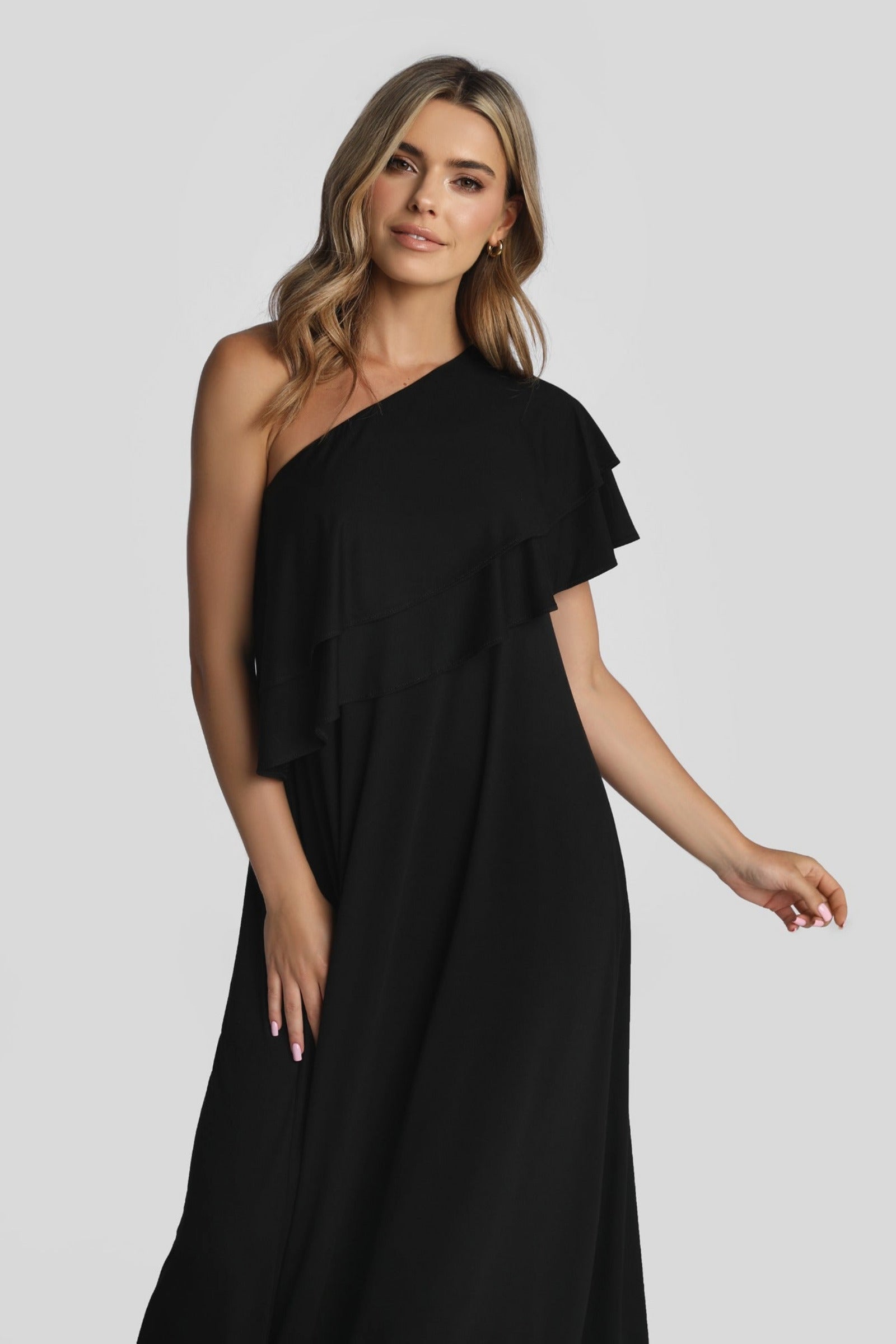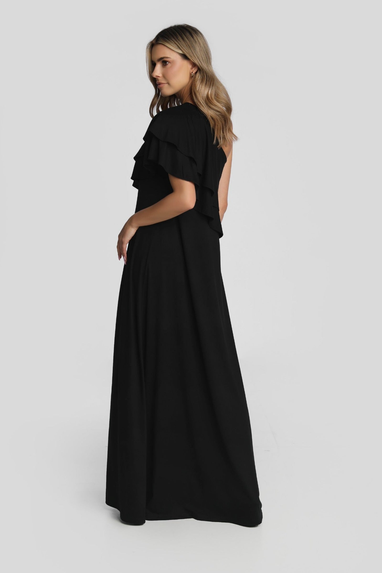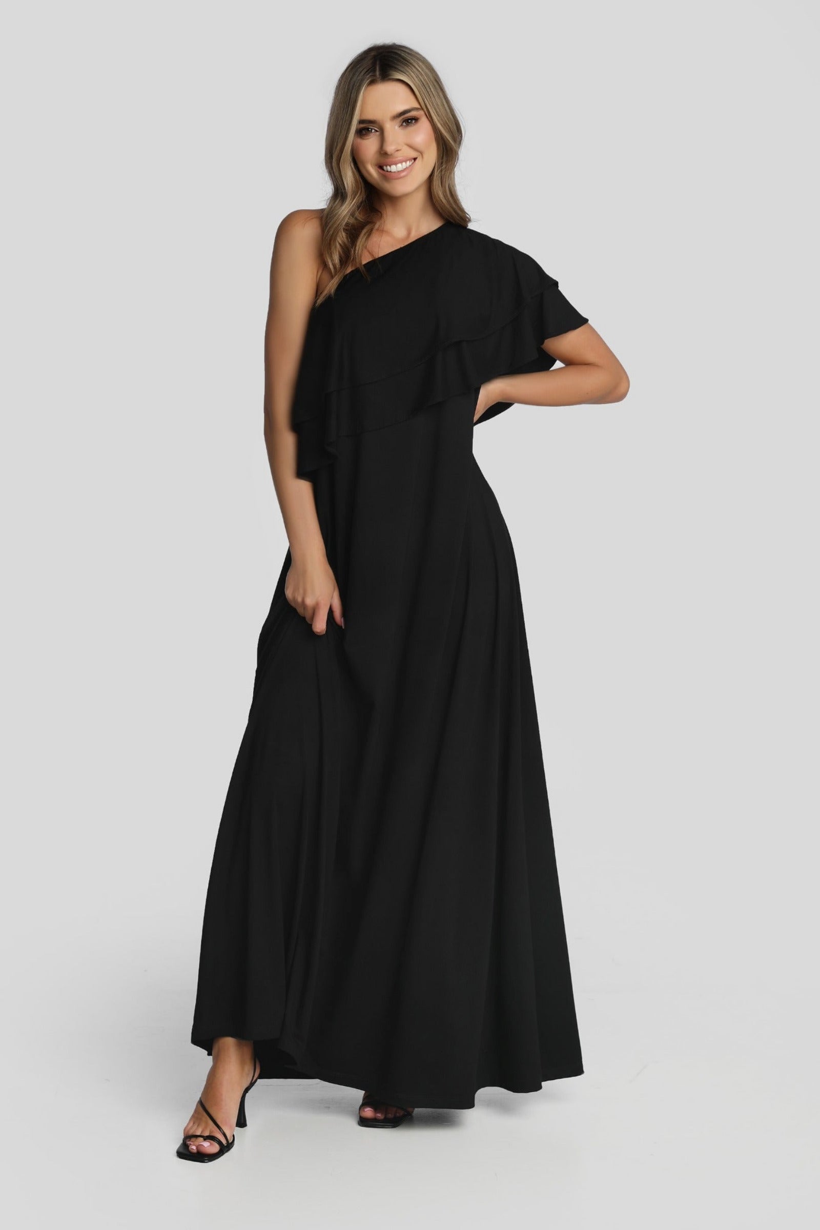 Luźna sukienka maxi na jedno o ramię uszyta z prawie 5 metrów miękkiej, delikatnej i przewiewnej polskiej dzianiny wiskozowej o gramaturze 220g/m2. Sukienka rozszerza się mocno ku dołowi, dzięki czemu w ruchu jest tak efektowna. Nie oszczędzałyśmy na efekcie WOW!