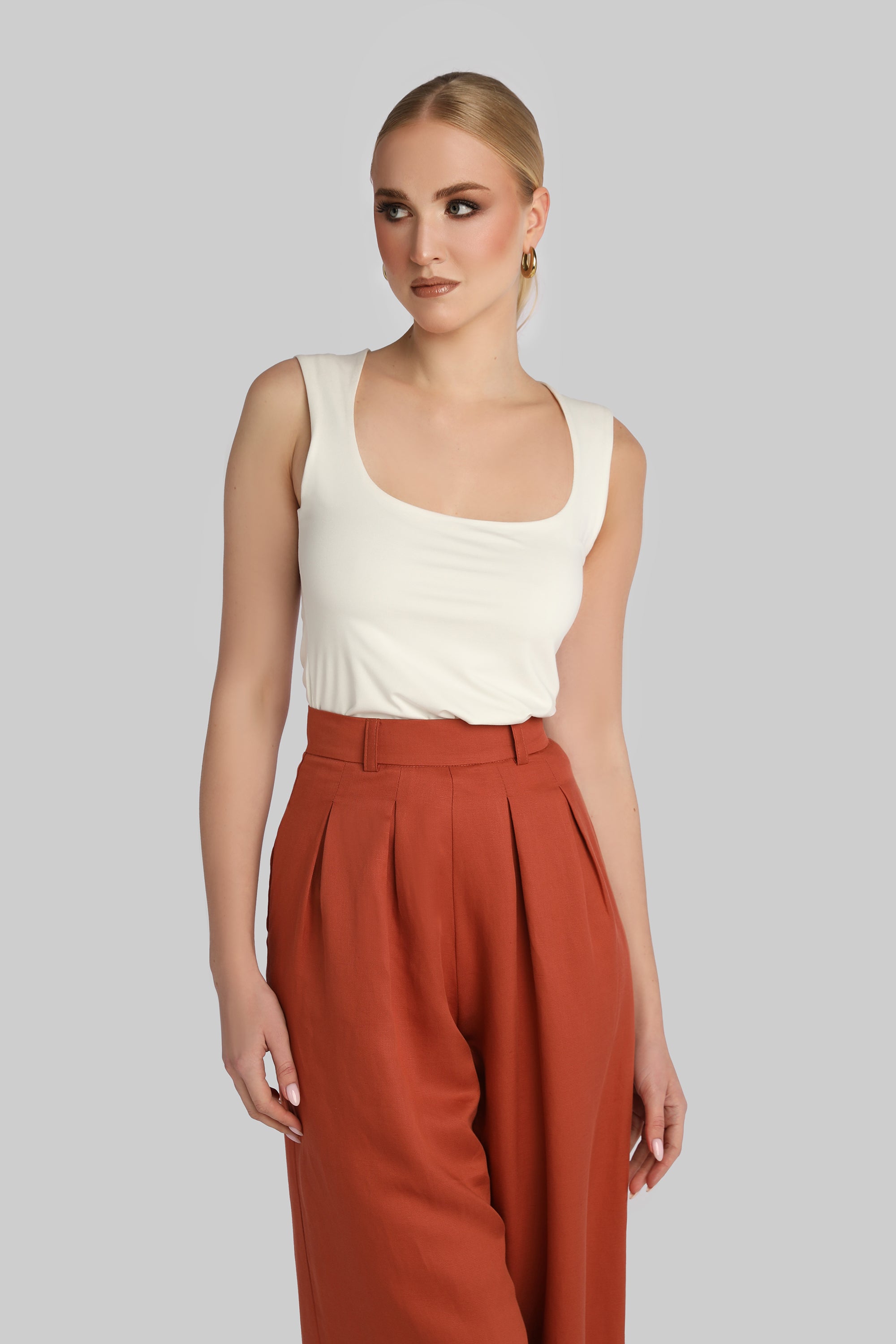 Elegancki, dopasowany do sylwetki top. Został uszyty z podwójnej warstwy wiskozy o gramaturze 220g/m2 dzięki czemu jego wykończenie jest delikatne i gładkie. Ma dekolt typu karo z lekkim twistem (rozszerza się ku dołowi).