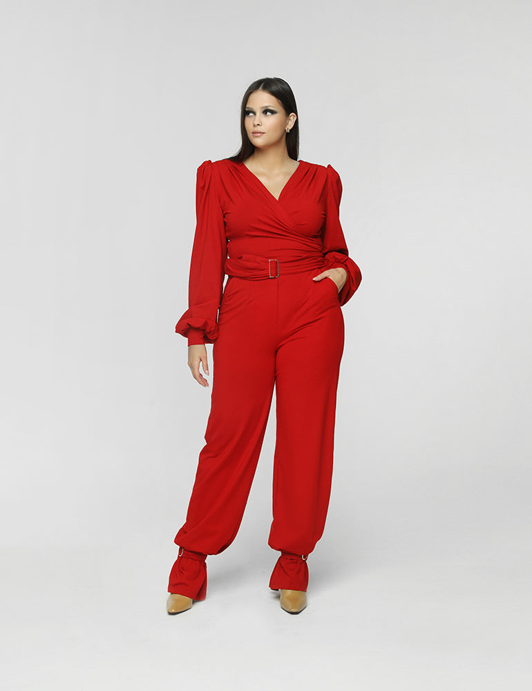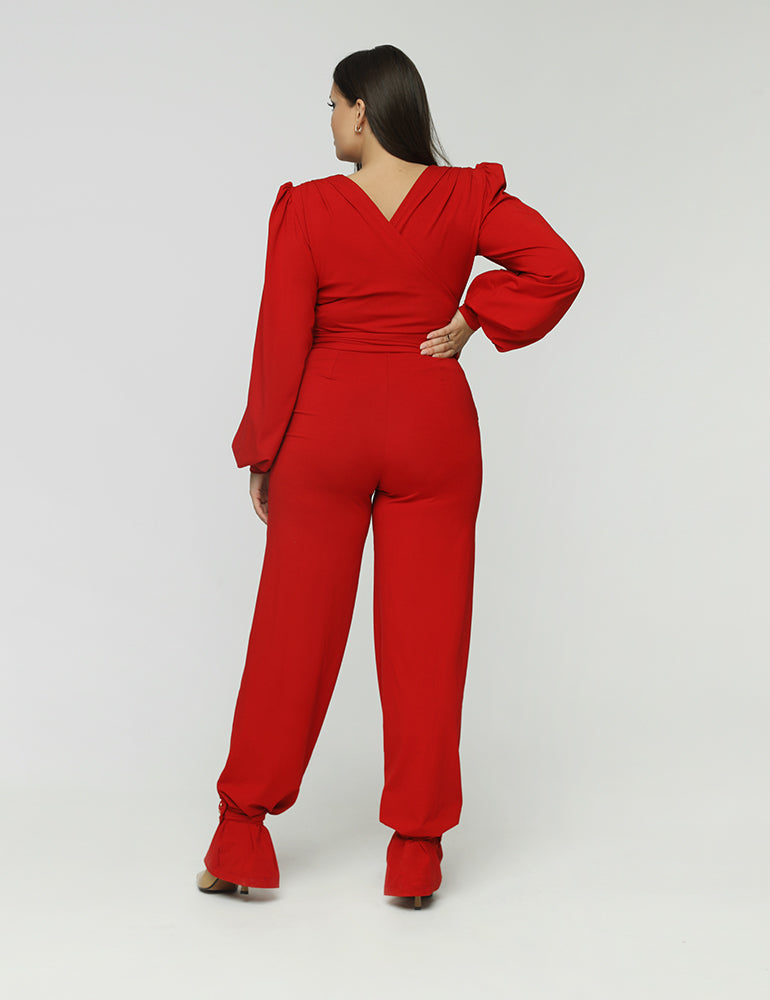 Kombinezon z drapowaną, kopertową górą. Jego bufiaste rękawy zostały dodatkowo podkreślone wszytymi wkładami barkowymi. Nogawki można wystylizować na 2 sposoby: pozostawić proste i eleganckie lub użyć opasek ze sprzączkami dołączonych do zestawu w celu zbluzowania nogawek. Kombinezon ma kieszenie w szwach bocznych.