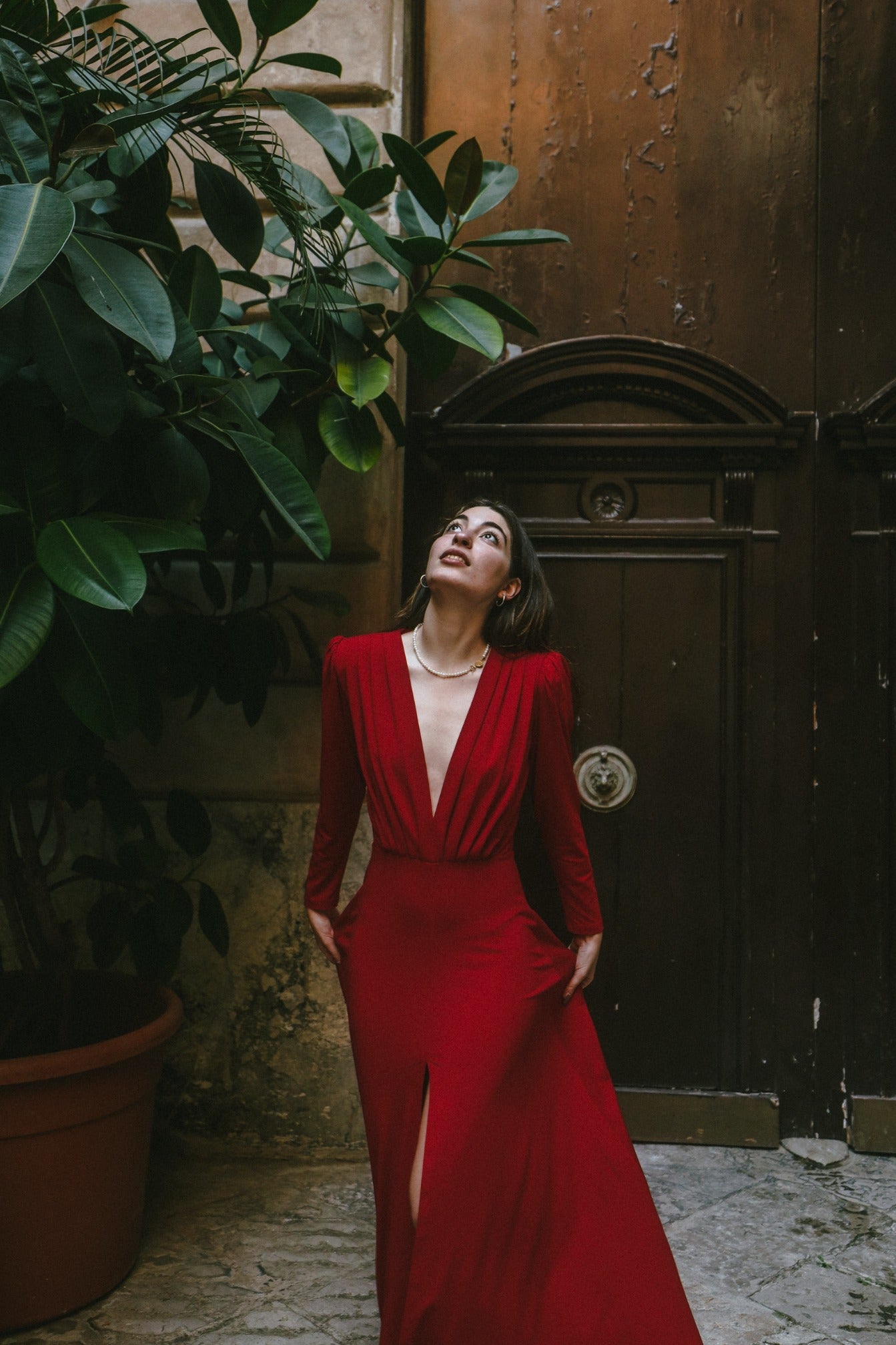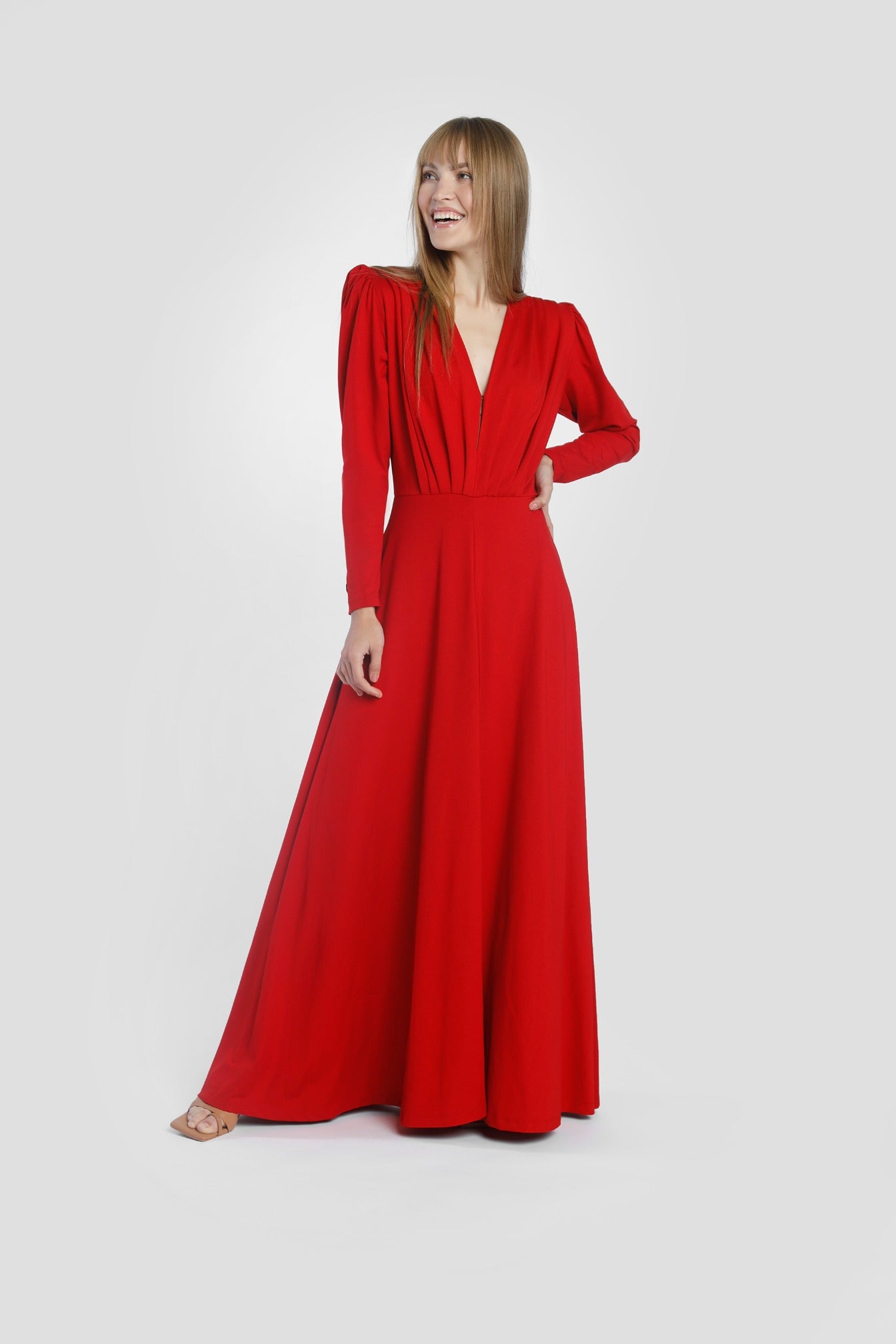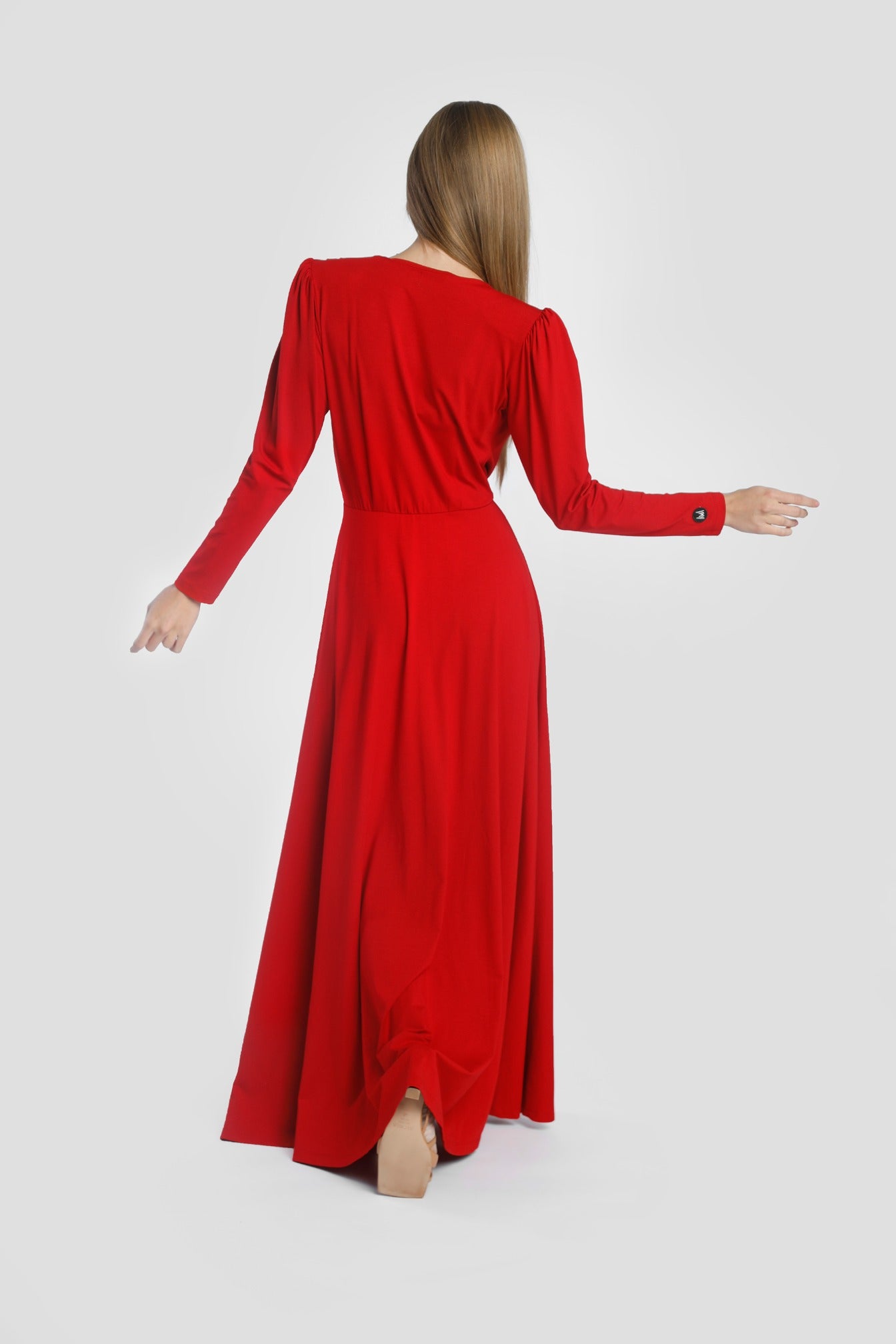 Sukienka o długości maxi z rozkloszowanym dołem w kształcie litery A z rozcięciem na środku. Dekolt jest regulowany haftką, którą możesz zapiąć gdy potrzebujesz zmniejszyć dekolt. Bufiaste rękawy w stylu lat 70’ są dodatkowo podkreślone wkładami barkowymi.