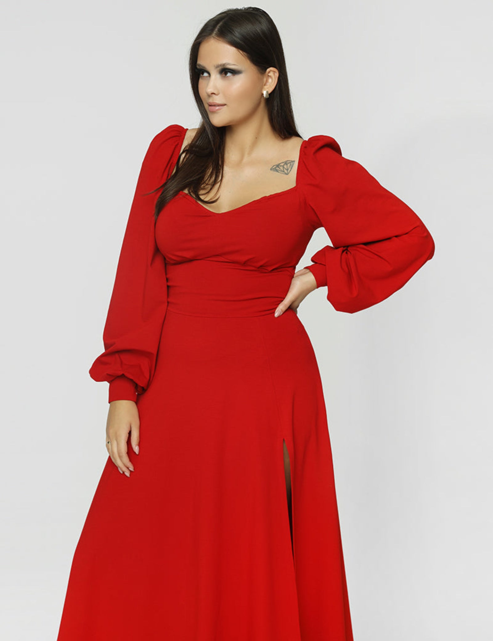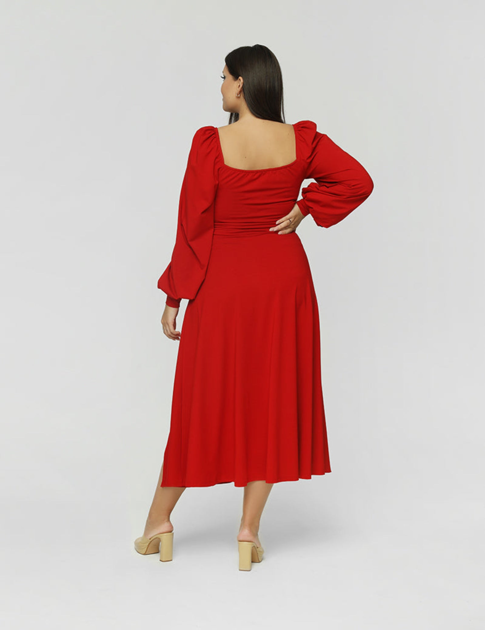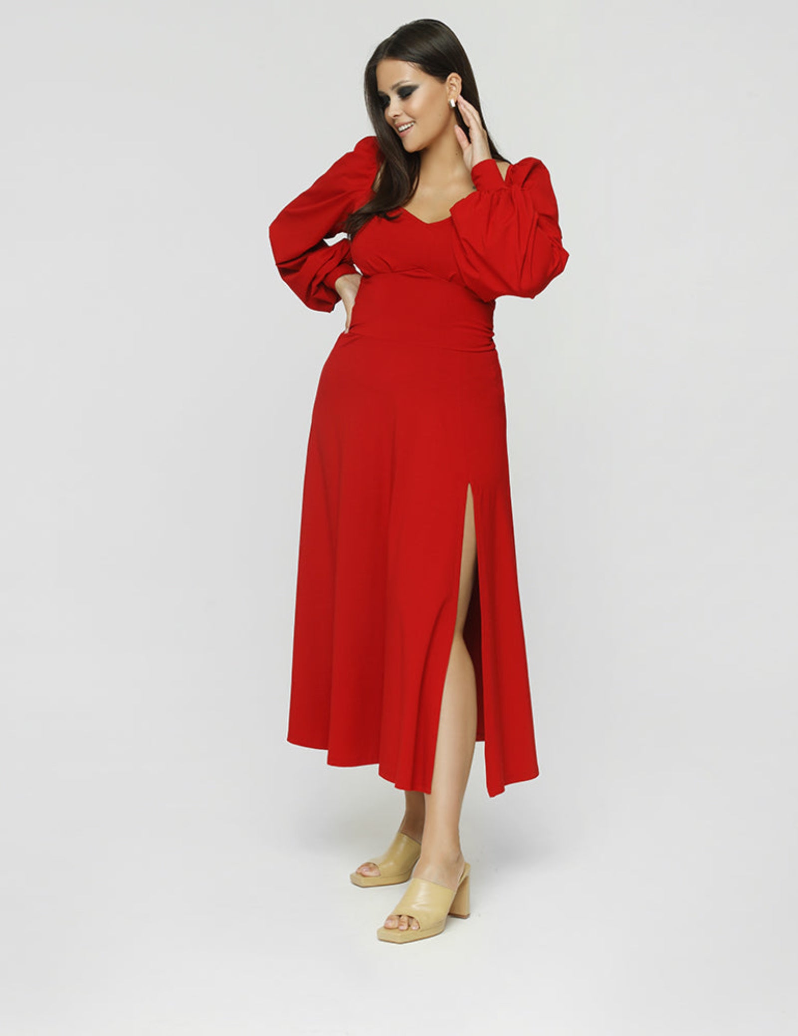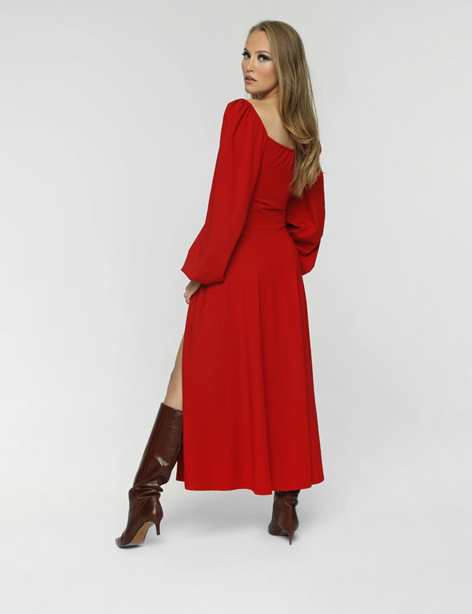 Sukienka z ultra-kobiecą góra, którą można nosić na 2 sposoby: zasłaniając lub odkrywając ramiona. Wzdłuż całego dekoltu ma wszytą gumkę, którą można regulować w zależności od potrzeb. Długie bufiaste rękawy są wykończone ściągaczem. Sukienka ma dół w kształcie litery A z rozcięciem.