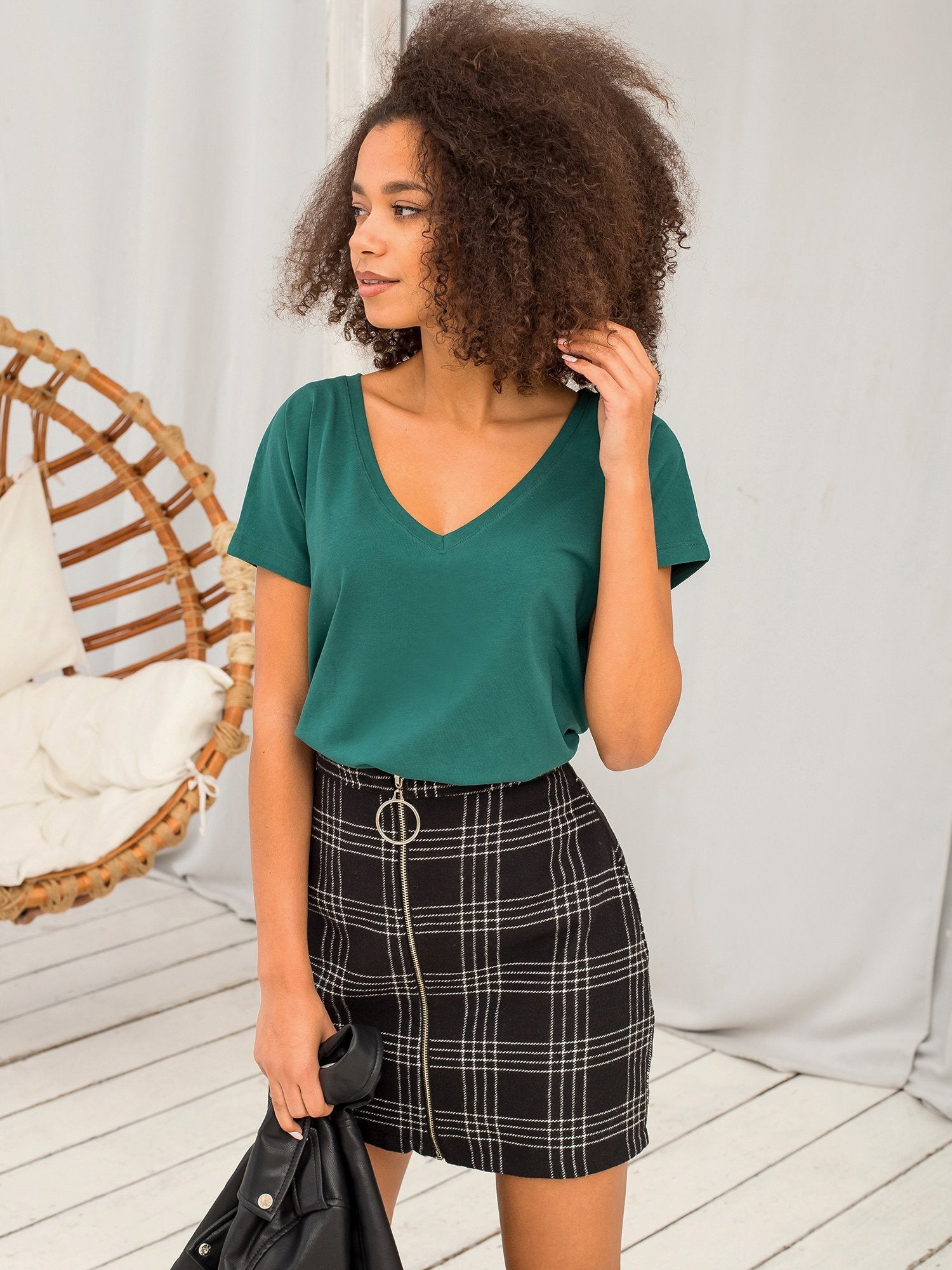 Modelka ma na sobie rozmiar XS. Wymiary modelki: wzrost 175 cm, biust 90 cm, talia 60 cm, biodra 90 cm.