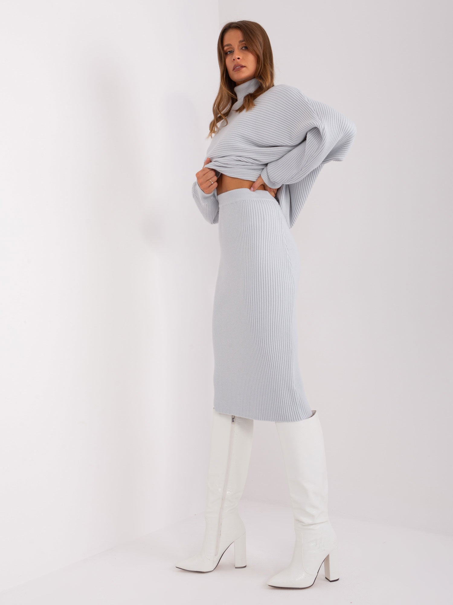 Jasnoszara midi spódnica dzianinowa .