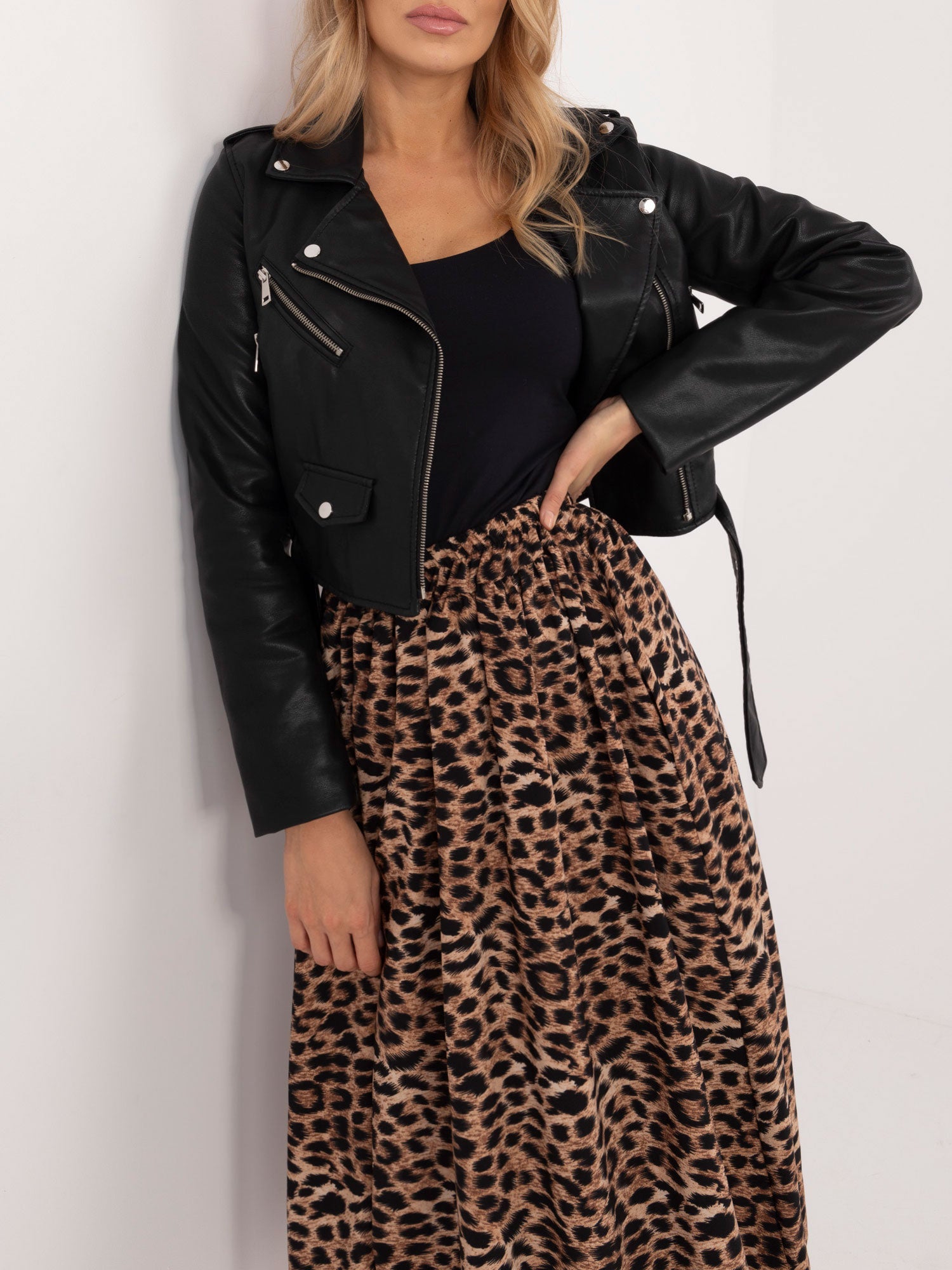 Modelka ma na sobie rozmiar one size. Wymiary modelki: wzrost 175 cm, biust 90 cm, talia 66 cm, biodra 94 cm.