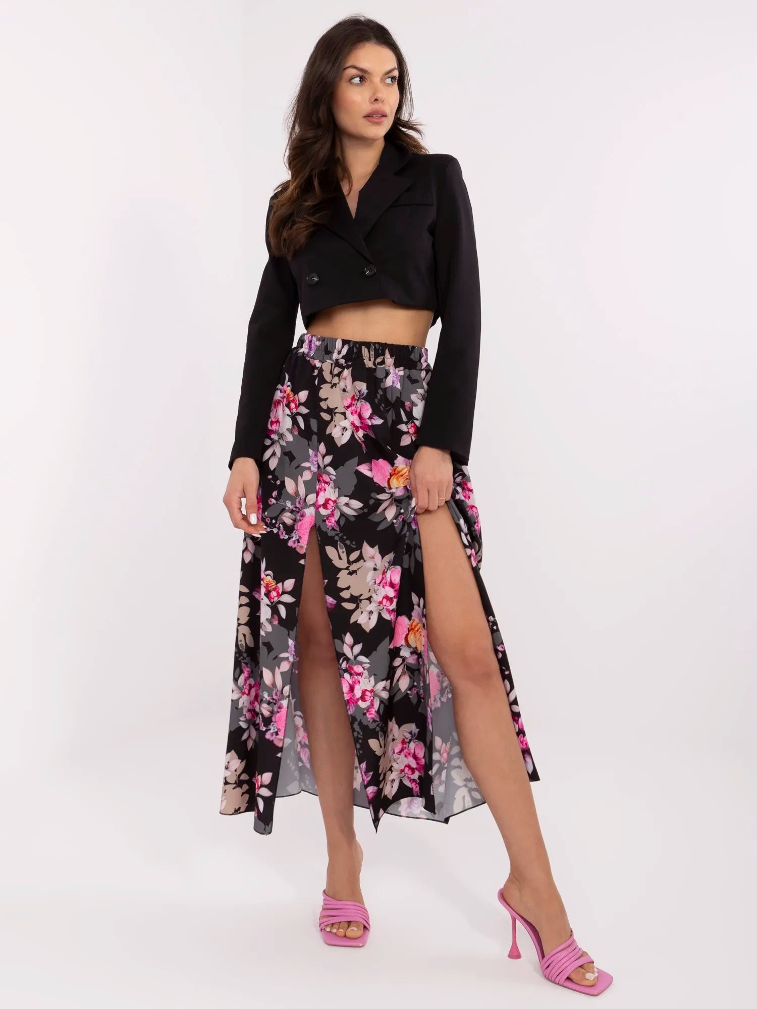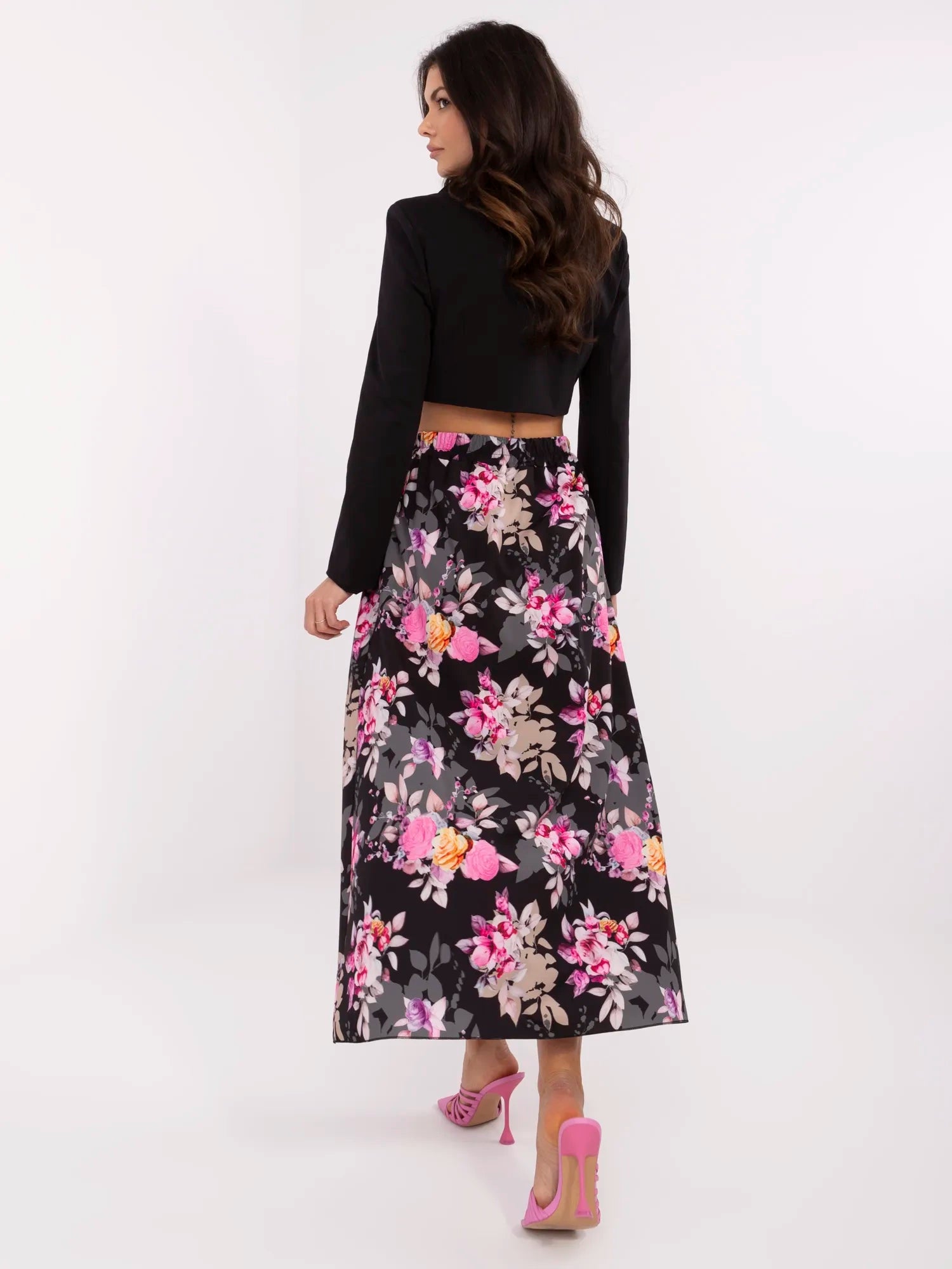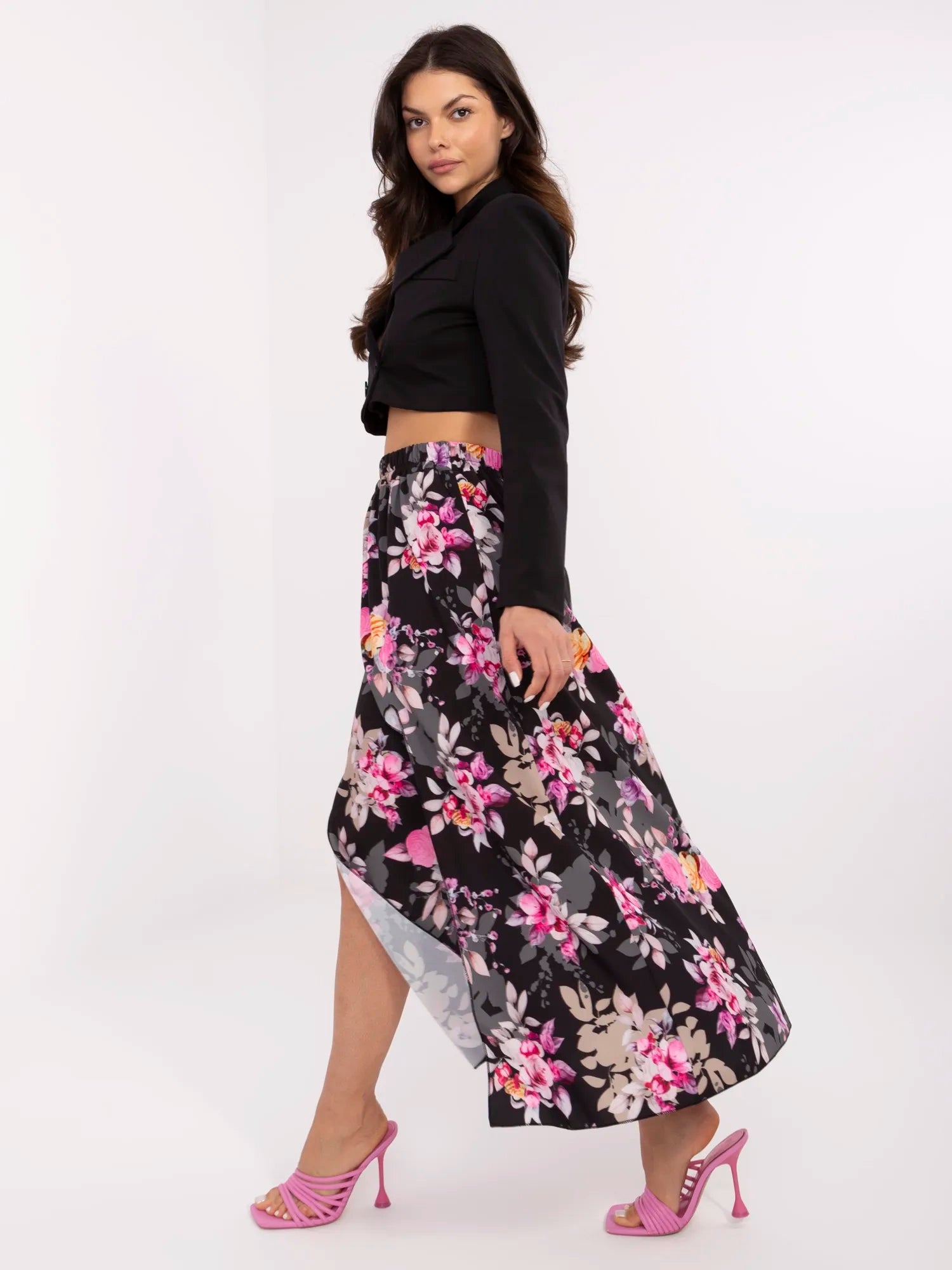 Wymiary spódnicy w rozmiarze one size. mierzone na płasko: szerokość w pasie - 33 cm (na płasko), szerokość w pasie - 50 cm (po rozciągnięciu), szerokość w biodrach - 59 cm, długość całkowita - 92 cm.