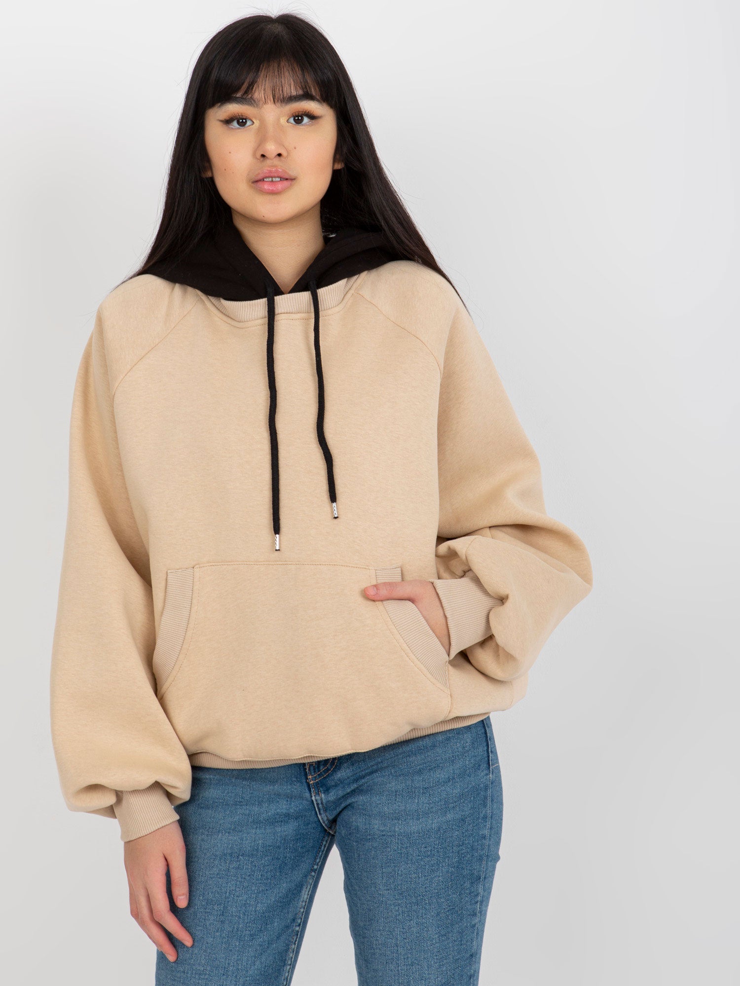 Beżowo-czarna luźna dresowa bluza basic z kapturem .
