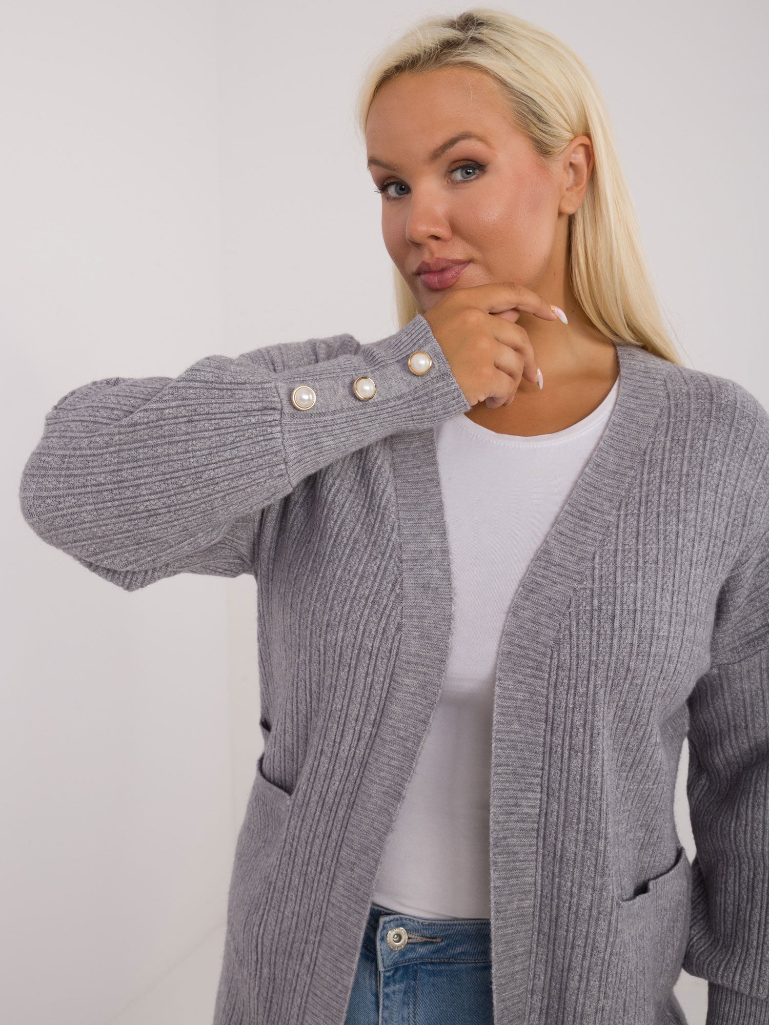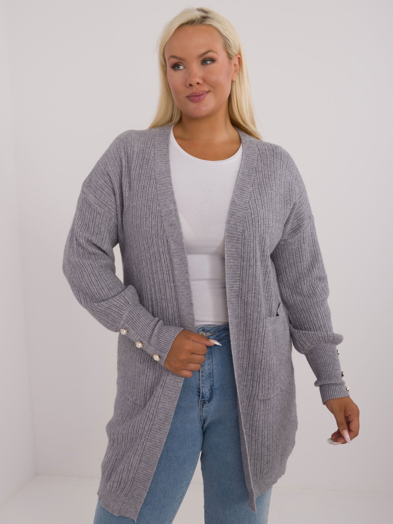 Modelka ma na sobie rozmiar XL/XXL. Wymiary modelki: wzrost 172 cm, biust 103 cm, talia 73 cm, biodra 103 cm.