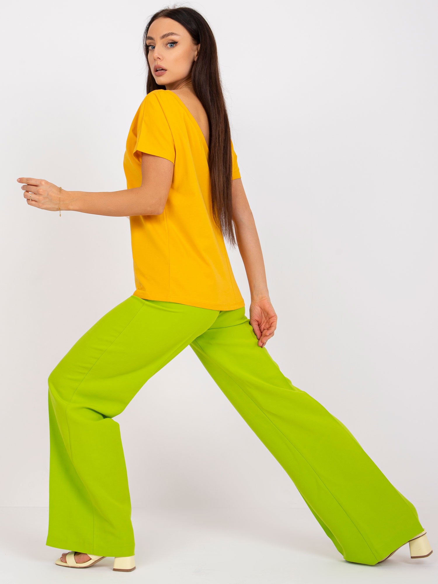 Ciemnożółty t-shirt damski Fire . Damskie t-shirty basic są już kultowymi ubraniami, które każda kobieta chce mieć w swojej szafie. Jeśli jeszcze nie masz odpowiednio obszernej kolekcji basic'ów to zmień to z nami jak najszybciej, a Twoje codzienne stylizacje zyskają nutę klasycznego szyku. Pozwalają one budować rozmaite stylizacje, które z powodzeniem sprawdzają się w różnych sytuacjach, nie tylko tych typowo casualowych, ale także i nieco bardziej wyjściowych. T-shirty basic są doskonałe do szkoły, na uczelnię czy spotkania ze znajomymi, ale pójdziesz w nich również do pracy lub na półformalny meeting biznesowy z cygaretkami i elegancką marynarką w roli głównej. Ten t-shirt damski basic noś tak jak lubisz: gdy jest ciepło załóż go do szortów lub spódnicy, a jeśli jest chłodno to włóż długie spodnie i zarzuć na ramiona kardigan lub rozpinaną bluzę. Taka luźna koszulka jest jak kameleon, ponieważ idealnie dopasowuje się do każdej stylizacji, jaka przyjdzie Ci do głowy. Wygląda świetnie noszona samodzielnie, ale możesz też założyć na nią modną bomberkę, kurtkę dżinsową czy skórzaną ramoneskę. T-shirt basic oferuje tak duże możliwości stylizacyjne, ponieważ stanowi idealną bazę do ich tworzenia - aby dobrze wyglądać wystarczy tylko zmieniać poszczególne elementy garderoby, buty i dodatki.