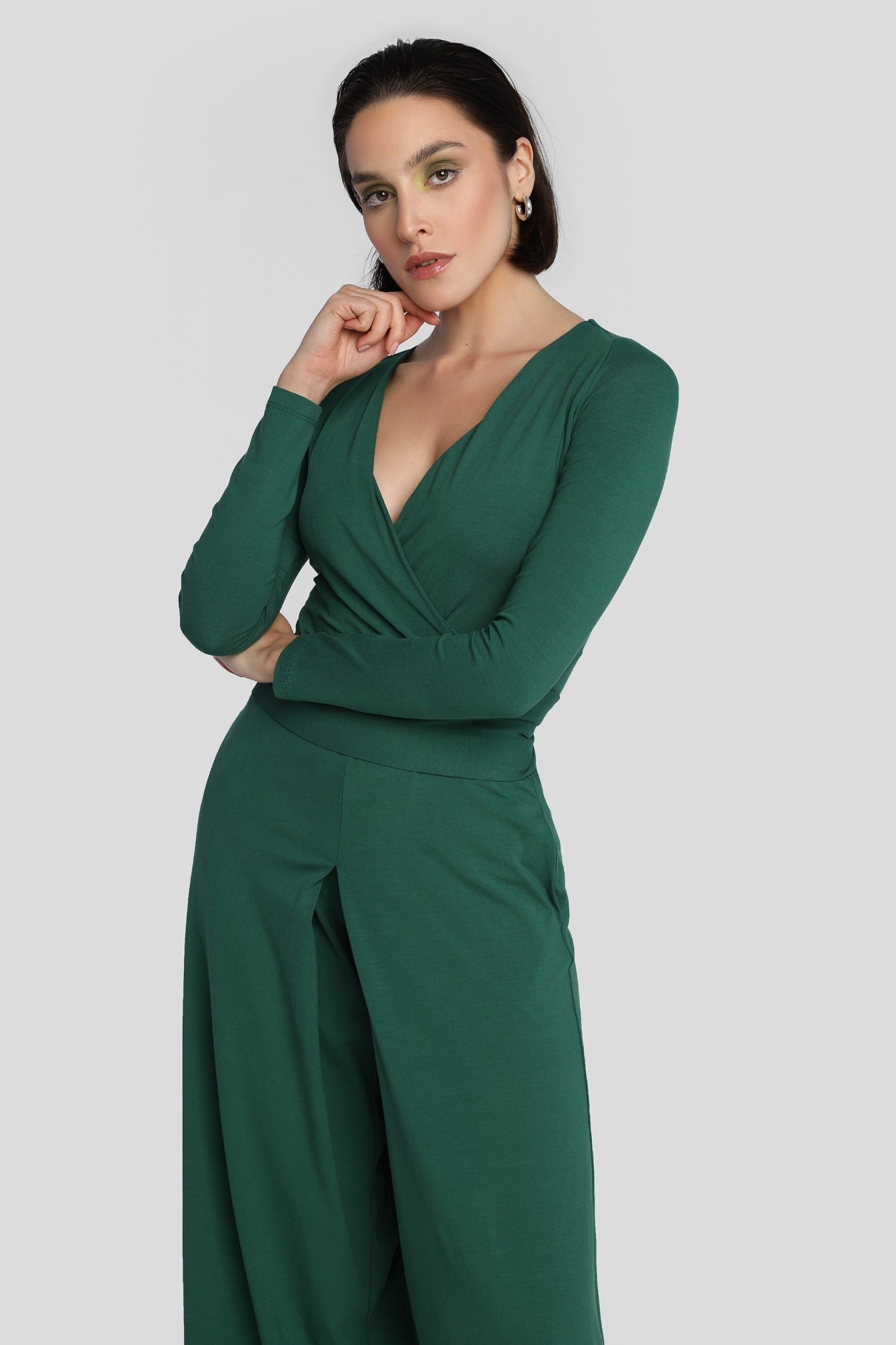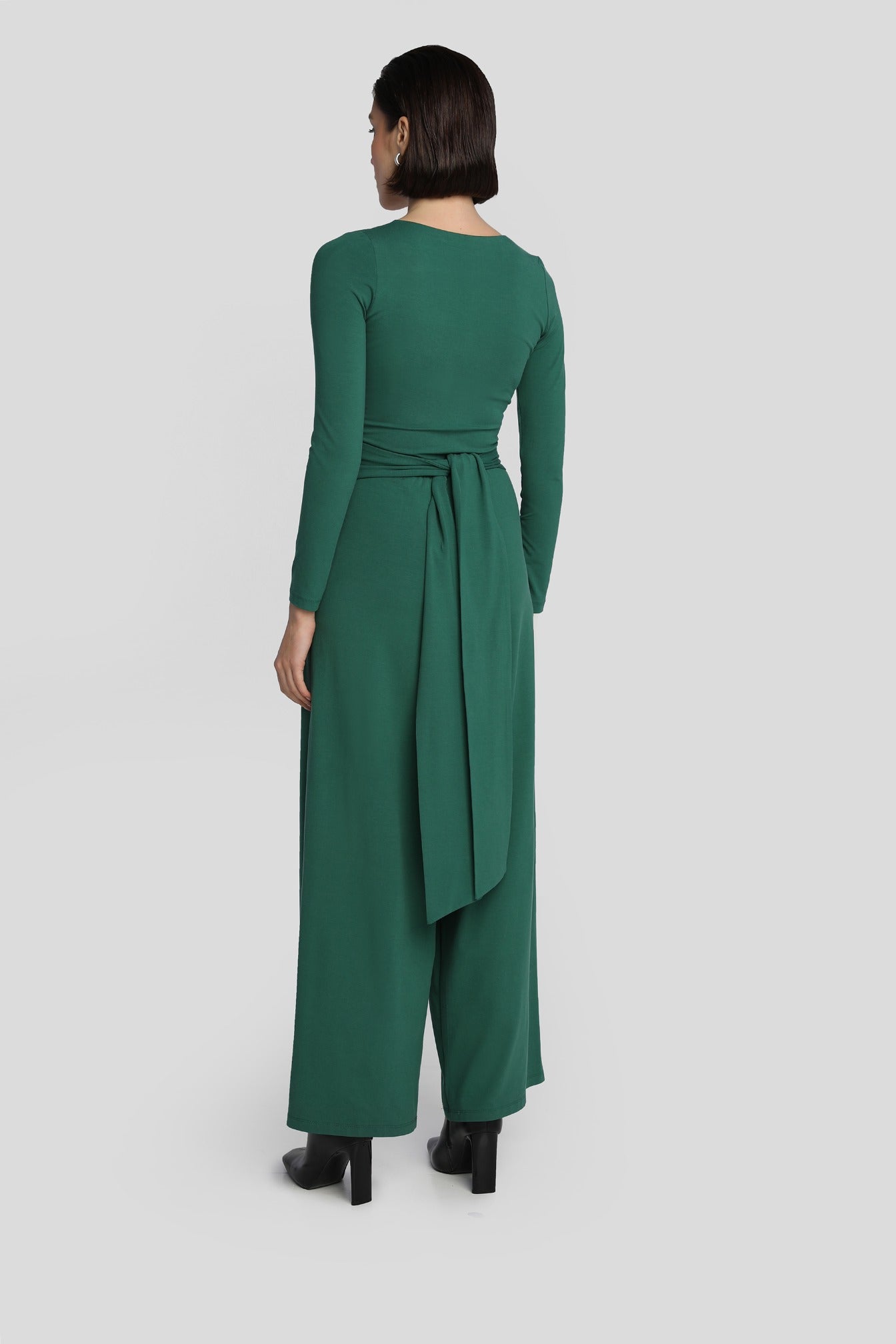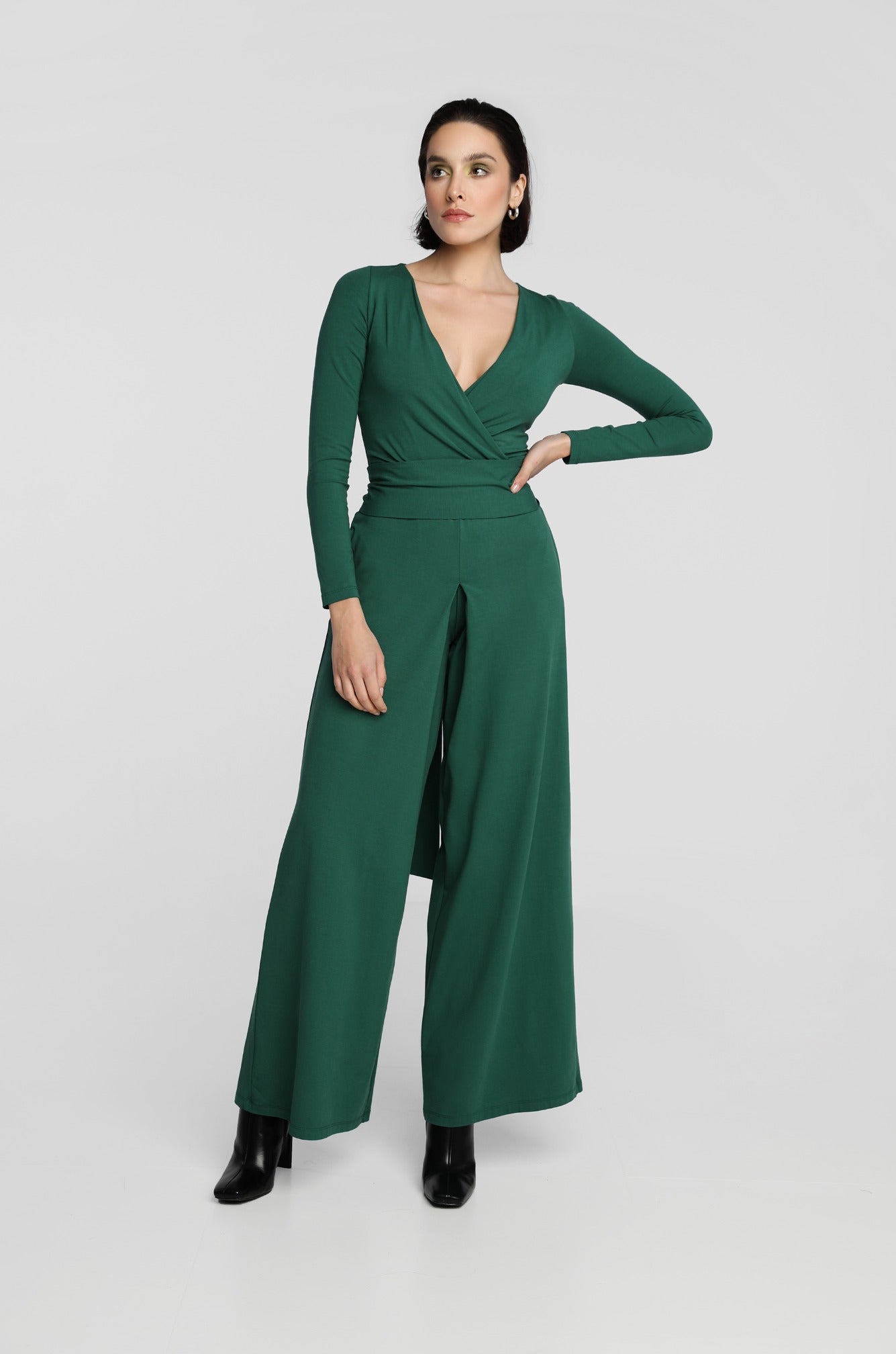 Kombinezon z szerokimi nogawkami i kopertową górą. W talii wszyta jest gumka, dzięki czemu kombinezon świetnie leży w talii. Ma kieszenie wszyte w szwy boczne oraz pasek dołączony do zestawu.