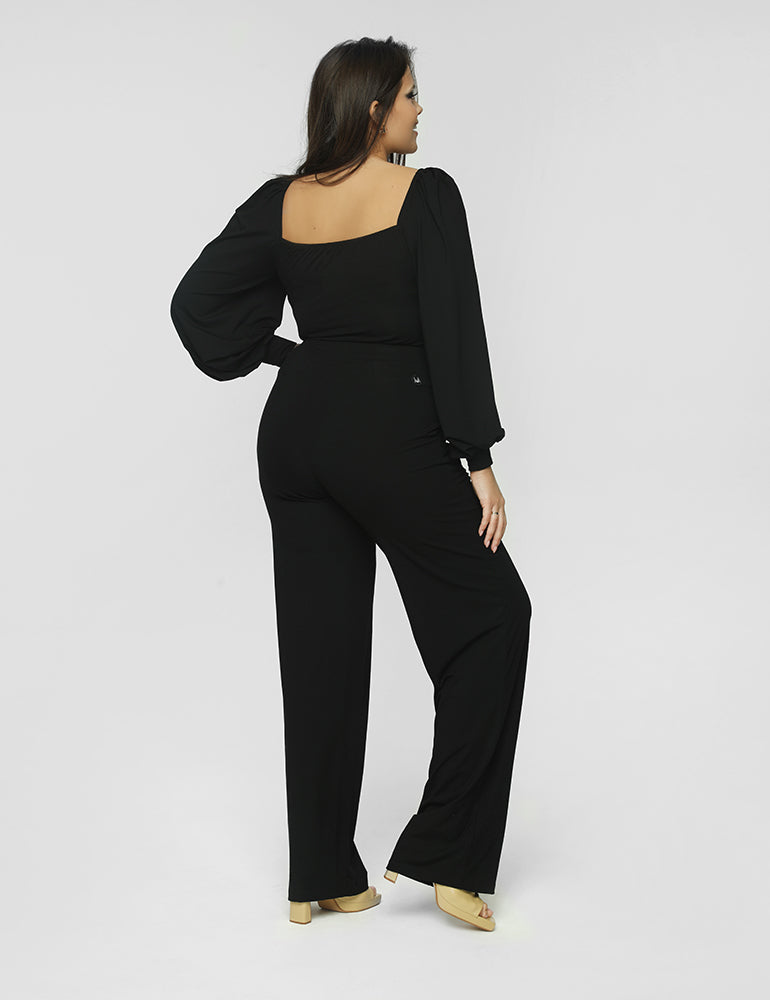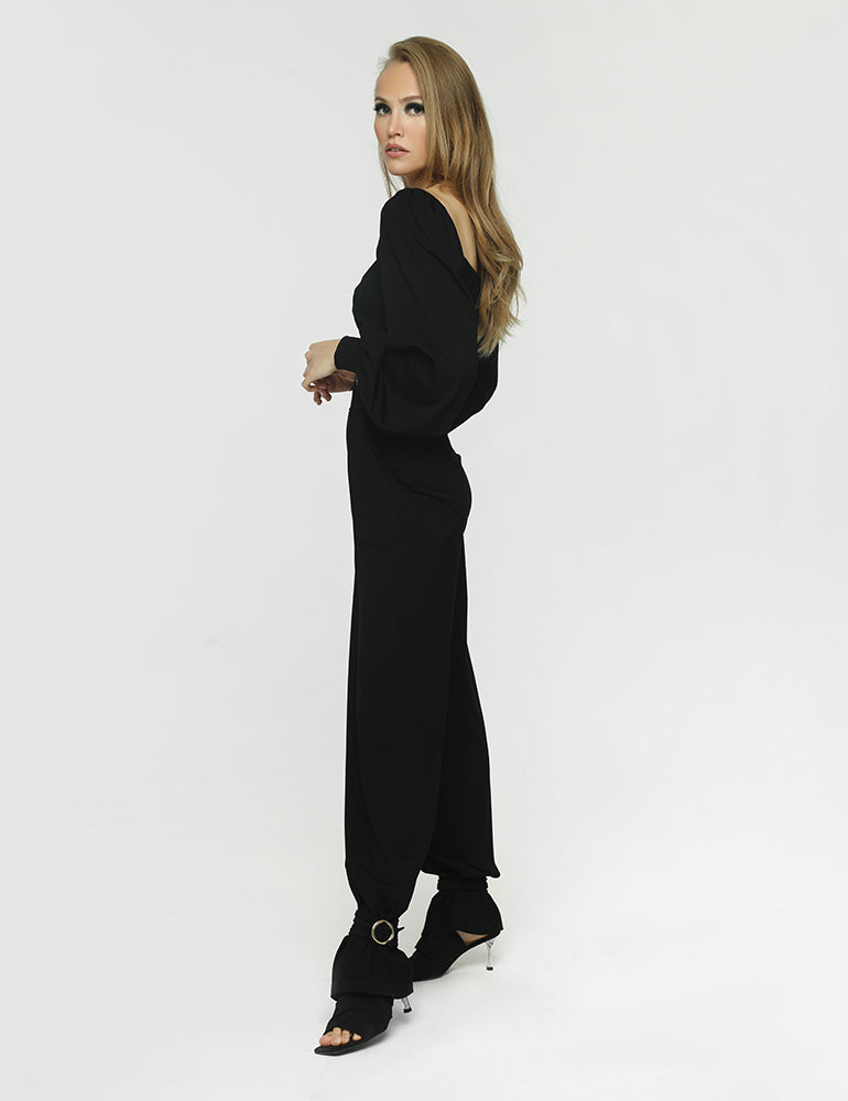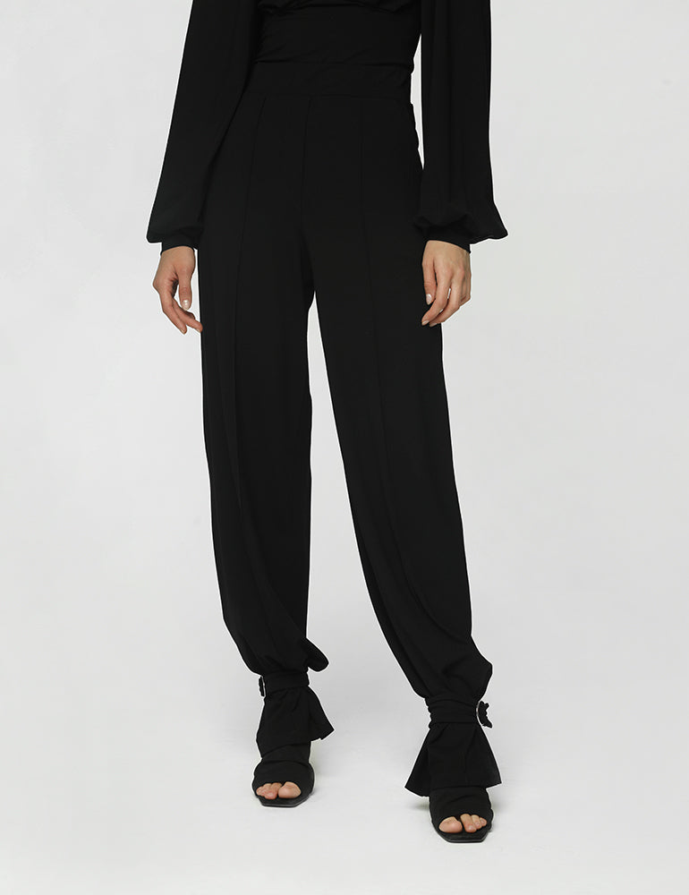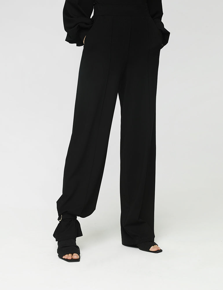 Spodnie z szerokimi nogawkami i kantkami. Nogawki można wystylizować na 2 sposoby: pozostawić proste i eleganckie lub użyć opasek ze sprzączkami dołączonych do zestawu w celu zbluzowania nogawek. Spodnie mają kieszenie w szwach bocznych.