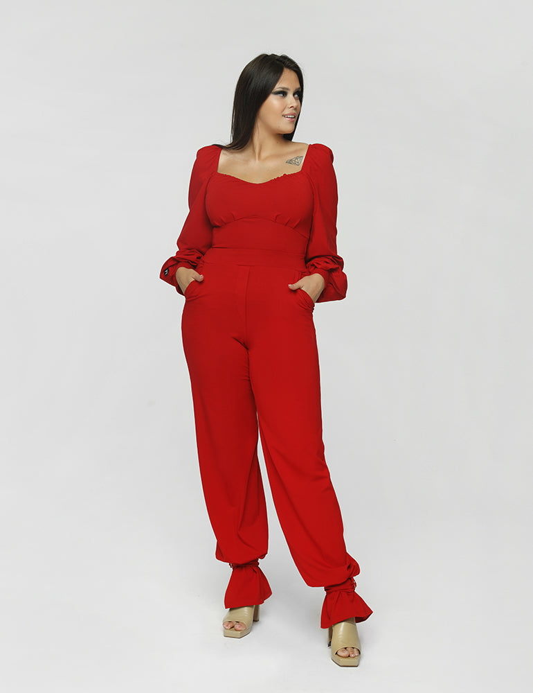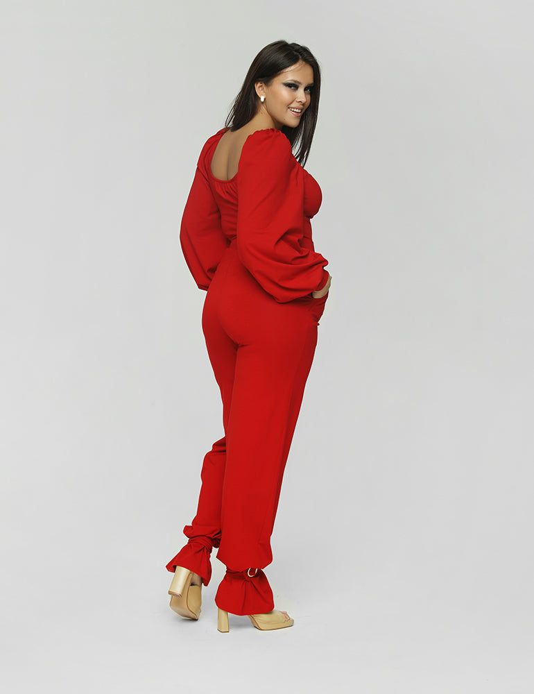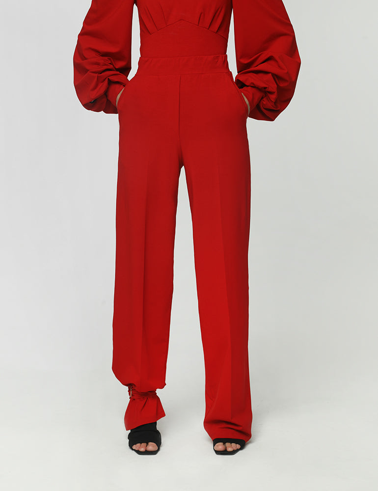 Spodnie z szerokimi nogawkami i kantkami. Nogawki można wystylizować na 2 sposoby: pozostawić proste i eleganckie lub użyć opasek ze sprzączkami dołączonych do zestawu w celu zbluzowania nogawek. Spodnie mają kieszenie w szwach bocznych.