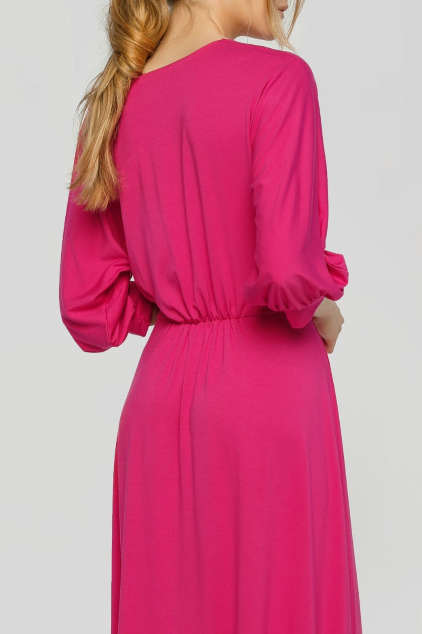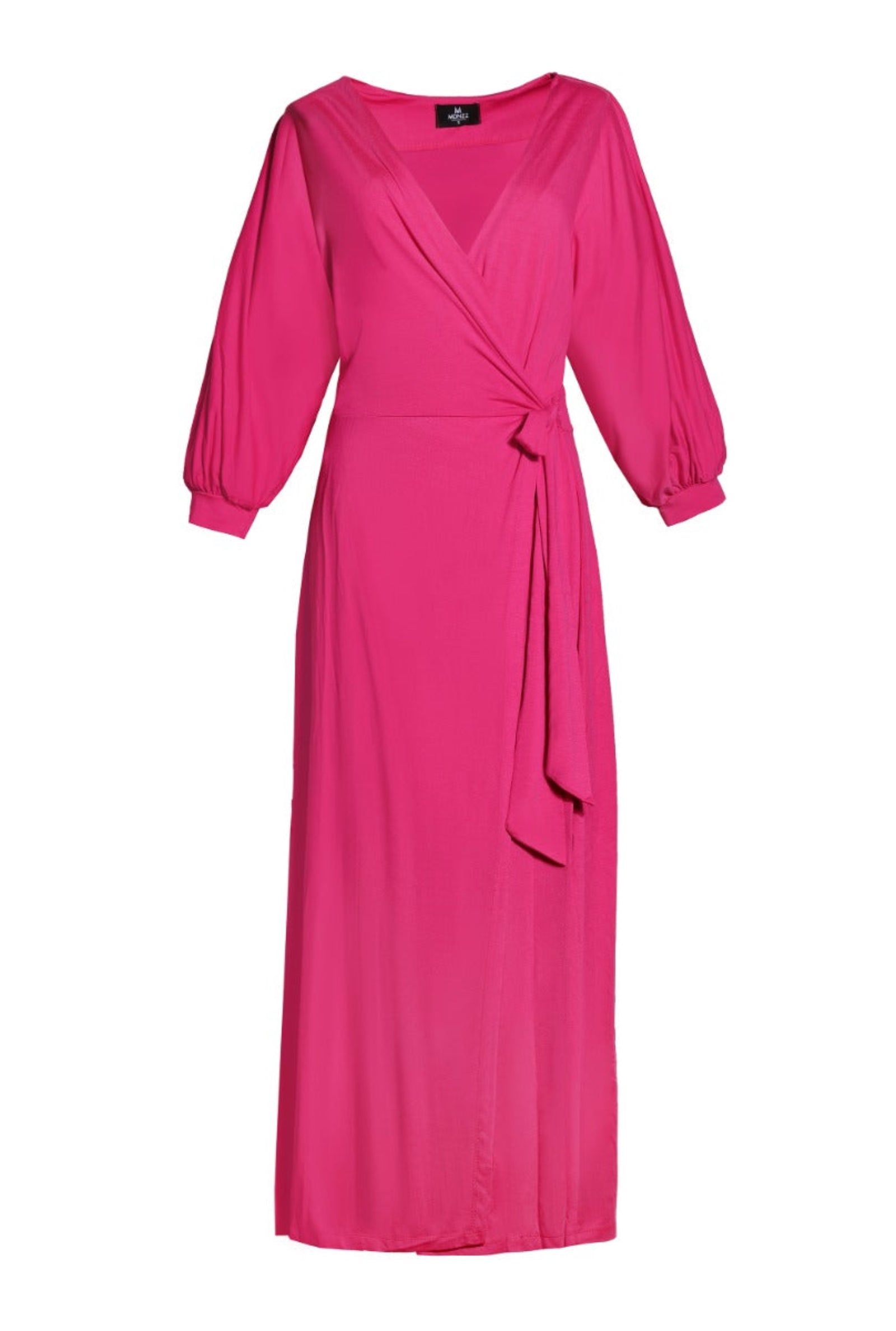 Wiązana, kopertowa sukienka z bufiastymi rękawami. Sukienka jest odcinana w talii. Długość do połowy łydki.
