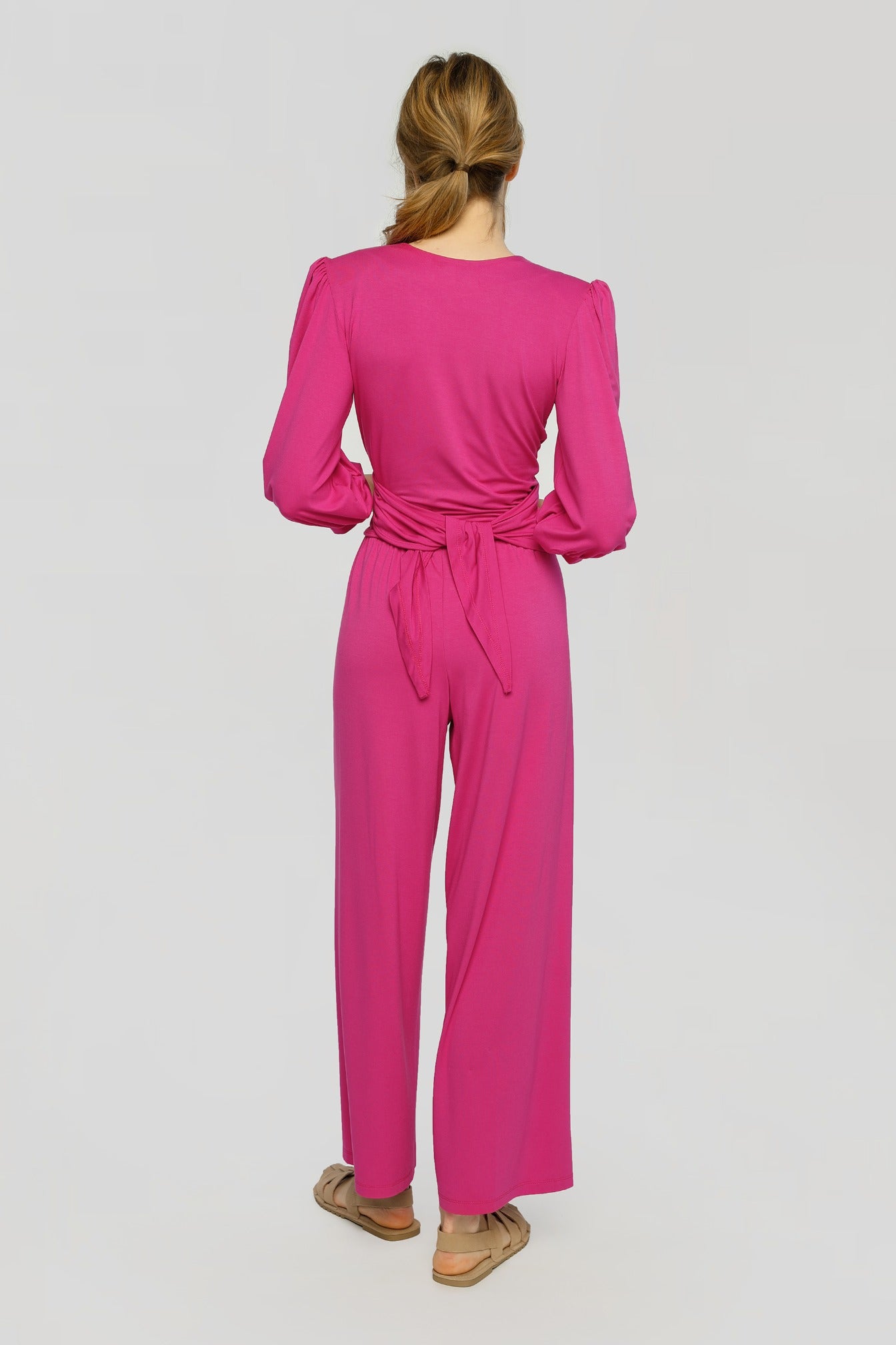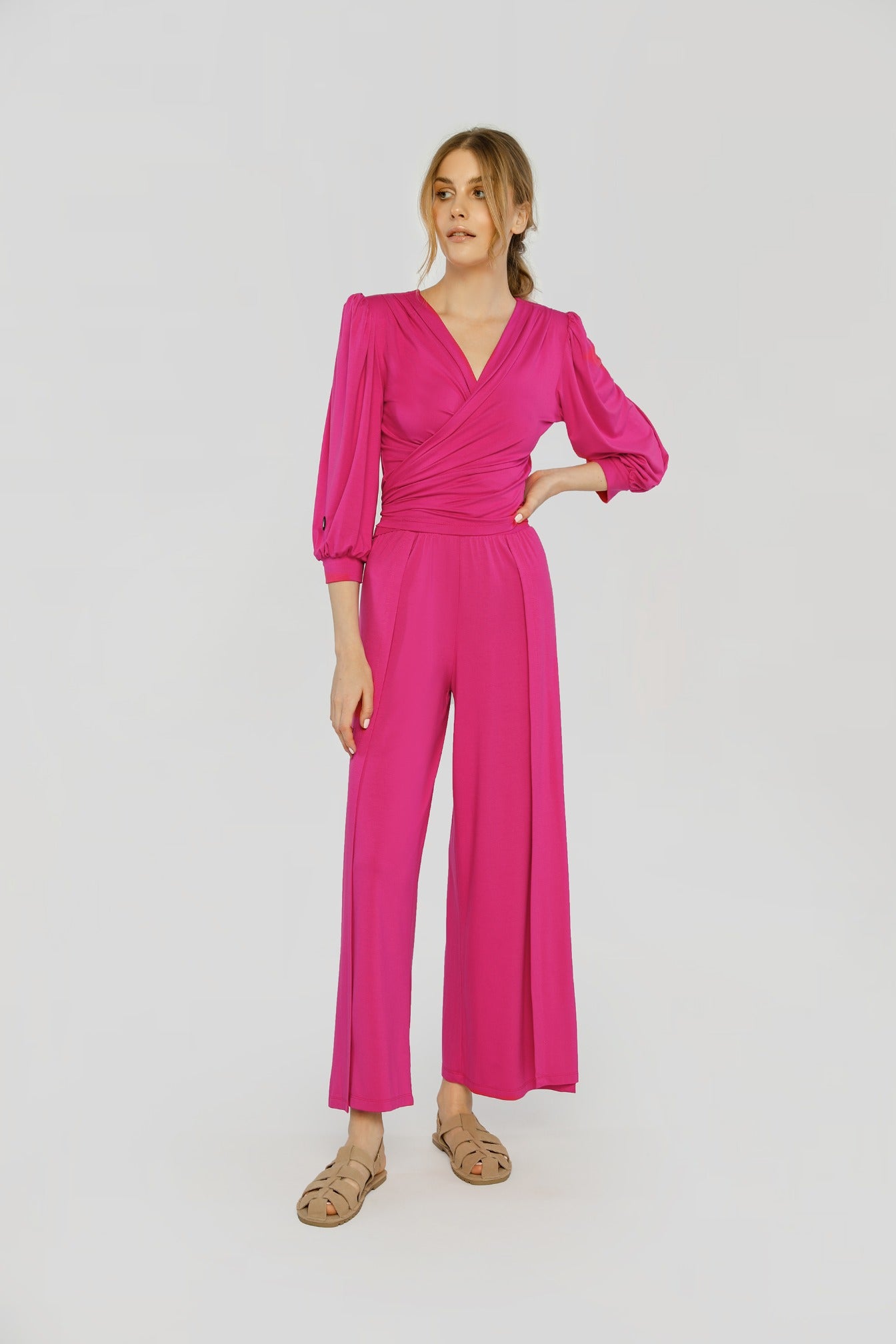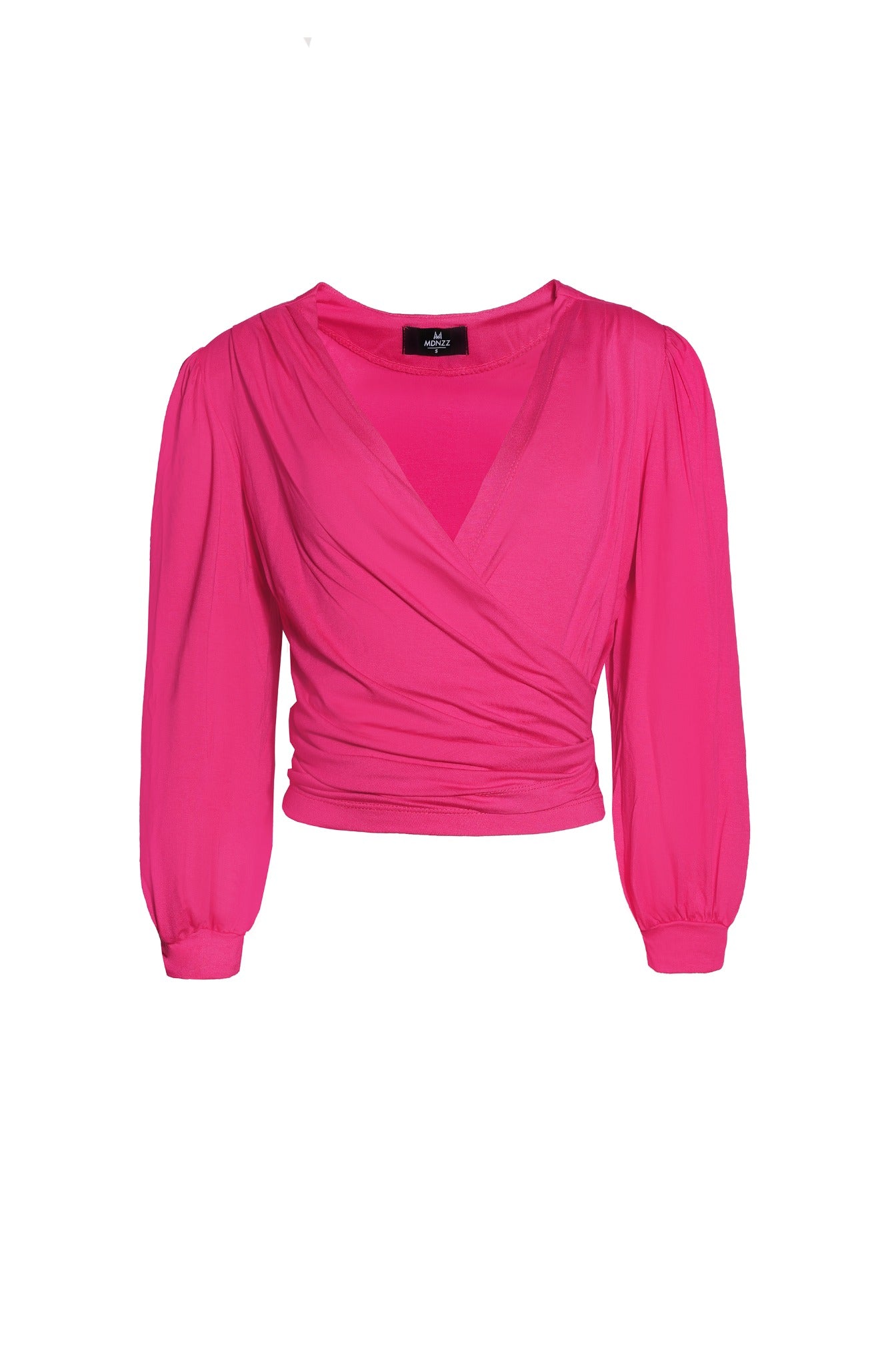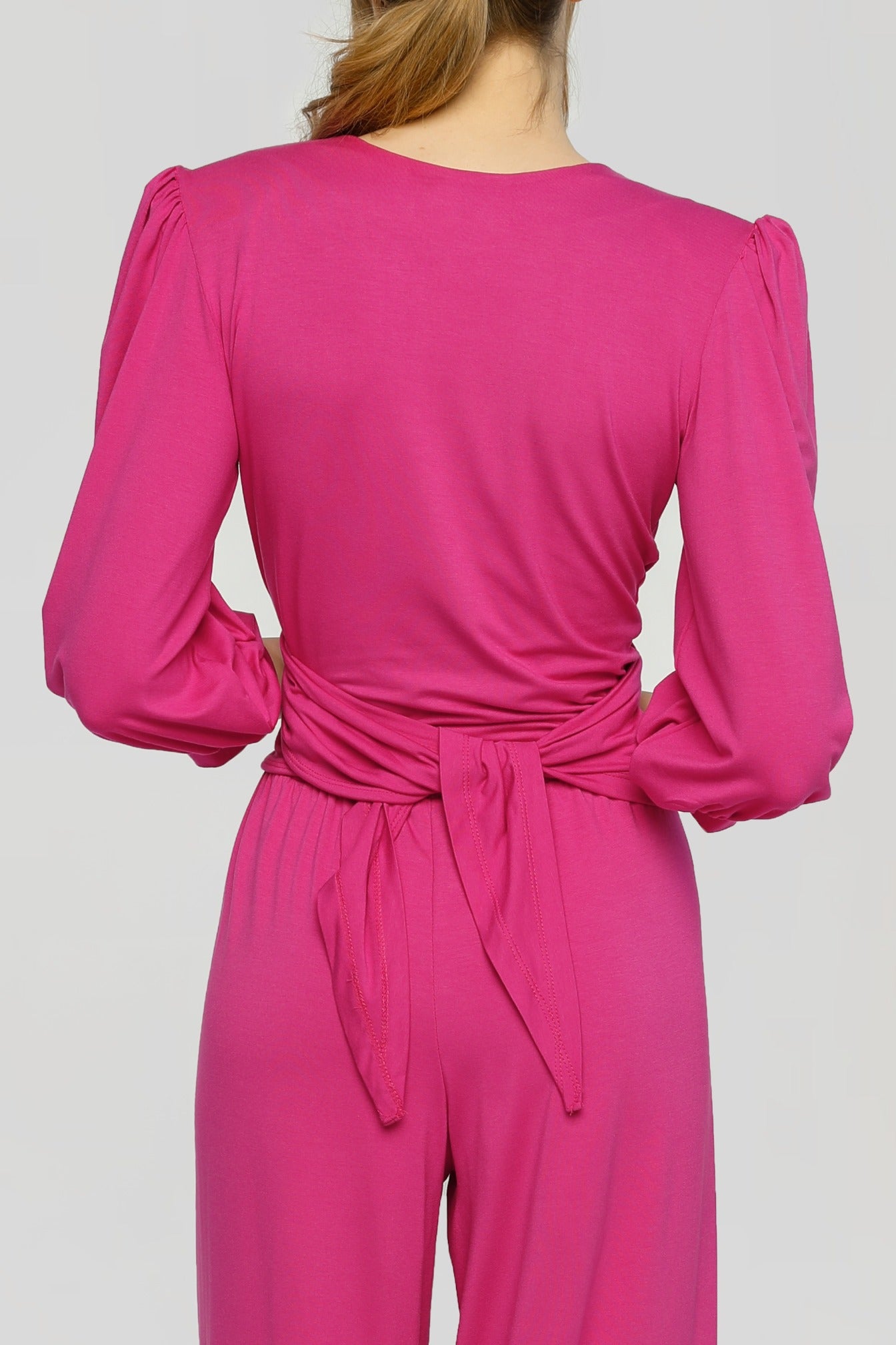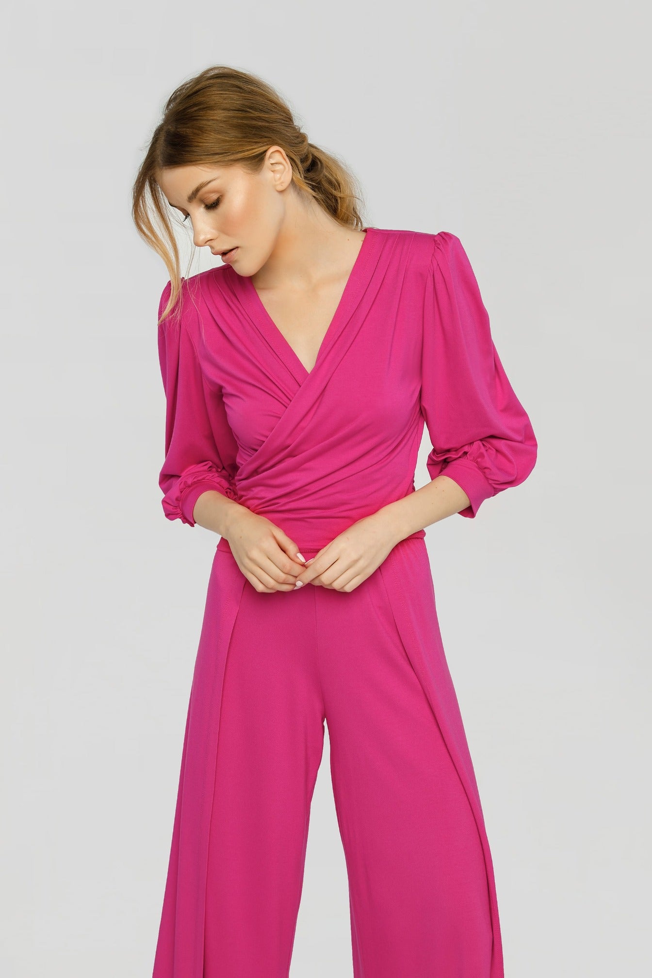 Wielofunkcyjna, kopertowa bluzka, która może być wiązana zarówno z przodu, jak i z tyłu. Kopertowe zakładanie również może być zarówno przodem, jak i tyłem bluzki. Bluzka ma bufiaste rękawy o długości 3/4, dodatkowo wzmocnione wkładami barkowymi.