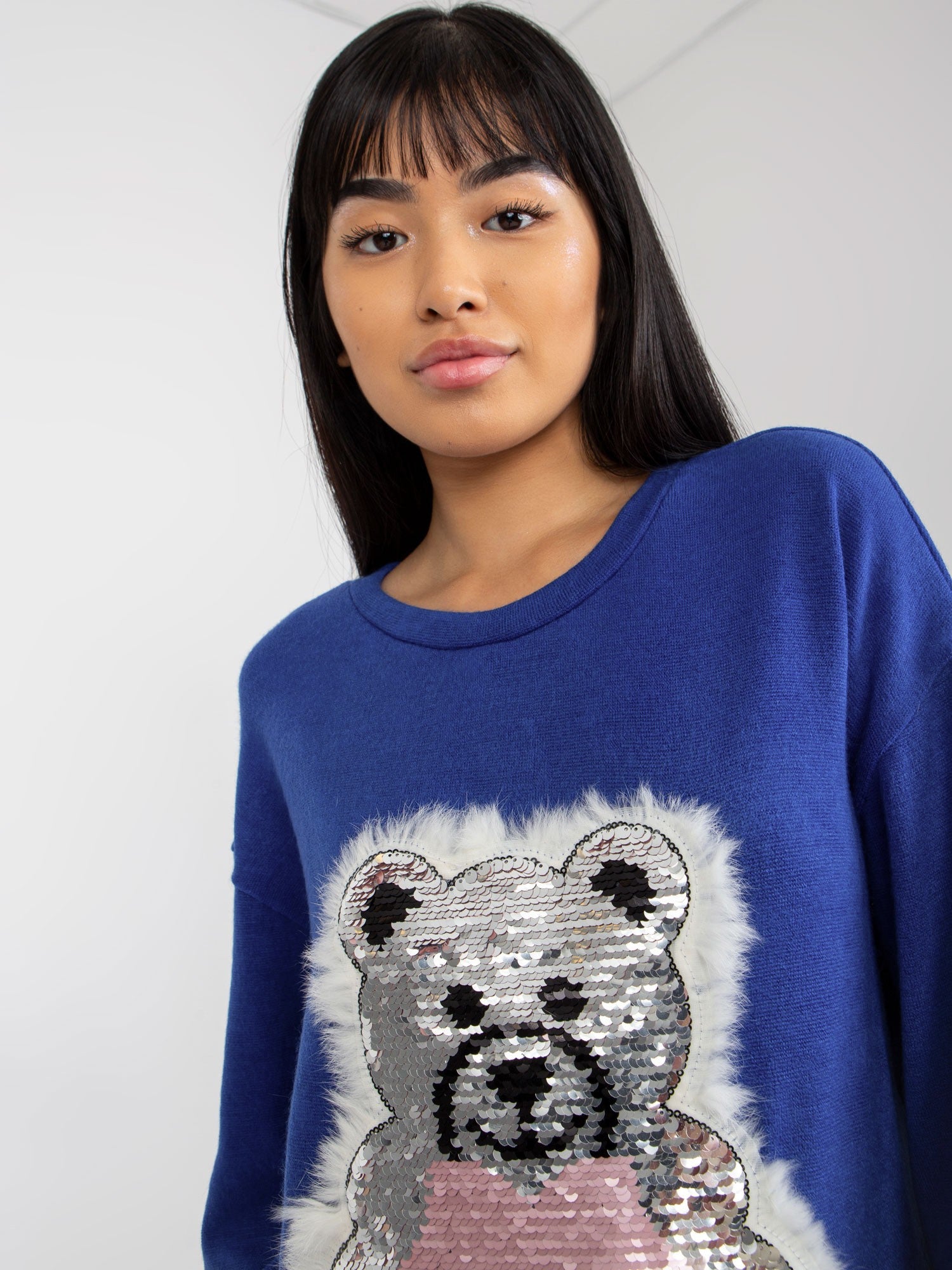 Ciemnoniebieski sweter klasyczny z cekinową aplikacją .