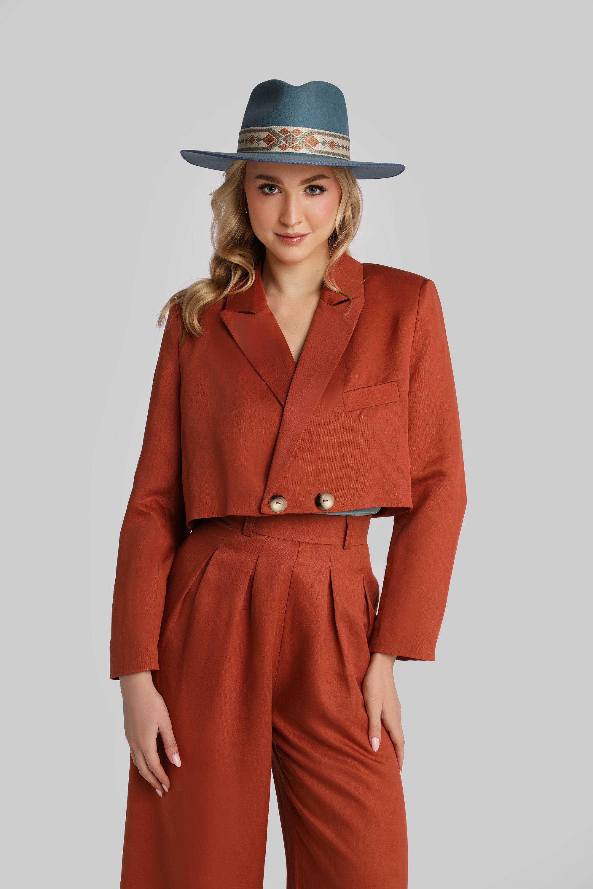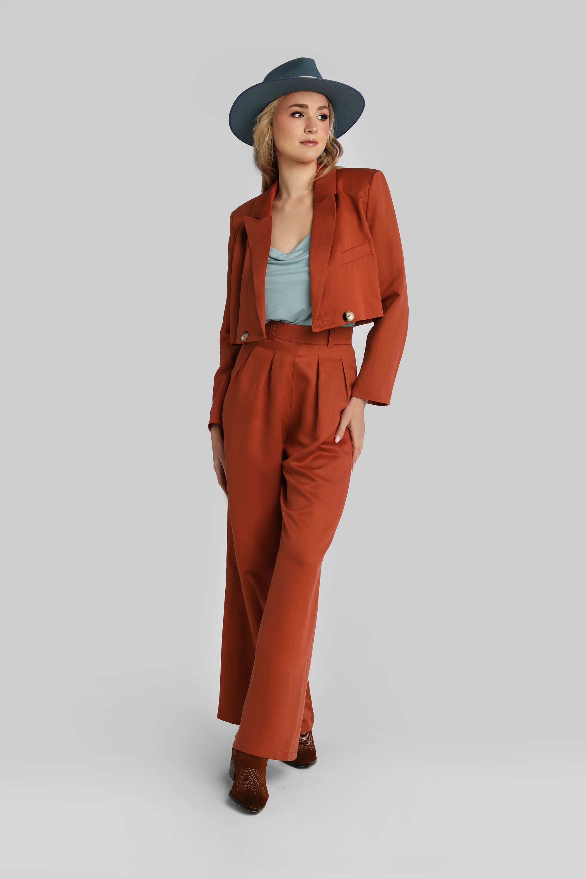 Dwurzędowa marynarka sięgająca do talii. Ma ramiona wzmocnione wkładami barkowymi. Tworzy idealny duet biznesowy ze spodniami Poppy. Razem z Ginger i Poppy możecie podbijać świat!