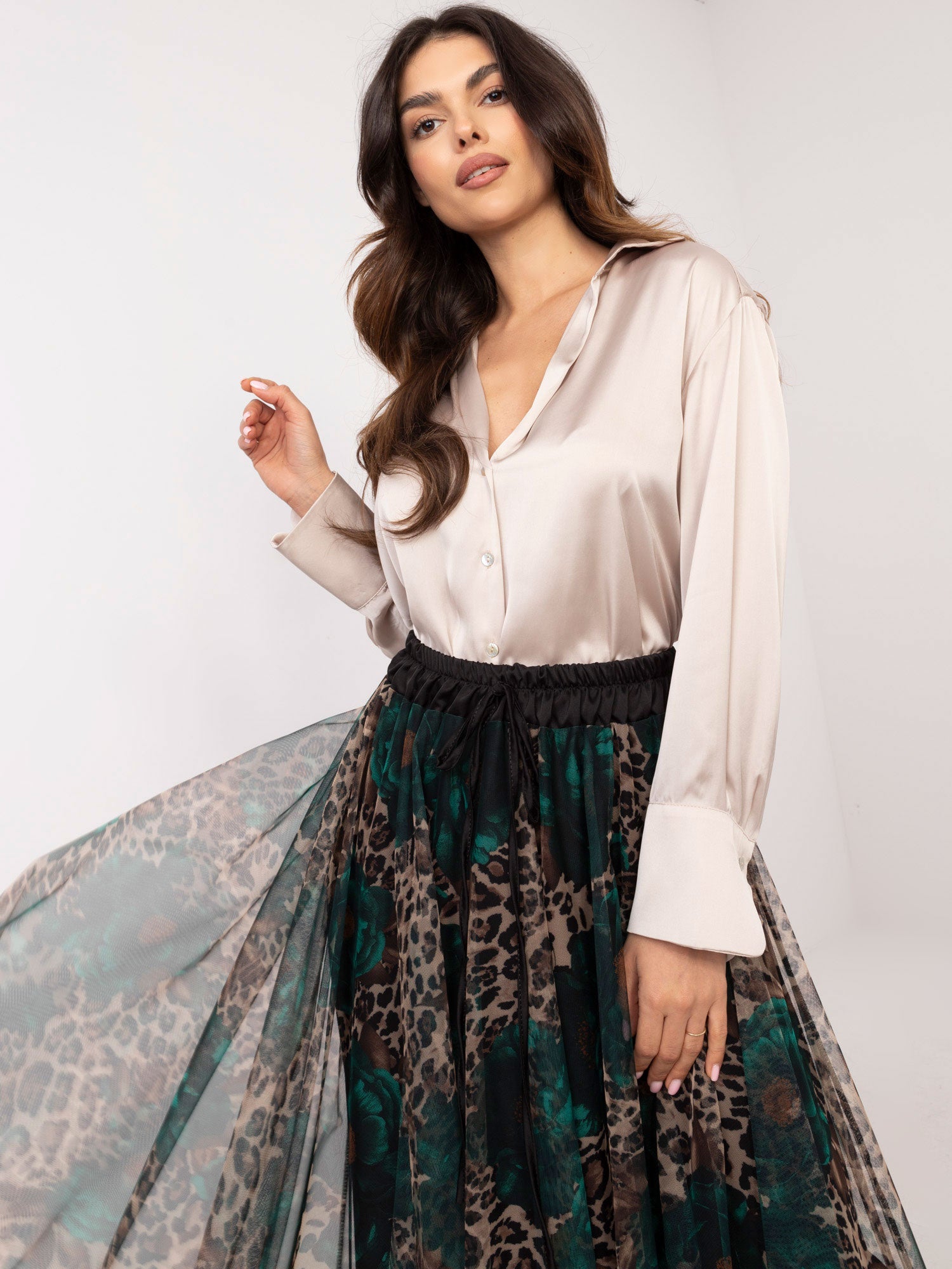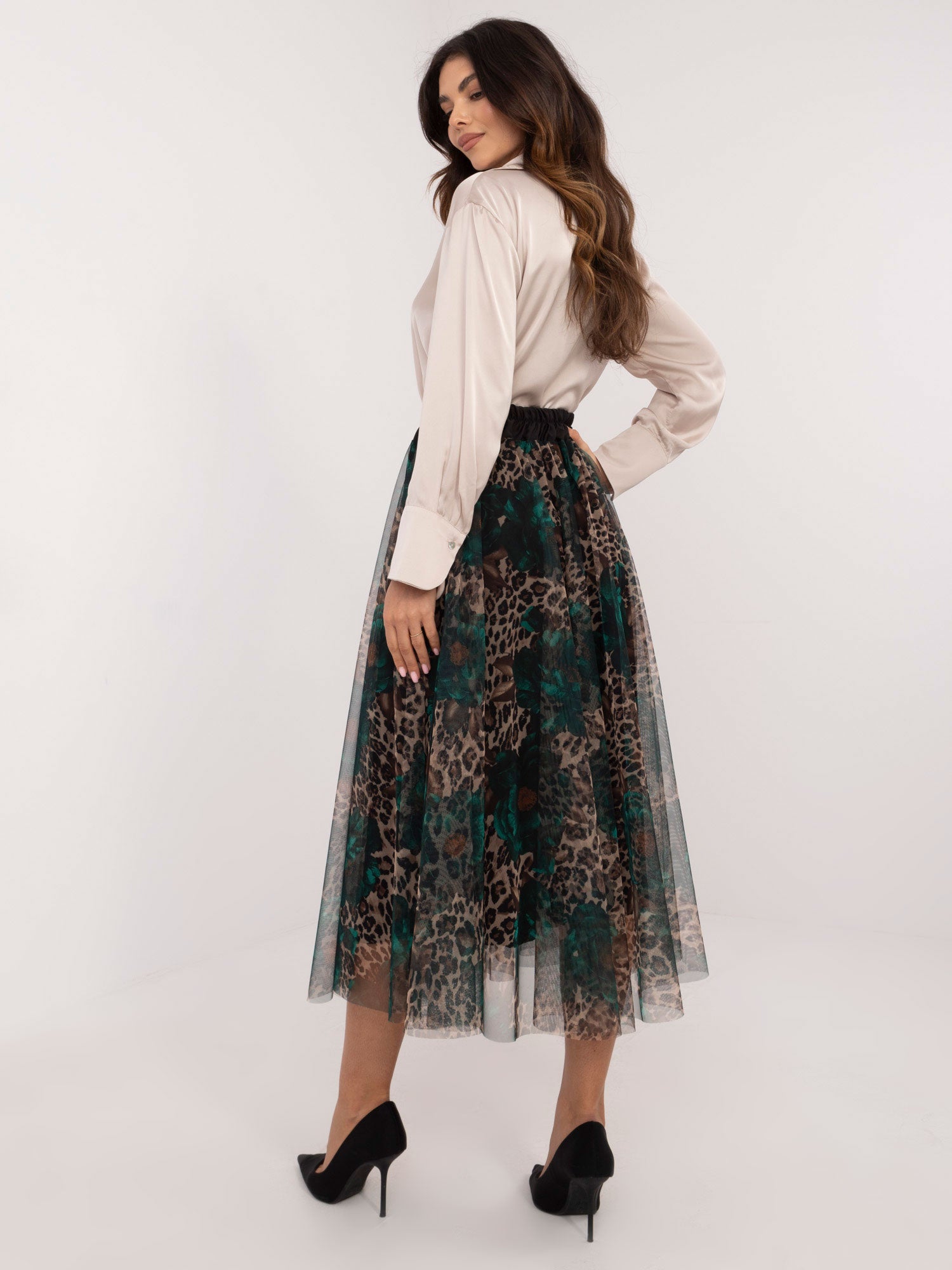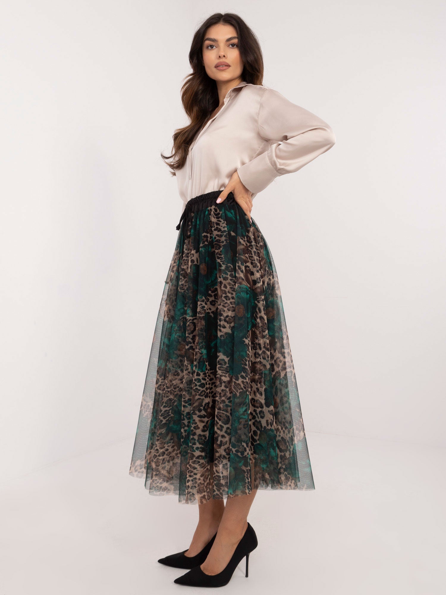 Wymiary spódnicy w rozmiarze one size mierzone: szerokość w pasie (na płasko) - 35 cm, szerokość w pasie (po rozciągnięciu) - 50 cm, długość całkowita - 93 cm.