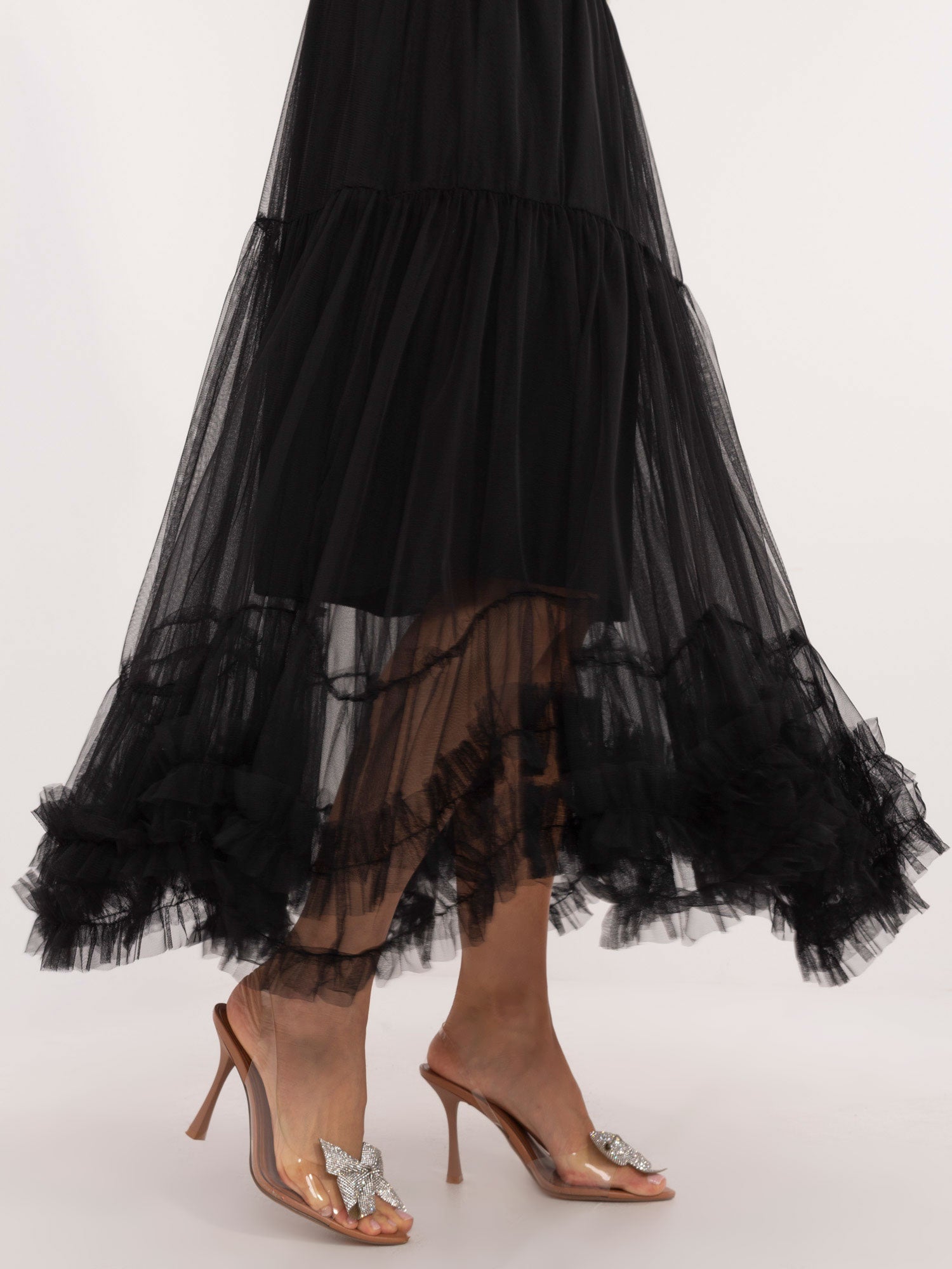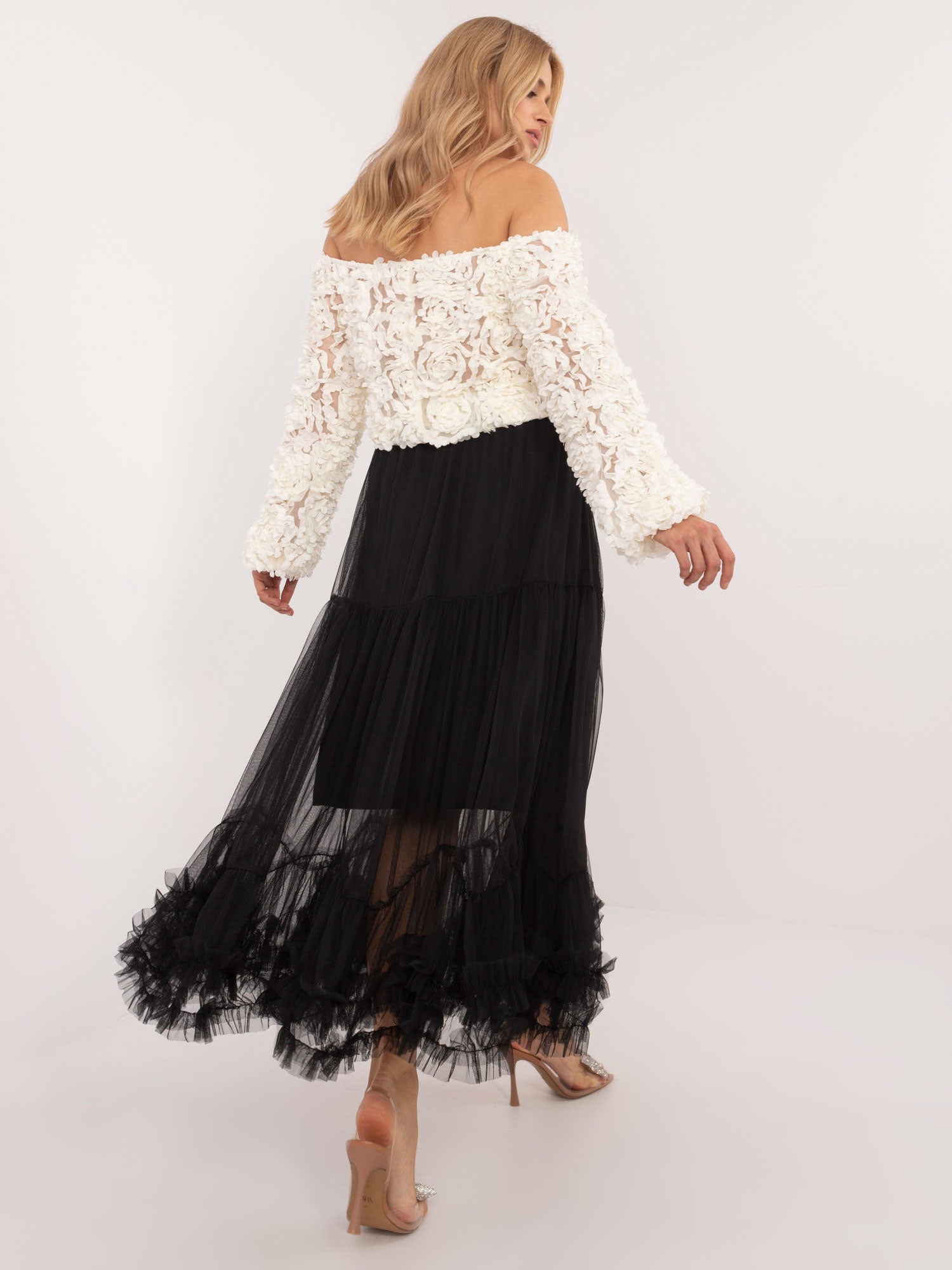 Wymiary spódnicy w rozmiarze one size: szerokość w pasie (na płasko) - 32 cm, szerokość w pasie (po rozciągnięciu) - 42 cm, długość całkowita - 90 cm.