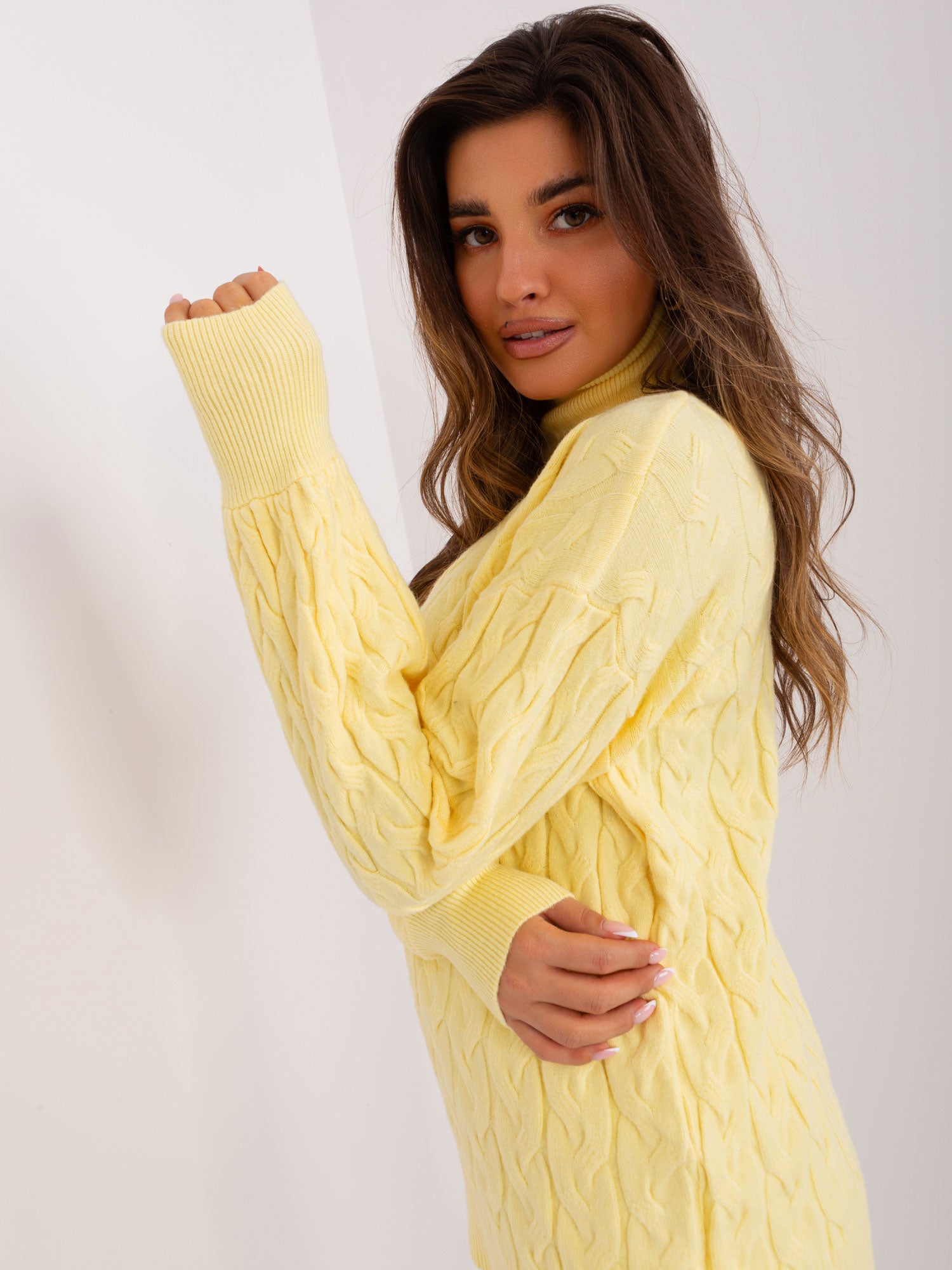 Jasnożółty luźny sweter z golfem z warkoczami.