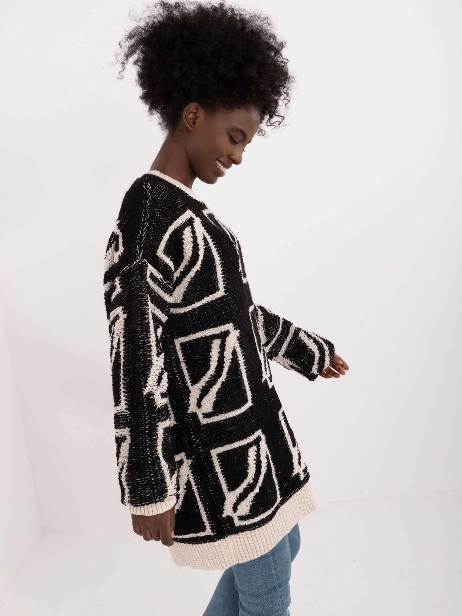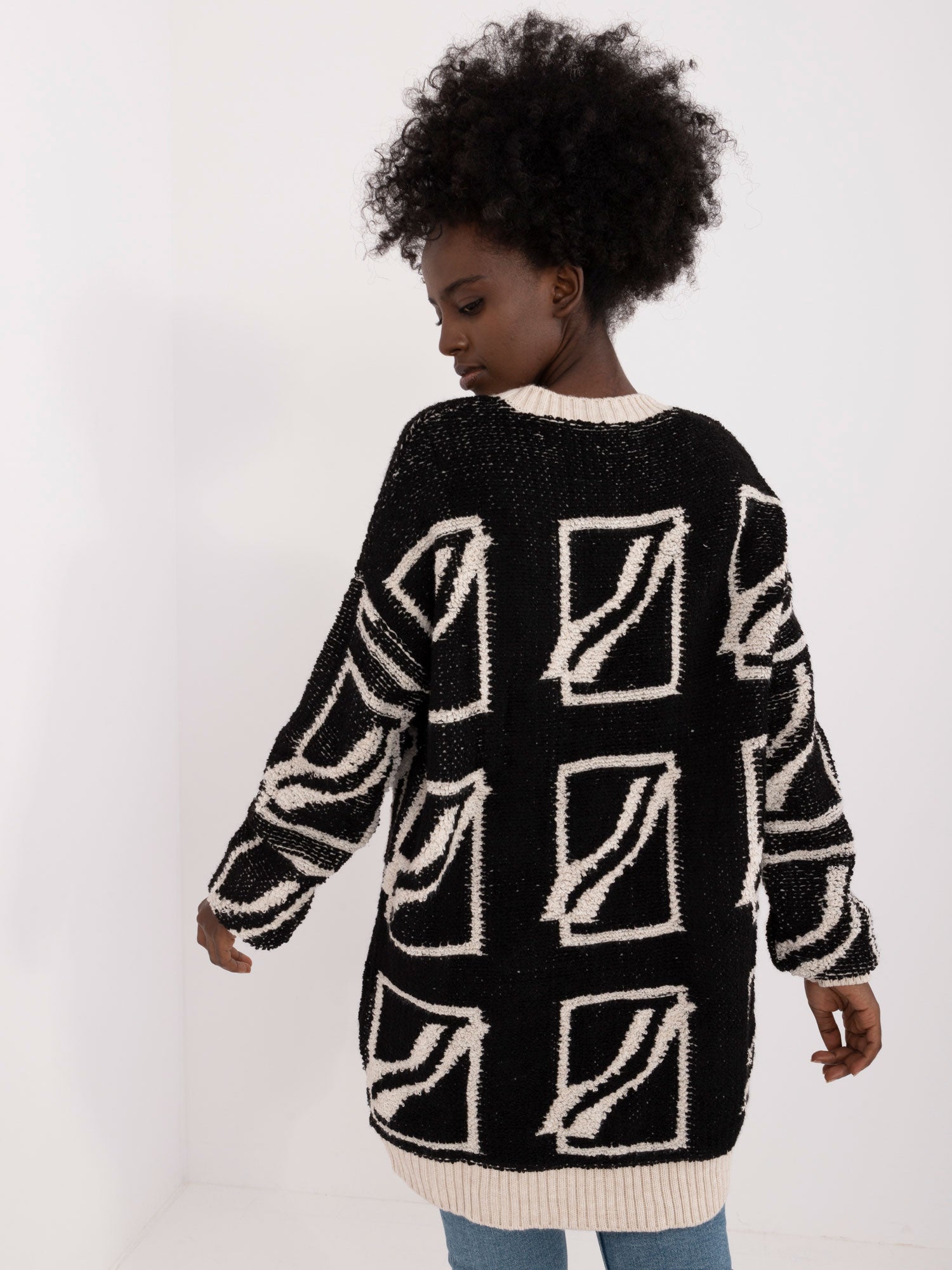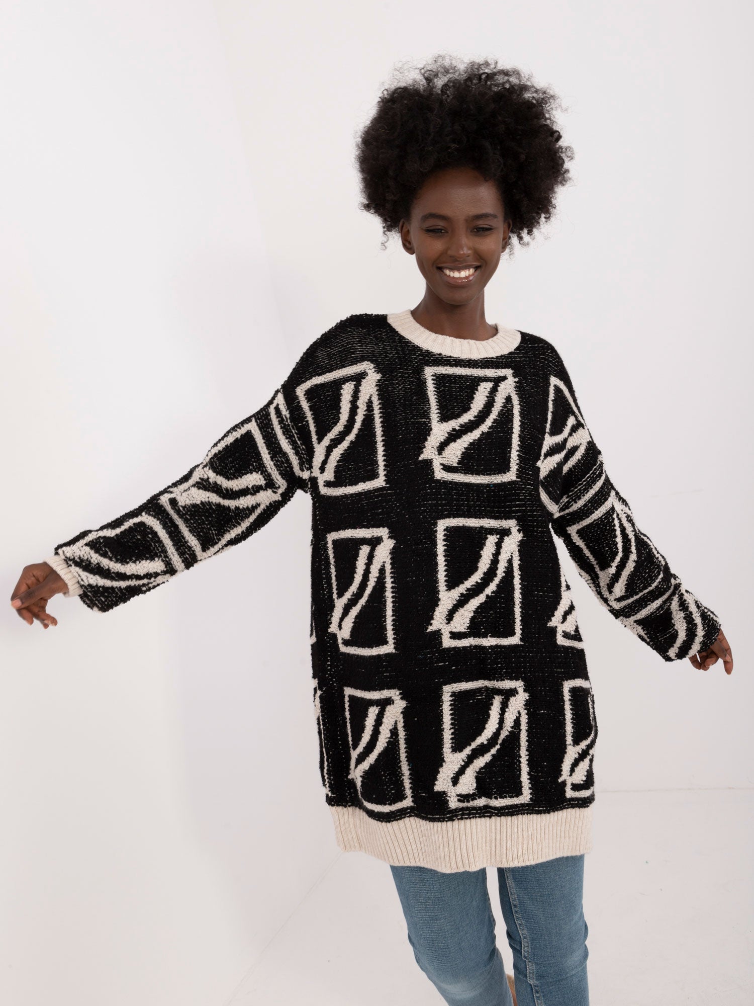 Wymiary swetra w rozmiarze one size mierzone na płasko: szerokość swetra pod pachami - 58 cm, długość swetra - 82 cm, długość rękawa - 71 cm