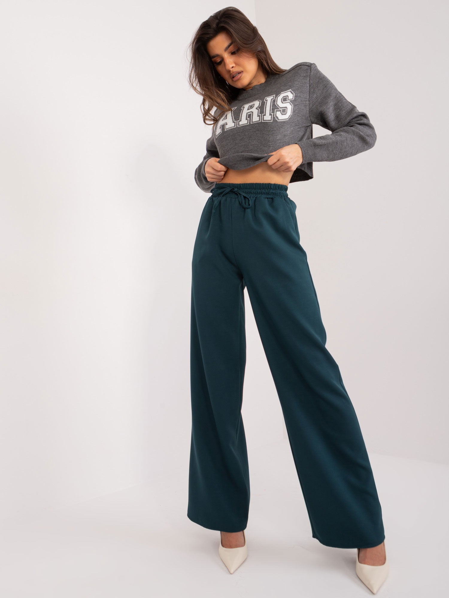 Modelka ma na sobie rozmiar one size. Wymiary modelki: wzrost 173 cm, biust 89 cm, talia 65 cm, biodra 91 cm.