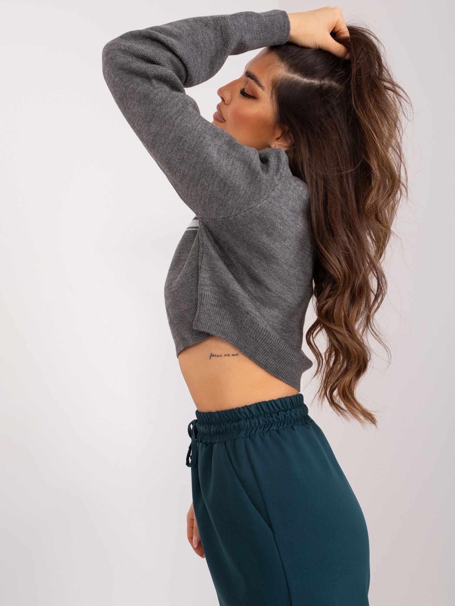 Wymiary swetra w rozmiarze one size mierzone na płasko: szerokość pod pachami - 58 cm, długość rękawa - 66 cm, długość całkowita - 38 cm.