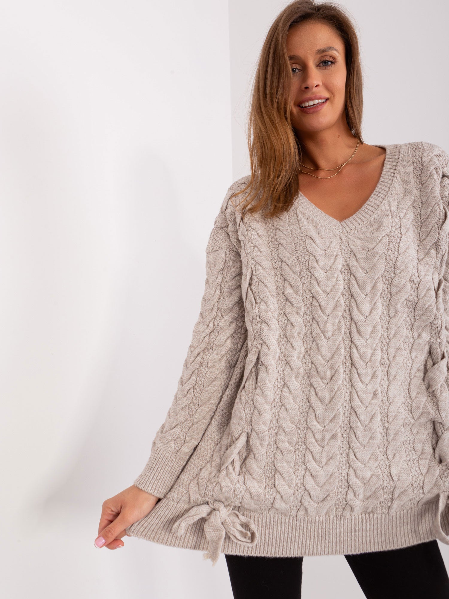 Wymiary swetra w rozmiarze one size mierzone na płasko: szerokość pod pachami - 75 cm, długość rękawa - 64 cm, długość całkowita - 81 cm.
